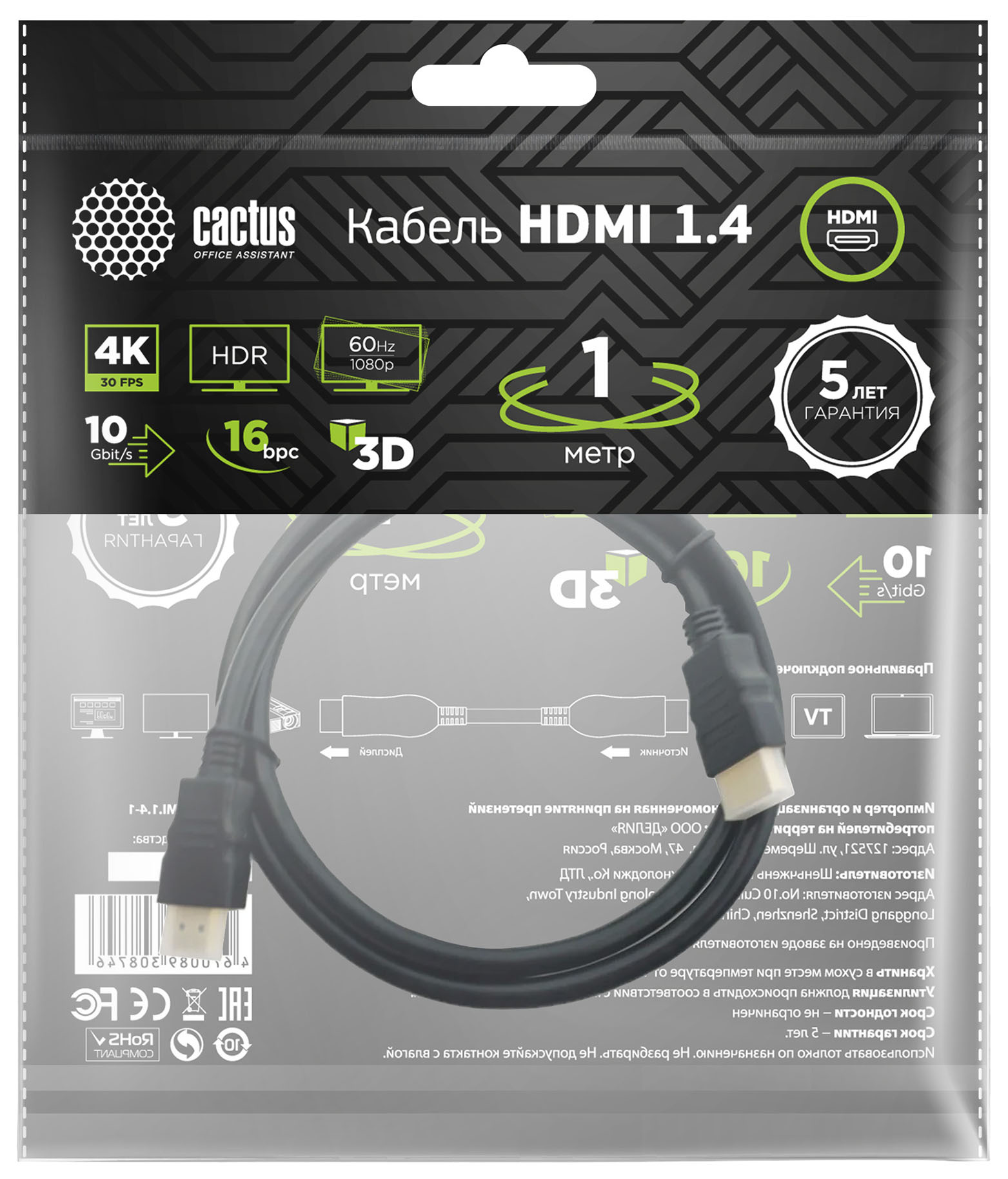 Кабель аудио-видео Cactus CS-HDMI.1.4-1 HDMI (m)/HDMI (m) 1м. Позолоченные контакты черный