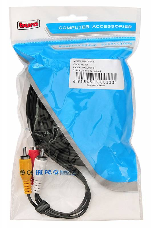 Тип: Кабель соединительный Функциональный тип: аудио-видео Бренд: BURO PartNumber/Артикул Производителя: BAAC027-5 Разъем №1: 3хRCA (m) Разъем №2: 3хRCA (m) Длина кабеля: 5 м Цвет: черный Описание: Тройной кабель RCA для передачи аудио и видеосигнала от DVD плеера или видеомагнитофона к телевизору или проектору. Вес упаковки (ед): 0.137 кг