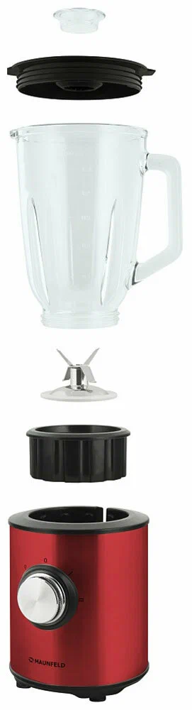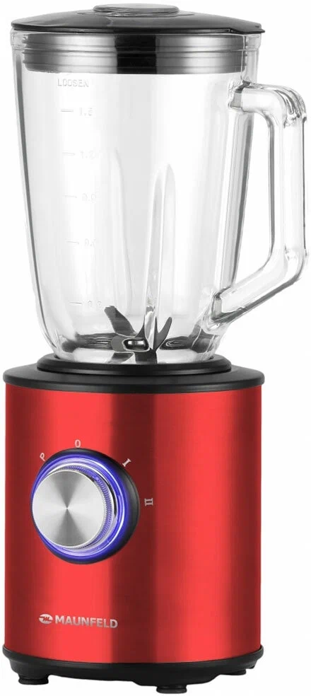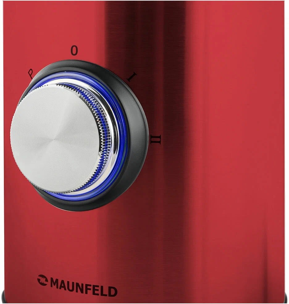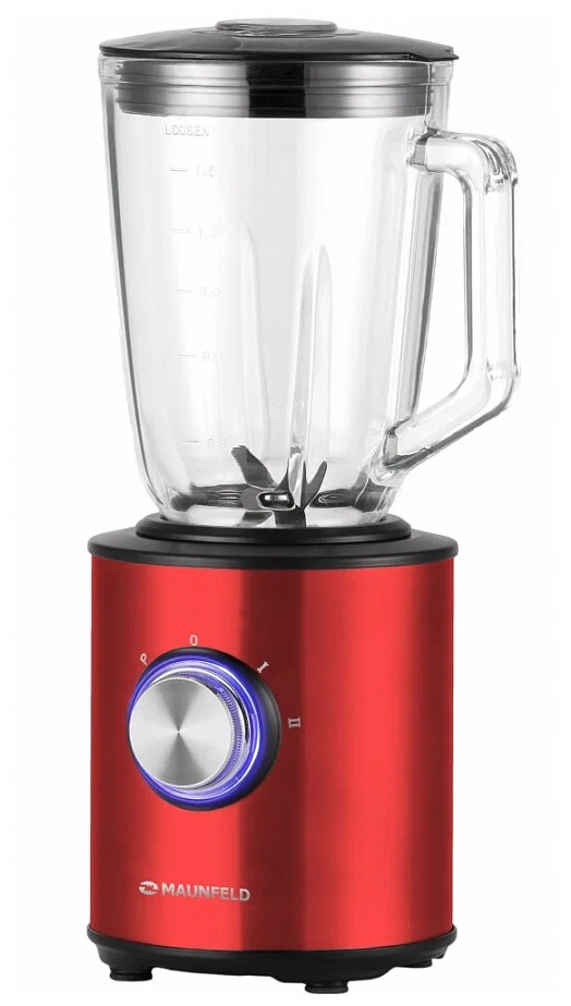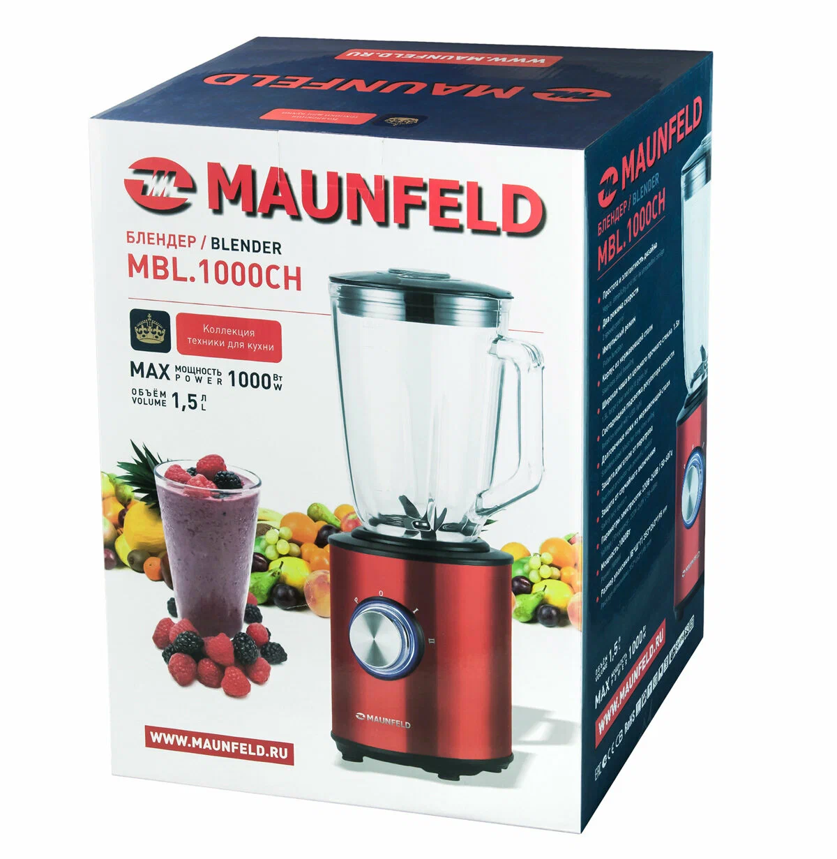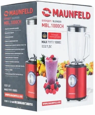 Maunfeld MBL.1000CH — это стационарный блендер насыщенного вишнёвого цвета со стеклянной чашей объёмом 1,5 литра. Корпус выполнен из нержавеющей стали. Модель имеет две скорости и импульсный режим работы. Под регулятором скорости встроена синяя подсветка. Предусмотрена защита от случайного включения и защита двигателя от перегрева.
