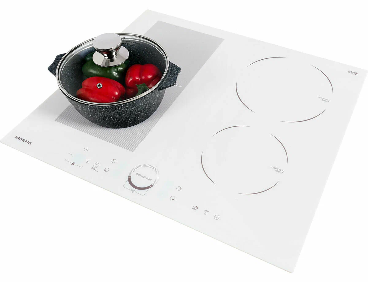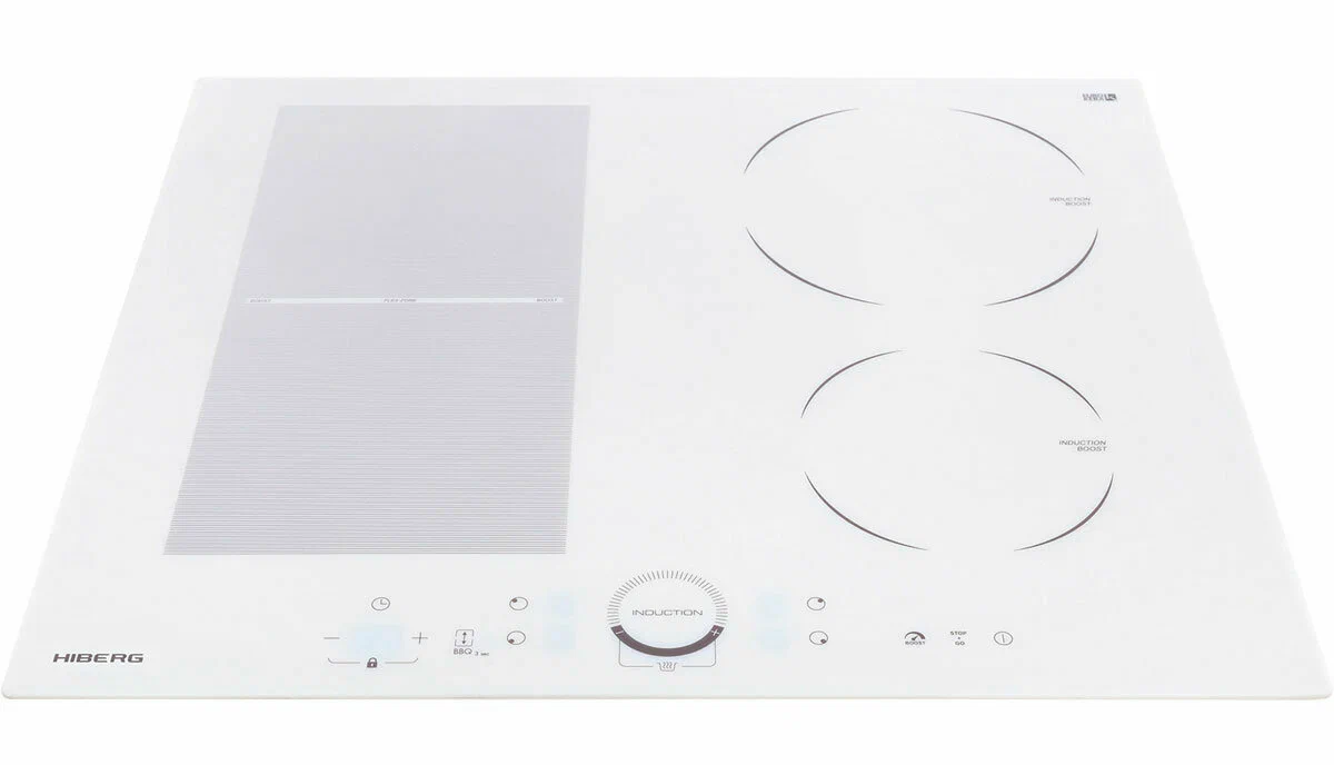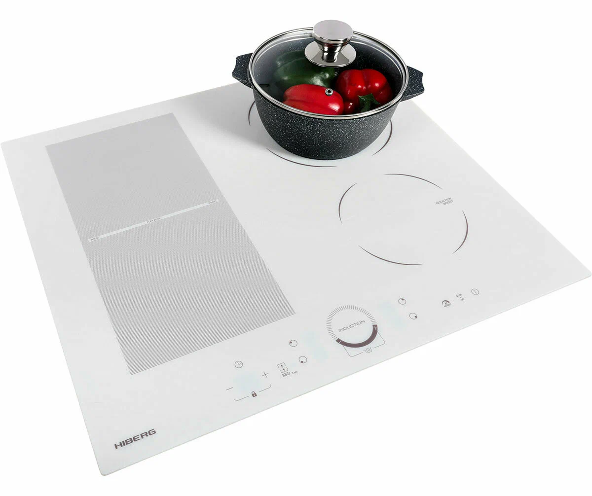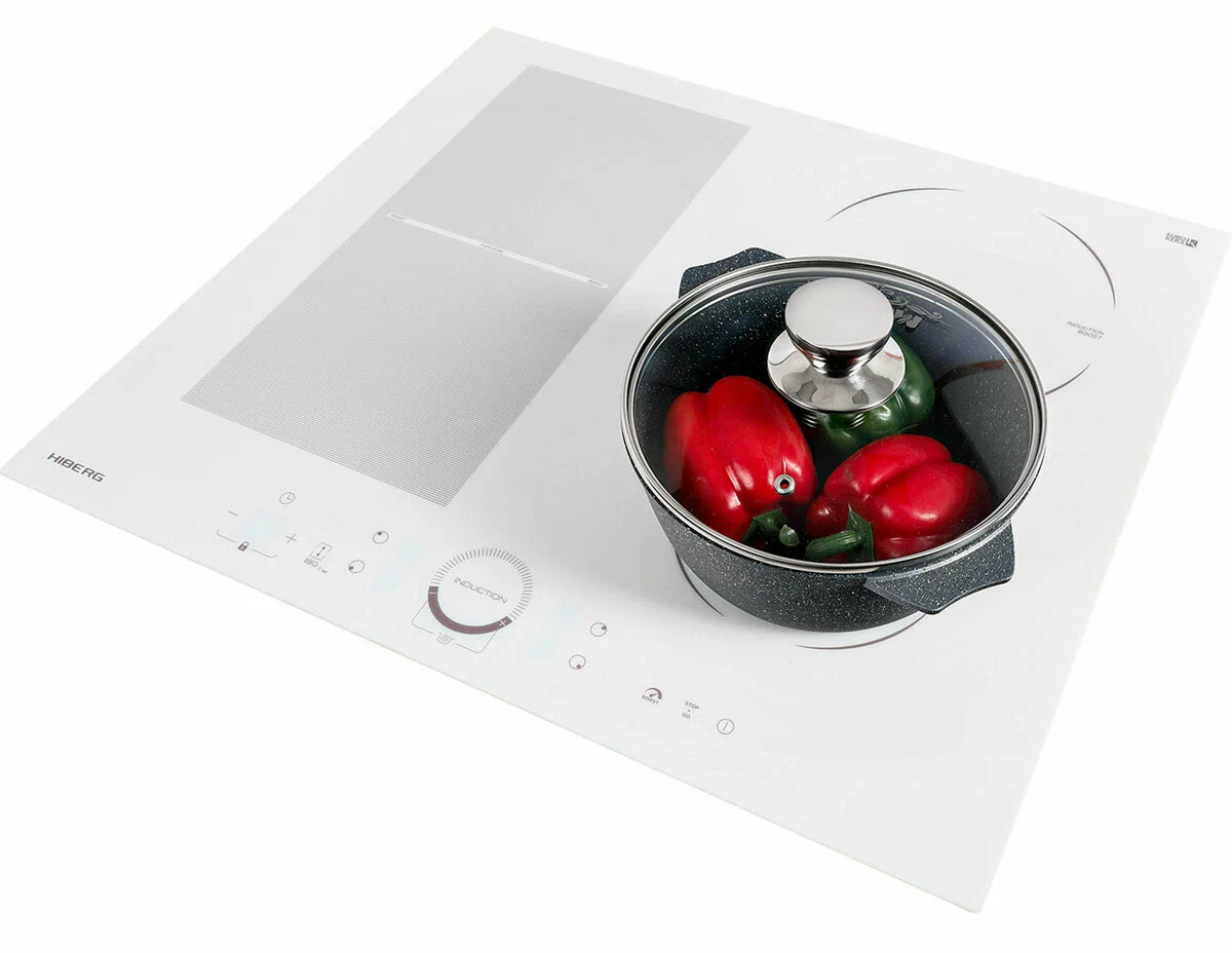 Встраиваемая индукционная варочная поверхность HIBERG i-MS 6049 W выполнена из французской стеклокерамики EUROKERA и оснащена 4 конфорками с сенсорным слайдерным управлением. Индукционный нагрев экономит время пользователя и электроэнергию.Материал рабочей поверхности в красивом белом цвете имеет высокий КПД теплопередачи, механическую прочность, направленную теплопроводность и способность противостоять локальным перепадам температур. Покрытие из стеклокерамики легкое в уходе и очистке.С помощью сенсорного слайдерного управления можно установить индивидуальный таймер и оптимальную мощность нагрева из 9 возможных для каждой конфорки. Слайдерное управление - современное и удобное решение, достаточно провести пальцем по шкале мощности.Если вы знаете оптимальное время приготовления блюда - установите таймер с диапазоном от 1 до 99 минут, по истечении заданного времени варочная панель отключится автоматически. Таймер можно установить, как на отключение зоны нагрева, так и для напоминания о том, что готовится блюдо.Функции:Функция Boost ускоряет нагрев и уменьшает время готовки. С мгновенным увеличением подачи мощности на одну конфорку можно за 5 минут вскипятить воду или молоко, приготовить блюда, требующие быстрой обжарки.Функция «Stop & Go» или функция паузы позволяет возобновить готовку. После отмены паузы приготовление вернется на те же настройки, какие использовались до остановки.С функцией автораспознавания посуды варочная поверхность включится и начнет работу, если на конфорку поставить кастрюлю или сковороду, подходящую для индукционных плит.Возможность объединения зон нагрева позволит поставить посуду нестандартных размеров или сразу несколько небольших кастрюль и сковород.Функция «Подогрев» позволит поддержать температуру только приготовленного завтрака или ужина без затрат на электроэнергию.Индикатор остаточного тепла предупреждает о том, что поверхность еще не остыла.Автоматическое отключение конфорки сработает, если время приготовления превышает заданный лимит времени, прольется жидкость или температура на поверхности повысится выше заданной отметки. Также нагрев блокируется, если поверхность остается пустой несколько секунд или посуда слишком маленькая.Функция «Замок от детей» исключает возможность случайного включения поверхности детьми.Общие данные:Габариты: 5.2x59x52 смГабариты ниши для встраивания: -х56х49 смРабочий стол: стеклокерамикаКоличество конфорок: 4 индукционныеЗоны расширения: 1 объединяемая зонаУправление:Управление: СлайдерноеКоличество уровней мощности: 9Таймер: на 99 минутФункция "Boost" (увеличение мощности)Сенсор распознавания посудыАвтоотключениеЗащита от переливаЗамок от детейДополнительная информация:Мощность: 7 000 ВтВес: 9.6 кг