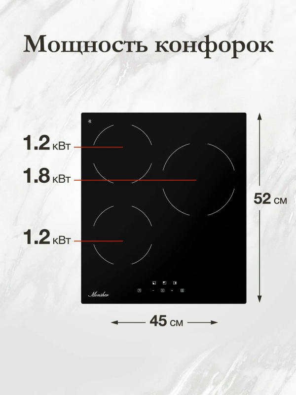 Размеры варочной поверхности составляют 52*450*520 мм, что позволяет легко интегрировать ее в кухонную мебель.
