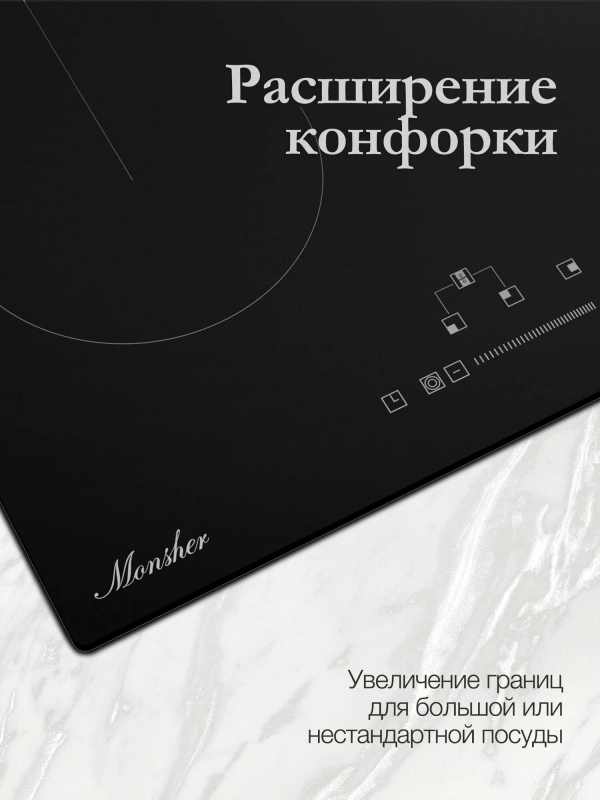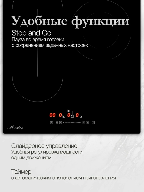 Электрическая варочная панель Monsher MHE 45 - это современное и функциональное решение для вашей кухни.Панель оснащена тремя электрическими конфорками, которые обеспечивают быстрый и равномерный нагрев. Максимальная потребляемая мощность составляет 4,2 кВт, что позволяет готовить несколько блюд одновременно без потери качества и скорости нагрева.Материал рабочей поверхности - стеклокерамика, которая отличается высокой прочностью и легкостью в уходе. Черный цвет панели придает ей стильный и современный вид, который будет гармонично сочетаться с любым интерьером кухни.Безопасность использования обеспечивается благодаря индикаторам остаточного тепла, которые предупреждают о том, что поверхность еще горячая и не стоит прикасаться к ней.Панель оснащена электронным таймером, который позволяет запрограммировать время приготовления блюда и автоматически выключит конфорку по истечении заданного времени.Управление панелью осуществляется с помощью сенсорных переключателей, что делает процесс приготовления еще более удобным и простым. Расположение панели управления - спереди, что обеспечивает быстрый доступ к функциям и настройкам.Размеры панели составляют 450*520*52 мм, что позволяет легко интегрировать ее в любой кухонный гарнитур. Размеры ниши для встраивания панели составляют 420х490 мм, что обеспечивает удобство установки и совместимость с большинством столешниц.В комплект поставки входит скребок для очистки поверхности от остатков пищи, что делает использование панели еще более комфортным и удобным.