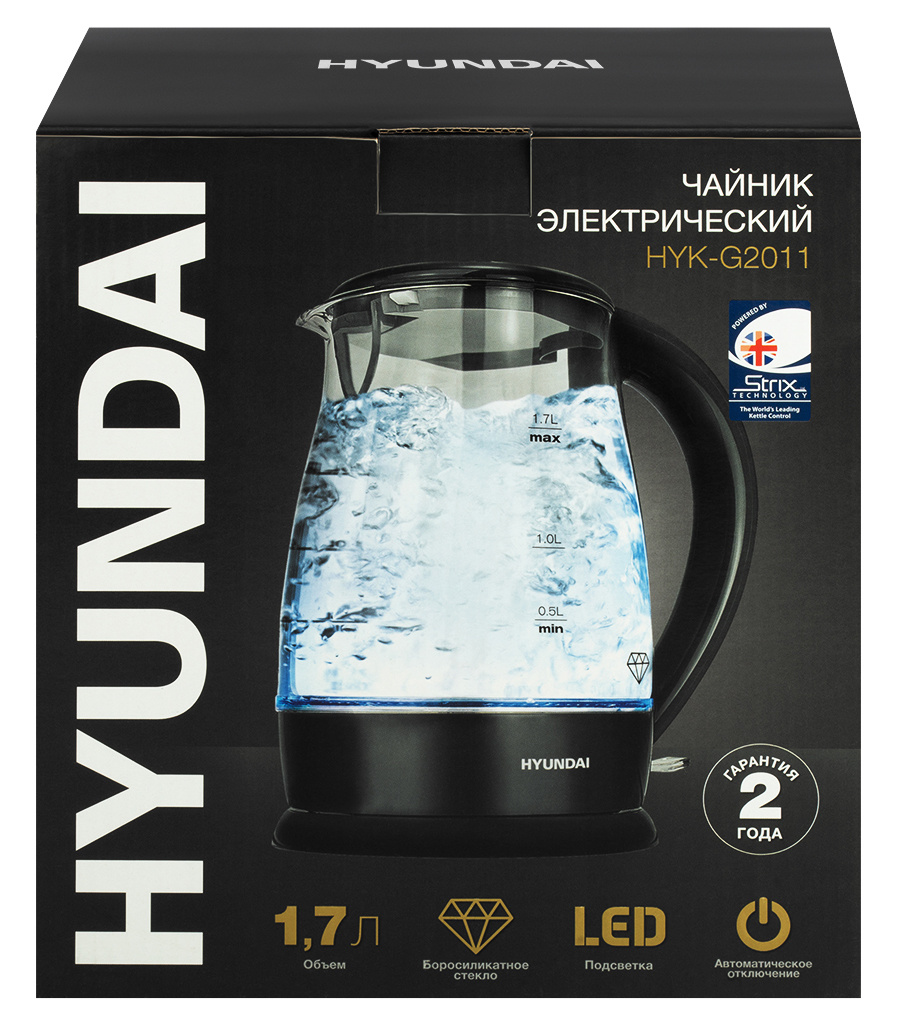 Электрочайник Hyundai HYK-G2011 отличается практичностью и доступностью. Прозрачная тонкостенная колба высокопрочная и термостойкая. Своими поразительными потребительскими качествами она обязана боросиликатному стеклу, сохраняющему первозданную прозрачность на протяжении всего времени использования. Приготовленный кипяток никогда не пахнет пластиком, у него отсутствует и посторонний привкус. Яркие голубые светодиоды подсветки превращают обыденное кипячение в увлекательное действие, нравящееся не только детям, но и их родителям. При закипании чайник мало шумит, лишь щелчок отключившейся кнопки напомнит о нем.