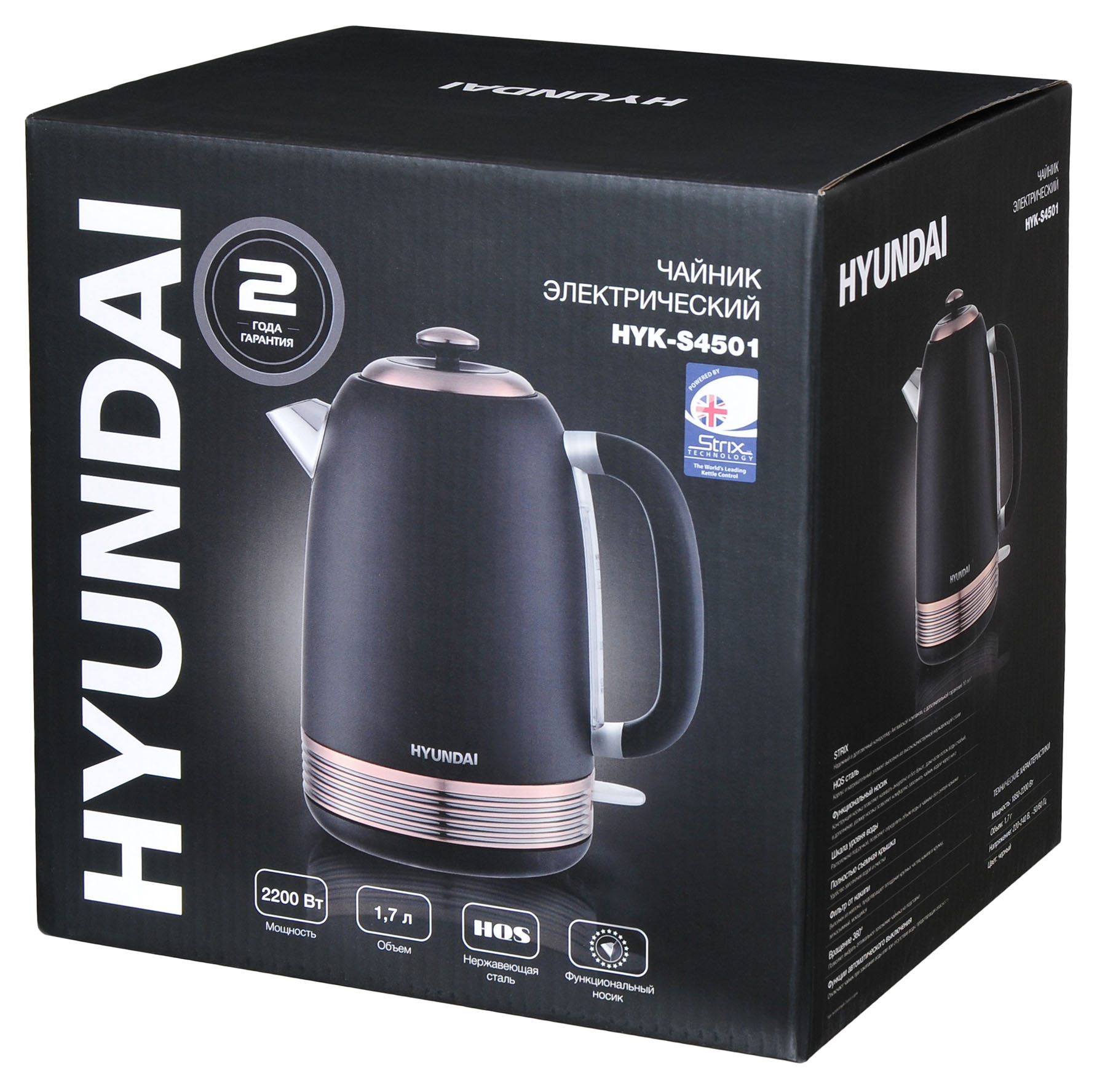Модель электрического чайника Hyundai HYK-S4501, выполненная в стилистике барокко, превратится в объект притяжения взоров на домашней и офисной кухне. Черные матовые поверхности изящно дополняются вставками бронзового цвета. Резервуар для воды изготовлен из особой марки стального сплава, который обладает повышенной стойкостью к окислению, а также к коррозии. Используемая пластмасса отличается термостойкостью. Благодаря добротному исполнению и применению качественных материалов, красивый электрочайник прослужит долго. Фирменный контроллер защищает от коротких замыканий, включения без жидкости. Кипячение воды за считанные минуты обеспечивает мощность термоэлемента, равная 2,2 кВт.