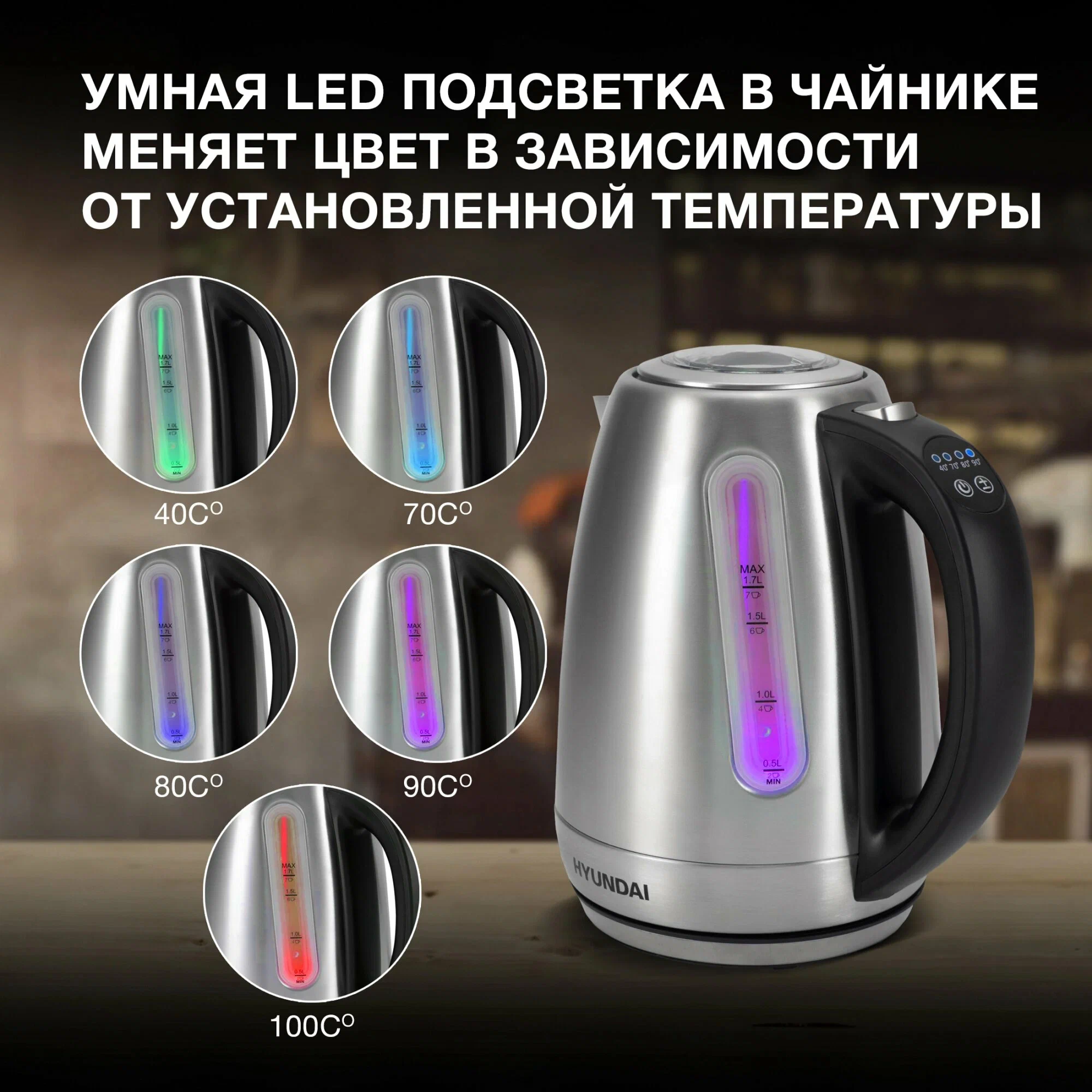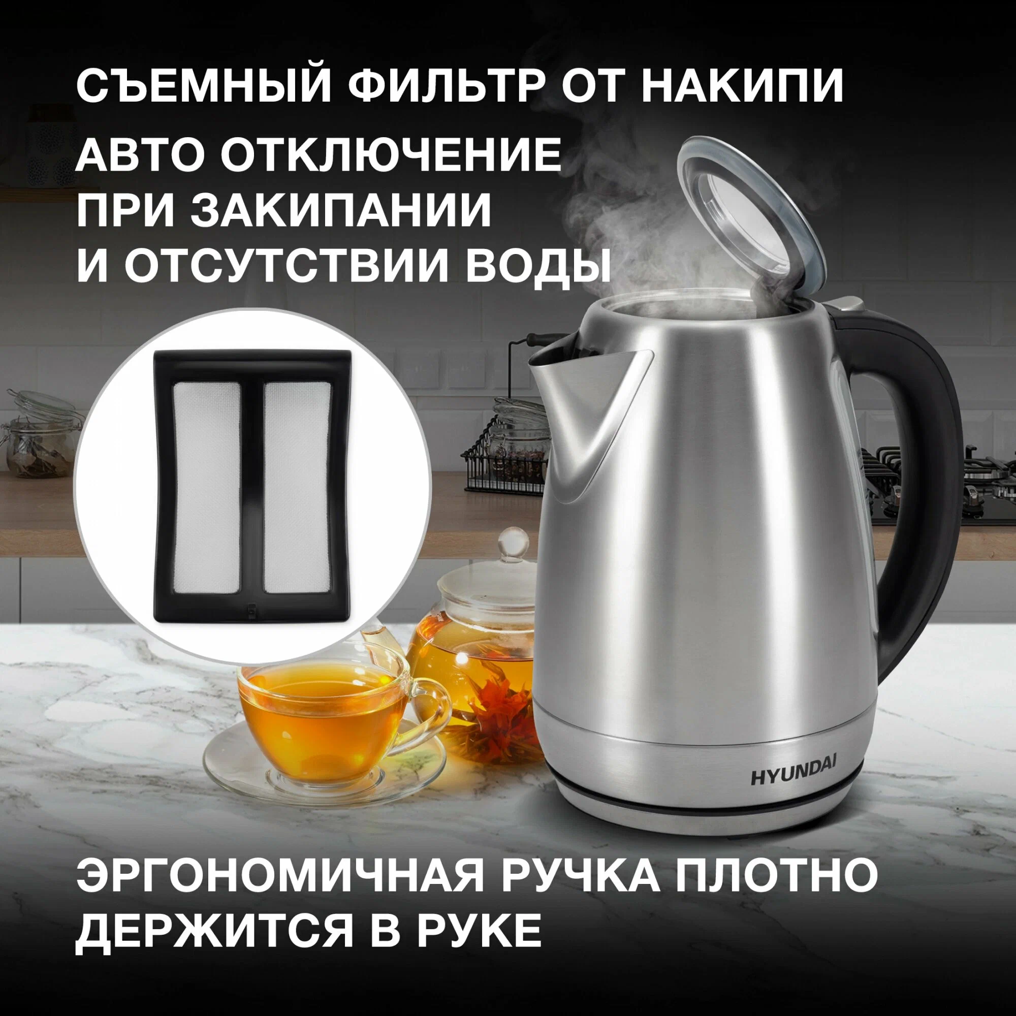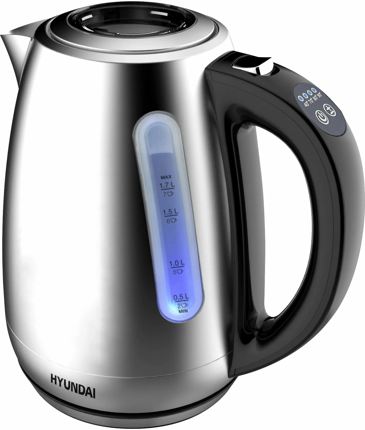 Электрический чайник Hyundai HYK-S8408 - современное и функциональное устройство для быстрого и удобного приготовления горячих напитков.Элегантный и современный дизайн: серебристый матовый цвет с черным корпусом из металла придает чайнику стильный и современный вид.Безопасность и надежность: чайник оснащен функциями автоотключения и защиты от включения без воды, что делает его использование безопасным и удобным.Скрытый нагревательный элемент: обеспечивает равномерное нагревание воды и предотвращает образование накипи, продлевая срок службы чайника.Выбор температуры: позволяет приготовить напиток нужной температуры, будь то горячий чай или кофе.Подсветка на корпусе: делает использование чайника еще более удобным и приятным.В целом, электрический чайник Hyundai HYK-S8408 - надежный, стильный и функциональный помощник на вашей кухне, который обеспечит быстрое и качественное приготовление горячих напитков.
