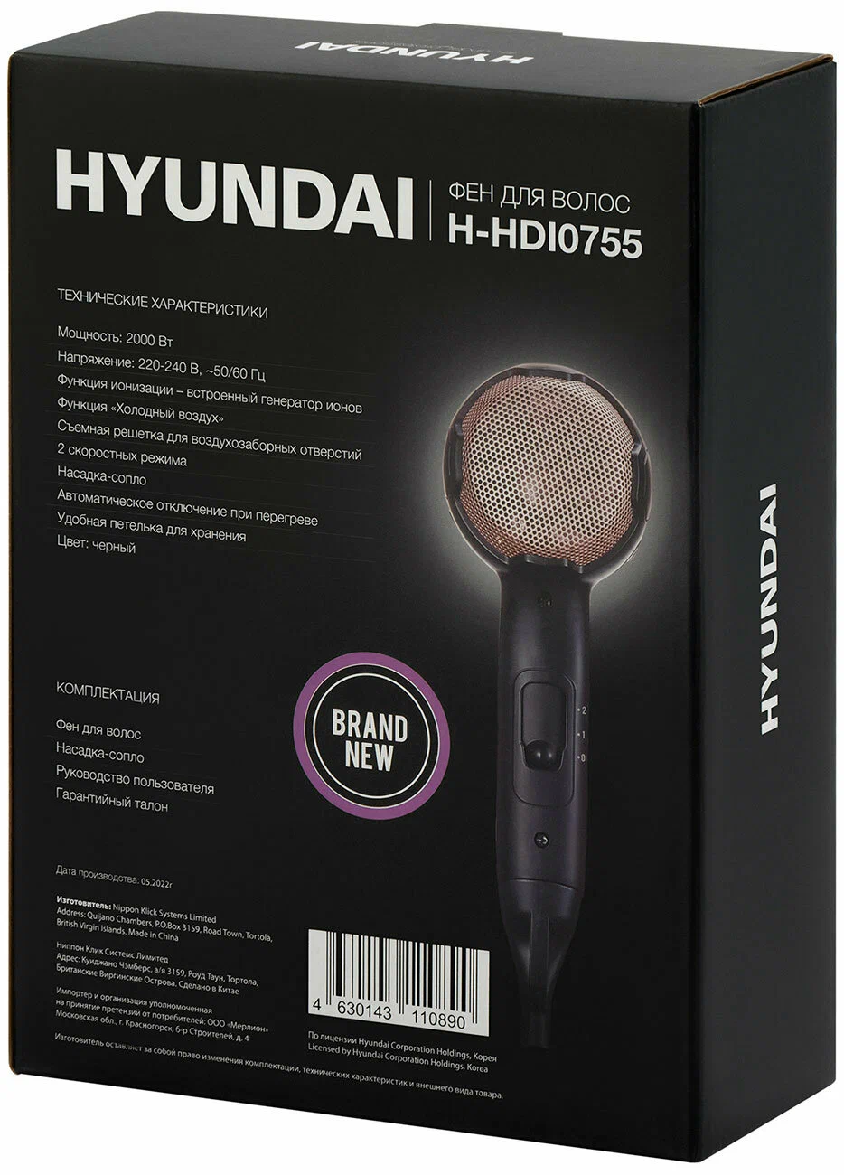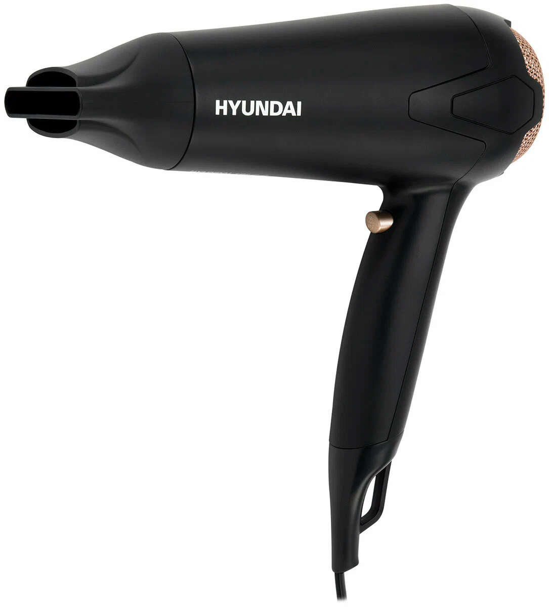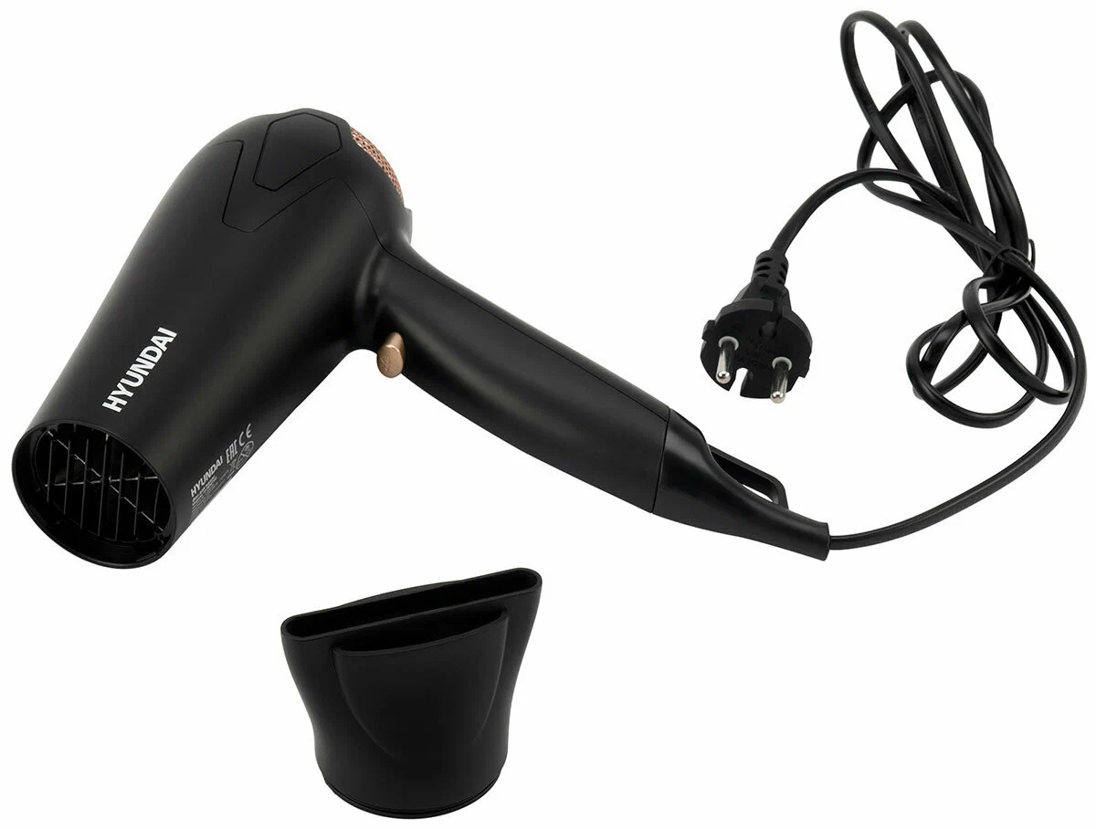 Задняя защитная решётка фена для удобства снимается. Шнур питания данной модели защищен от перекручивания, а у его основания расположена петля для подвешивания в вертикальном положении. Длина провода составляет 1,8 м, поэтому Hyundai H-HDI0755 комфортно пользоваться даже на удалении от розетки. А благодаря скромным габаритным размерам и небольшому весу данную модель можно брать с собой в командировки и длительные путешествия в качестве дорожного фена.