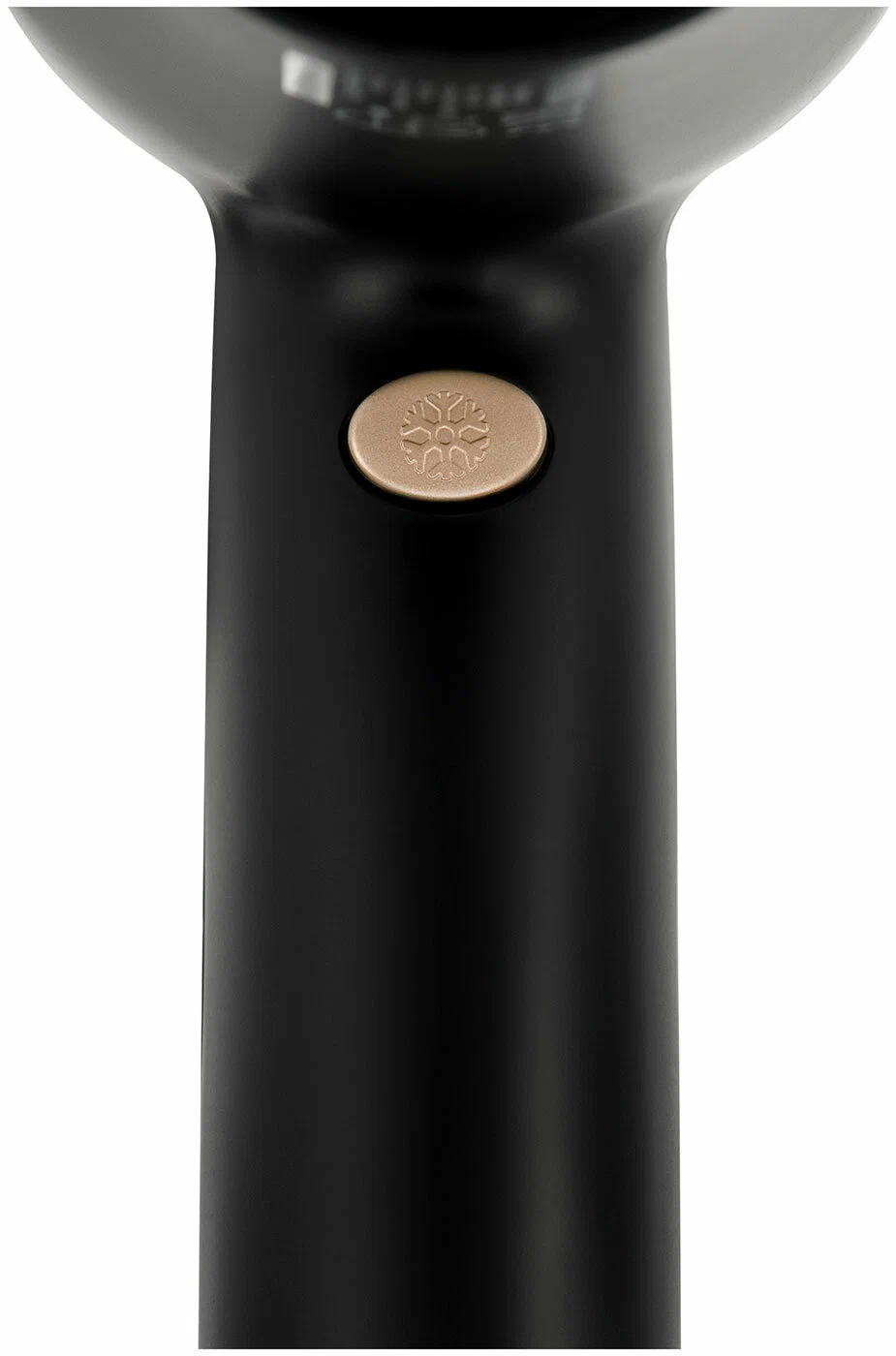 Фен работает на 2000 Вт мощности, для удобства в нём предусмотрено три температурных режима. Также у прибора есть регулировка скорости подачи воздуха, которая разбита на два возможных варианта. Всё это сделано для того, чтобы волосы не портились от жёсткой сушки. Для этой же цели данная модель оснащена подачей холодного воздуха. При перегреве устройство автоматически отключается – эта особенность защищает его от выхода из строя.