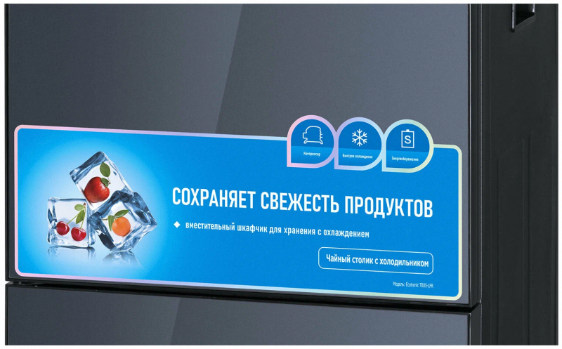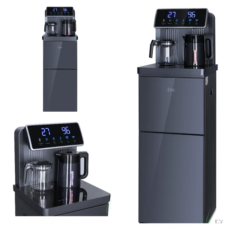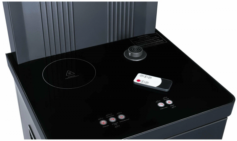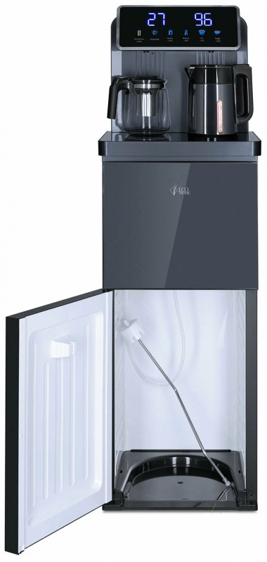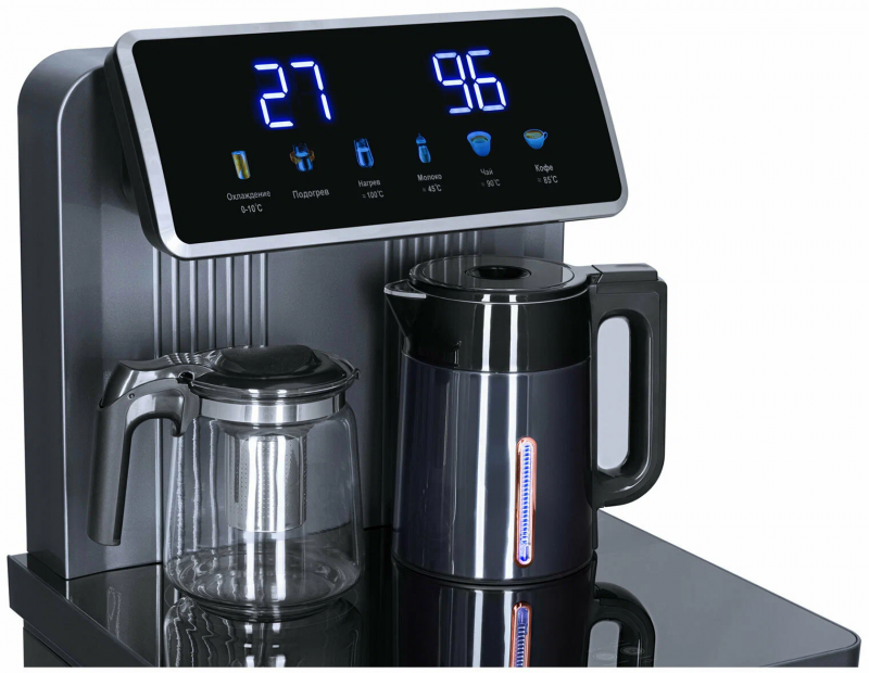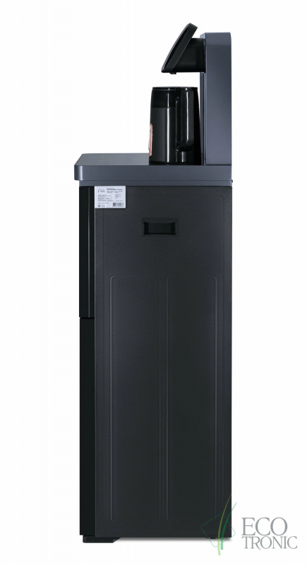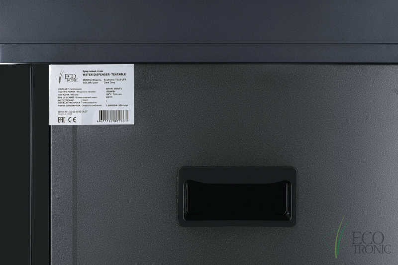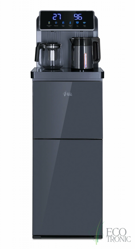 Тиабар Ecotronic TB35-LFR - это напольный кулер с чайным столиком без охлаждения и холодильным шкафчиком. Основные функции: нагрев, подача воды комнатной температуры, холодильный шкафчик. Нагрев воды в чайнике до 100°С.Большая и удобная панель управления с возможностью задать температуру нагрева (4 режима нагрева). Пульт дистанционного управления. Нижняя загрузка бутыли. Два чайника - для кипячения и заварочный. Чайник кипячения внутри выполнен из цельнотянутой нержавеющей стали, а снаружи имеет индикацию при нагревании.В верхней части корпуса есть шкафчик-холодильник для хранения скоропортящихся продуктов.С пульта дистанционного управления можно управлять аппаратом как на удаленном расстоянии до 7 метров, так и с помощью сенсорной панели управления на русском языке на столешнице. Верхняя часть представляет собой стойку с двумя кранами направленного типа, совмещенную с панелью индикации и управления.Четыре режима нагрева воды позволят задавать нужную температуру:Молоко (~45°С, подходит для приготовления молочных смесей),Кофе (~85°С, подходит для заваривания кофе),Чай (~90°С, оптимально подходит для заваривания чая),Нагрев (~100°С).Дополнительно функция регулировки температуры воды позволяет задавать нужную температуру воды в чайнике для кипячения в диапазоне от 45°С до 100°С.Функция энергосбережения включается через 50 секунд, если аппарат не используется.Функция регулировки времени подачи воды - возможность задать время подачи воды от 18 до 80 сек.Функция регулировки времени отключения подогрева заварочного чайника позволяет задавать режим постоянного подогрева чайника на 1-24 часа.Защита чайника от перегрева - в чайнике установлен датчик низкого уровня воды, при срабатывании которого нагрев отключается.Защита от перелива воды в чайник - в чайнике установлен датчик высокого уровня воды, предотвращающий перелив при наборе с крана.Чайник кипячения с синей подсветкой, изотермический - меньше греется, лучше сохраняет температуру. Подача воды в него возможна без открытия крышки. Правый кран подает воду непосредственно в чайник, левый кран - для подачи воды комнатной температуры из бутыли. Нагрев воды в чайнике включается вручную.Основной цвет темно-серый, черные боковые панели, поверхность чайного столика черная.Технические характеристики:Тип конструкции: столик с вертикальюОсновные функции: нагревРежимы нагрева: выбор температуры нагреваТип охлаждения: компрессорноеКранов подачи воды: дваПоверхность столика: глянцеваяХолодильный шкафчикДистанционное управление: естьЧайники: чайник кипячения и заварочныйЧайник кипячения/защита: защита включения без водыЧайник кипячения/подсветка: подсветка во время кипяченияШкафчик: для хранения (10-15 л)Загрузка бутыли: без выкатной полкиЦвет основной: серебристыйЦвет боковых панелей: чёрныйНапряжение: 220-230В / 50-60ГцГабариты без упаковки (ВxШxГ): 131.5x42x41 см