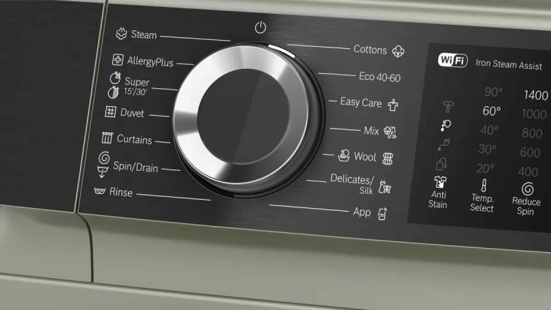 Загрузка белья до 9 кг и максимальная скорость отжима 1400 оборотов в минуту обеспечивают эффективное и бережное удаление загрязнений с различных типов тканей.