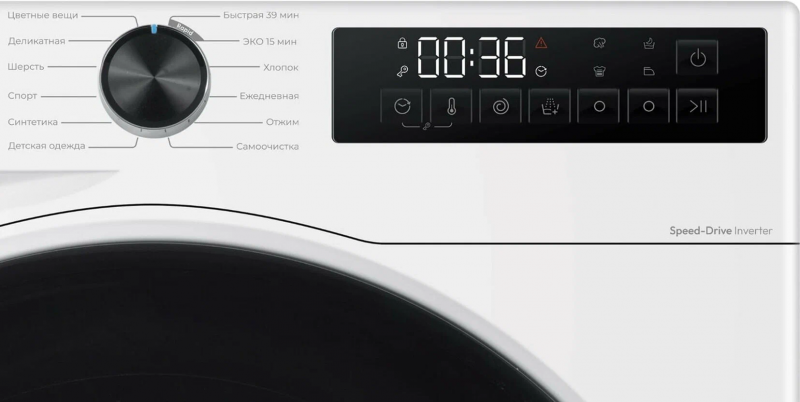 Эта модель оснащена бесщёточным инверторным мотором Speed-Drive, обеспечивающим минимальный уровень шума. Понятная индикация на LED дисплее упрощают выбор программы и контроль оставшегося времени. А тихий «Ночной режим» с отжимом 800 об/мин обеспечивает бесшумную стирку, при этом предотвращает образование складок, периодически переворачивая белье в барабане.