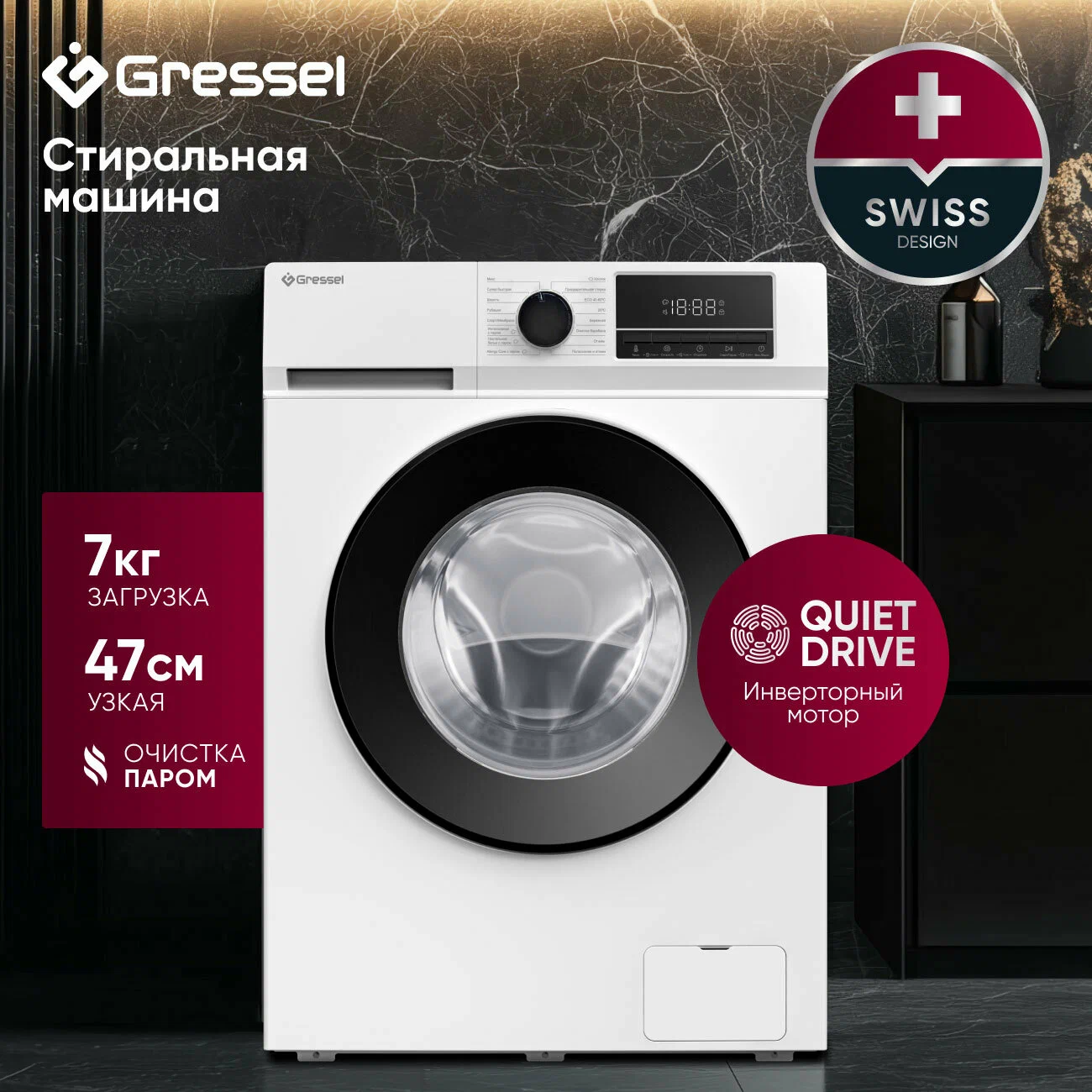 Стиральная машина Gressel UWC70177 (7 кг) с инверторным мотором QuietDrive и функцией параПознакомьтесь с ультрасовременной стиральной машиной Gressel UWC70177, которая сочетает в себе передовые технологии и компактный дизайн для максимальной эффективности и удобства. Эта узкая модель шириной всего 47 см идеально подходит для небольших пространств, предлагая при этом вместительную загрузку до 7 кг.Инверторный мотор QuietDrive обеспечивает тихую и экономичную работу при отжиме на скорости до 1200 оборотов в минуту, значительно уменьшая вибрации и шум. Функция дозагрузки белья FlexiLoad позволяет добавлять забытые вещи в любой момент стирки, делая вашу рутину более гибкой и менее стрессовой.Специальный режим Allergy Care с использованием технологии очистки паром PureSteam глубоко проникает в ткани, эффективно удаляя до 99.9 бактерий и аллергенов, что делает эту машину идеальной для домов с аллергиками и маленькими детьми. Помимо этого, пар помогает снизить складки на одежде и устранять неприятные запахи.Машина оснащена 16 программами стирки, которые можно легко выбирать через сенсорное управление. Системы самодиагностики DiagnoseDirect, контроля дисбаланса EquiCheck и пенообразования FoamSense повышают уровень безопасности и продлевают срок службы устройства.Функция отложенного старта от 3 до 24 часов дает возможность настроить начало стирки на наиболее удобное время. Благодаря защите от детей, машина обеспечивает безопасность использования в доме с малышами.Выбор стиральной машины Gressel UWC70177 это выбор надежности, инновационных технологий и заботы о вашем здоровье и комфорте.Общие данные:Габариты: 85x59.5x47 смМаксимальная загрузка: 7 кгСкорость отжима: 1200 об/минКласс стирки: BКласс отжима: BПрограммы:Микс, супер быстрая, шерсть, рубашки, спорт/мембрана, интенсивная с паром, постельное белье с паром, Allergy Care с паром, хлопок, предварительная стирка, Эко 40-60С, 20С, бережная, очистка барабана, отжим, полоскание и отжимДополнительные функции:Дозагрузка бельяОтложенный старт от 3 до 24 часовУправление и индикация:ДисплейБезопасность:Защита от детейСистема самодиагностики DiagnoseDirectКонтроль дисбалансаКонтроль пенообразованияДополнительная информация:Инверторный моторУровень шума при стирке, дБ: 62Уровень шума при отжиме, дБ: 76