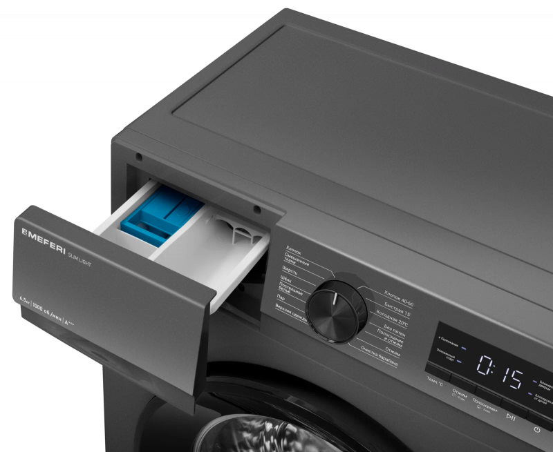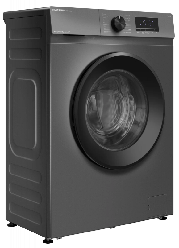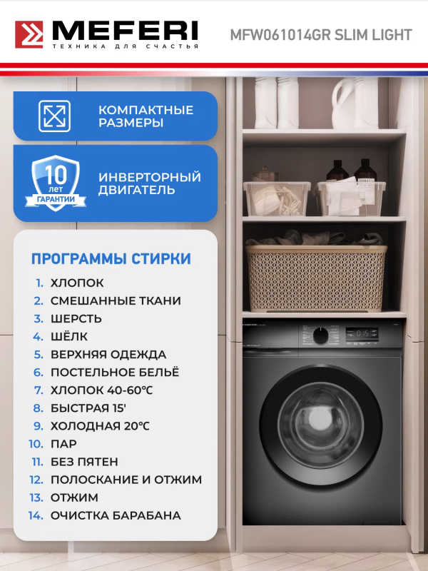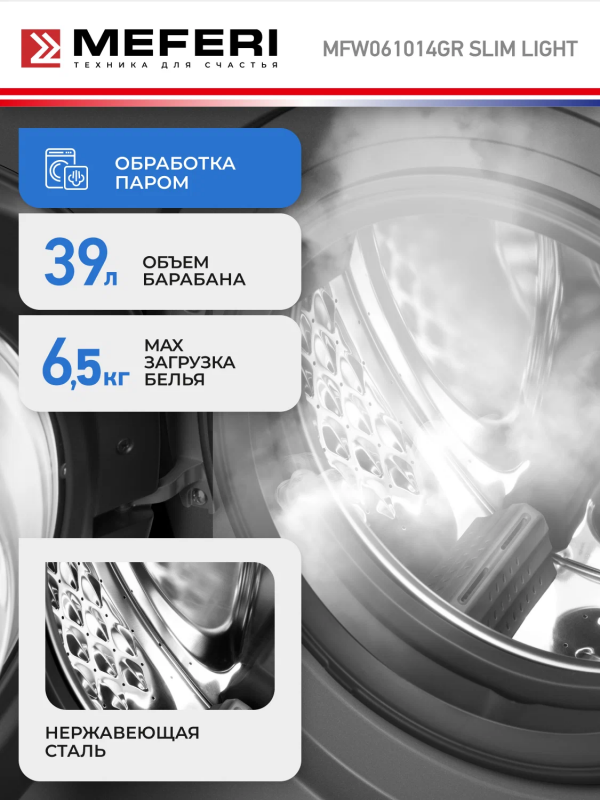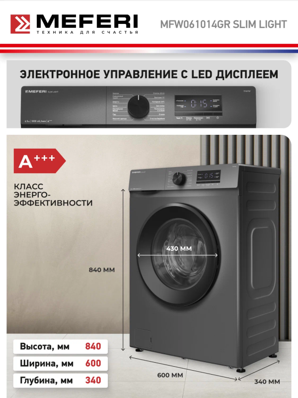 Стиральная машина MEFERI MFW061014GR SLIM LIGHT: Компактное и функциональное решение для небольших помещенийУзкая стиральная машина MEFERI MFW061014GR SLIM LIGHT — это современное решение, которое сочетает стильный дизайн, высокую функциональность и компактные размеры. Она идеально подходит для небольших пространств благодаря своим эргономичным параметрам и вместительному барабану.Основные характеристики и преимущества:Инверторный мотор: Обеспечивает тихую, экономичную и долговечную работу, гарантируя минимальное энергопотребление и высокую надежность.Максимальная загрузка 6,5 кг: Подходит для семьи из 3-4 человек, позволяя стирать достаточное количество белья за один цикл.Отжим до 1000 об/мин: Быстро и эффективно удаляет влагу, сокращая время сушки и обеспечивая идеальный результат.14 программ стирки с паром: Включает режимы для хлопка, шерсти, шелка, верхней одежды, постельного белья и экспресс-стирку (15 минут).Электронное управление с LED-дисплеем: Интуитивно понятный интерфейс позволяет легко настроить параметры стирки.Регулировка температуры до 90°C: Подходит для стирки как деликатных, так и сильно загрязненных вещей.Функция удаления пятен и дополнительного полоскания: Гарантирует глубокую очистку и бережное отношение к ткани.Отложенный старт (2-24 часа): Позволяет планировать стирку в удобное время, экономя электроэнергию.Дозагрузка белья (перезапуск): Возможность добавить вещи в барабан после начала программы.Блокировка от детей и защита от перелива: Повышают безопасность эксплуатации.Размеры (ШxГxВ): 600×340×840 мм: Компактные габариты идеально подходят для узких пространств.Класс энергоэффективности A+++: Высокая производительность при минимальном потреблении электроэнергии.Уровень шума: 58 дБ при стирке, 74 дБ при отжиме: Комфортное использование без лишнего шума.Глубина с открытым люком на 90° - 810 мм.Функция автовзвешивания: интеллектуальное определение веса белья для оптимизации расхода воды и электроэнергии, что способствует экономии ресурсов.Почему стоит выбрать MEFERI MFW061014GR SLIM LIGHT?Эта стиральная машина станет незаменимым помощником в вашем доме. Она не только эффективно стирает белье, но и экономит пространство благодаря своим компактным размерам. Стильный серый цвет и современный дизайн делают её отличным дополнением к любому интерьеру.MEFERI MFW061014GR SLIM LIGHT — отличный выбор для тех, кто ищет надежную и компактную стиральную машину. Она сочетает все необходимые функции для качественной стирки, а её стильный дизайн и компактные размеры делают её идеальным решением для небольших помещений.