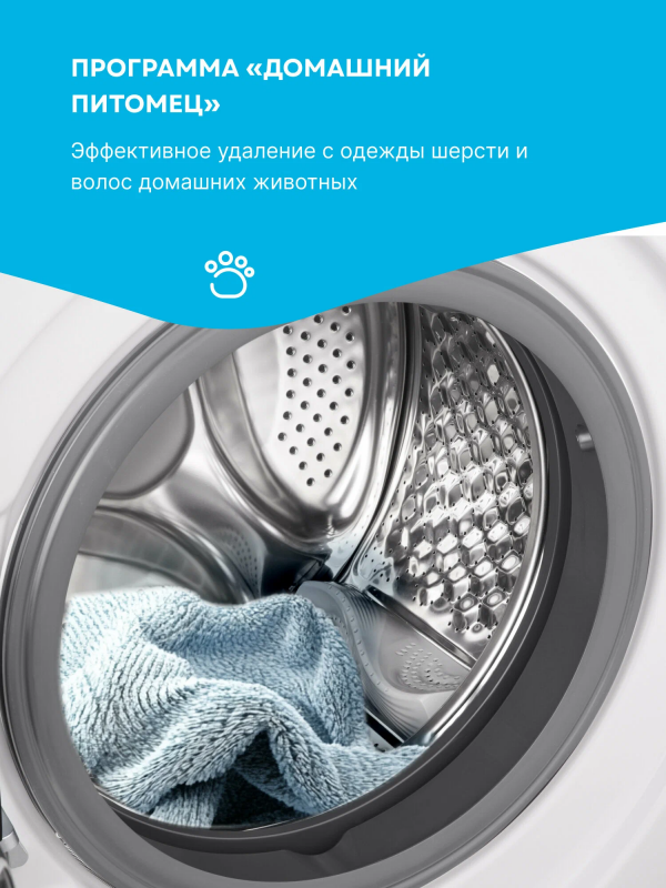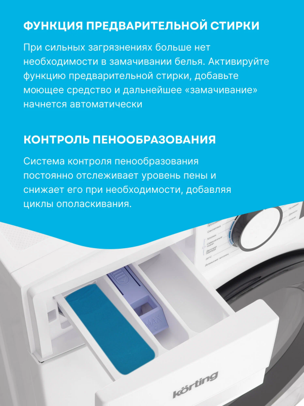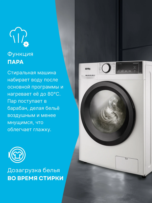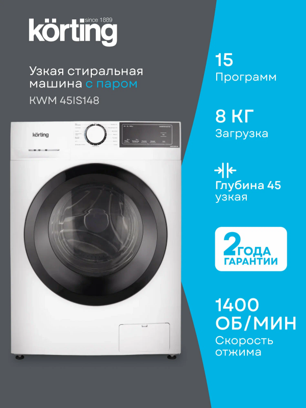 Узкая стиральная машина с паром KWM 45IS148 имеет глубину 45 см и позволяет загружать до 8 кг белья за один цикл стирки. Скорость отжима достигает 1400 оборотов в минуту. Машина оснащена LED-дисплеем и предлагает сенсорное управление. Модель включает 15 программ стирки, среди которых есть режим для детской одежды и для людей с чувствительной кожей. Специальная программа “Домашний питомец” эффективно удаляет шерсть, волосы и ворсинки, оставшиеся от домашних животных. Для стирки пуховиков и зимней утепленной одежды предусмотрена отдельная программа “Пуховики”. Функция пара обеспечивает более эффективное уничтожение бактерий и микробов, предотвращая появление неприятного запаха, а также делает белье более воздушным и облегчает последующую глажку. Чтобы избежать случайного изменения настроек во время работы, предусмотрена блокировка управления. Дверца также блокируется во время стирки, но ее можно разблокировать для дозагрузки белья; активация этой функции возможна при соблюдении определенных условий, связанных с температурой и уровнем воды в баке, выбранной программой и конкретным этапом стирки. Функция отложенного старта позволяет запланировать включение прибора на срок до 24 часов. Инверторный мотор, установленный в стиральной машине KWM 45IS148, обеспечивает надежность, снижает уровень шума и потребление электроэнергии.
