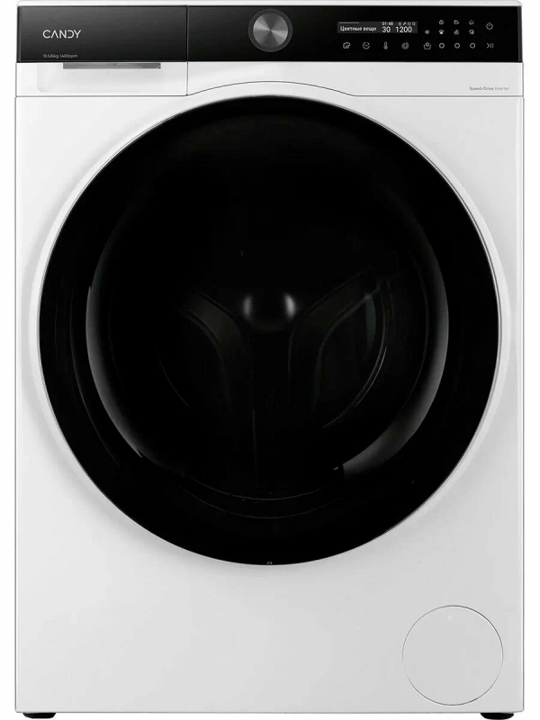 Новая модель Candy UltimO C47D 4106MBSW-07 берет на себя сразу две повседневные задачи — стирку и сушку большого объема белья. Стирально-сушильная машина вмещает до 10,5 кг вещей для стирки и до 6 кг для сушки (расчет для сухого хлопкового белья). Такая загрузка идеально подходит для большой семьи из четырех и более человек.Увеличенный диаметр барабана заметно улучшает качество стирки. Вещи в барабане распределяются равномернее и меньше мнутся, а ткань эффективнее взаимодействует с водой и моющим средством.Еще одна особенность конструкции — широкий люк 360 мм. Теперь загружать и выгружать постельное белье и пуховики (для пуховых вещей в Candy UltimO предусмотрена отдельная программа) стало намного удобнее.Стиральная машина с сушкой представлена в элегантном монохромном сочетании: белый корпус дополнен черным дисплеем и темной крышкой люка. Черно-белая палитра визуально упорядочивает пространство и подходит под разные интерьеры: в минимализме подчеркивает линии и форму, в сканди создает выразительный акцент на фоне светлой мебели, а в современной классике гармонично вписывается в универсальные цвета кухни и ванной комнаты.Круглая дверца перекликается с прямоугольной сенсорной панелью управления. В центре панели расположен дисплей, на котором на русском языке указаны выбранная программа, температура стирки, скорость отжима и время до завершения цикла. Слева находится поворотный селектор программ, а справа — кнопки дополнительных функций, например обработка паром, отложенный старт, ночной режим или энергосбережение.Интуитивно понятное управление подойдет пожилым людям, семьям с детьми и тем, кто просто не хочет разбираться в сложных интерфейсах.В Candy UltimO в каждой программе температура, продолжительность и скорость отжима подобраны так, чтобы бережно и эффективно ухаживать за разными типами тканей. Но если у вас есть особые требования к уходу за вещами, все параметры можно изменить вручную (предельные цифры — 90 °C и 1400 об./мин).