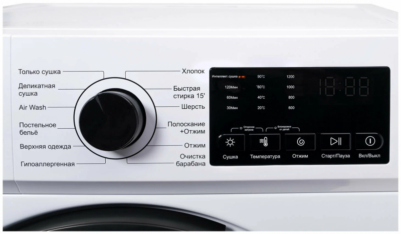 Цифровая панель управления с большим дисплеем:Позволяет легким движением пальца выбирать необходимые настройки, все самые важные функции доступны всего в нескольких касаниях.Эргономично расположенные кнопки и ясная иконка каждой функции значительно упрощают выбор нужного режима.Благодаря этому, каждый, даже тот, кто не имеет опыта работы с подобными устройствами, сможет легко справиться с панелью управления стиральной машиной.Большой дисплей стиральной машины отображает все важные данные: оставшееся время до окончания текущего цикла, выбранные настройки и активированные функции, а также подробную информацию о процессе стирки.Это позволяет быть в курсе происходящего и контролировать каждый этап стирки.Широкий функционал автоматических программ:Только сушка, Деликатная сушка, AirWash (обработка одежды горячим воздухом для обеззараживания), Постельное белье, Верхняя одежда, Гипоаллергенная, Хлопок, Быстрая стирка, Шерсть, Полоскание и Отжим, Отжим, Очистка барабана. Вы всегда сможете найти настройки подходящие именно Вам.Отложенный старт:Одна из самых удобных и полезных функций, доступных на современных стиральных машинах. Благодаря данной возможности, пользователи могут значительно оптимизировать своё время и упростить повседневные задачи по стирке. Достаточно лишь установить определенное время начала работы программы, и машина автоматически стартует в предварительно указанный час.Блокировка от детей:Неотъемлемая функция стиральных машин, которая обеспечивает безопасность в семье. Эта инновационная система разработана специально для предотвращения непредвиденных ситуаций, связанных с попытками детей играть с работающей машиной.Одной из самых распространенных проблем, с которой сталкиваются родители, является непосредственная опасность для детей, играющих или любопытствующих возле стиральной машины. Малыши, испытывая сильное желание понаблюдать за загадочными движениями барабана или просто поиграть с кнопками управления, могут нечаянно запустить цикл стирки или даже травмировать себя. В этом случае блокировка от детей становится незаменимым помощником для защиты ребенка от несчастного случая и сохранения покоя и спокойствия в семье.Инверторный мотор BLDC:Безщеточный двигатель постоянного тока - передовое решение, которое широко применяется в современных стиральных машинах. Благодаря своей инновационной технологии, этот мотор обеспечивает более эффективную и плавную работу при меньшем энергопотреблении.Основным преимуществом инверторного мотора BLDC является его способность изменения скорости вращения. Традиционные стиральные машины часто используют моторы с фиксированной скоростью вращения, что может приводить к необходимости перегрузки или недозагрузки белья. В то время как моторы BLDC могут мгновенно реагировать на изменения нагрузки и автоматически регулировать скорость вращения, обеспечивая оптимальные условия для каждого цикла стирки. Такая гибкость не только повышает качество стирки, но и сокращает время и энергию, затраченные на выполнение процесса.Кроме того, инверторный мотор BLDC характеризуется низким уровнем шума и вибрации. Это особенно важно для домашних условий, где неприятные звуки и вибрация могут быть раздражающими. Благодаря технологии без щеток и постоянному току, к
