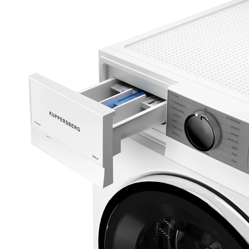 Стирально-сушильная машина Kuppersberg WDM 470 W сочетает в себе высокую вместимость, современное управление и набор функций, обеспечивающих безупречную стирку и сушку. Загрузка на стирку — до 10,5 кг, на сушку — до 7 кг. Это решение для семей с большим объёмом белья, особенно в ограниченном пространстве.Инверторный мотор снижает уровень шума и энергопотребление, обеспечивая стабильную работу. Класс энергопотребления A помогает экономить электричество. Функция Steam+ освежает вещи: устраняет запахи, разглаживает складки и уничтожает бактерии. Удобный дисплей, сенсорное управление, отложенный старт и защита от детей делают модель продуманной до мелочей.Стильный белый корпус и универсальный дизайн легко впишутся в интерьер современной кухни или прачечной.