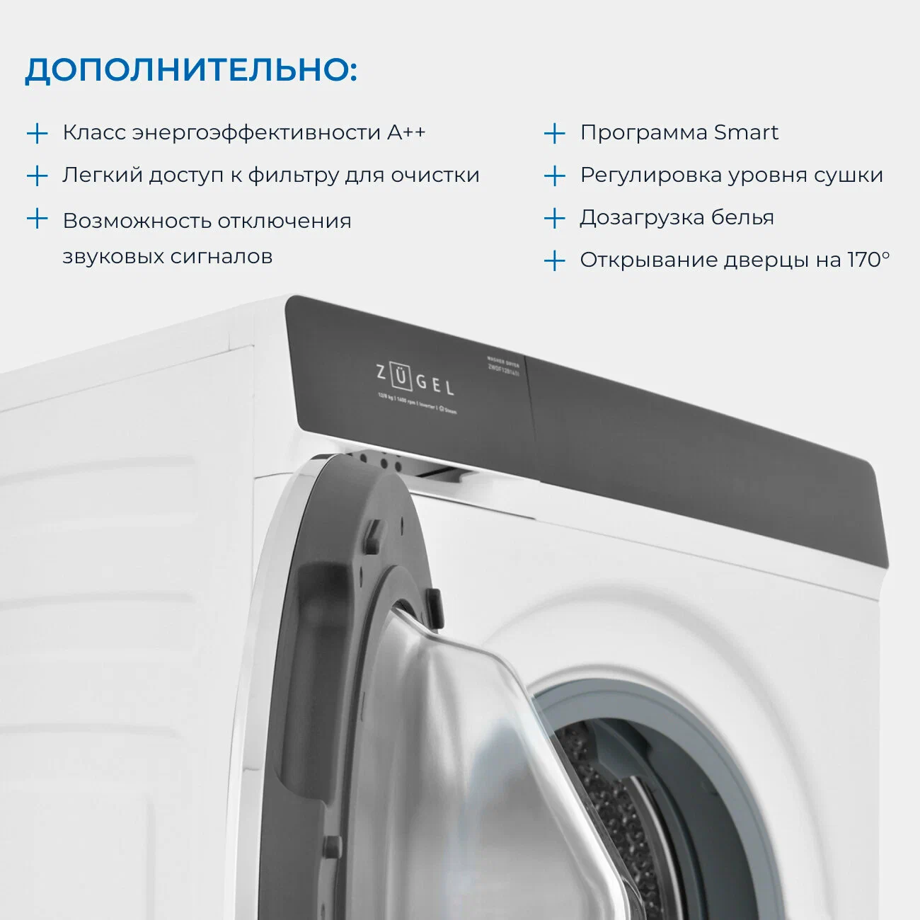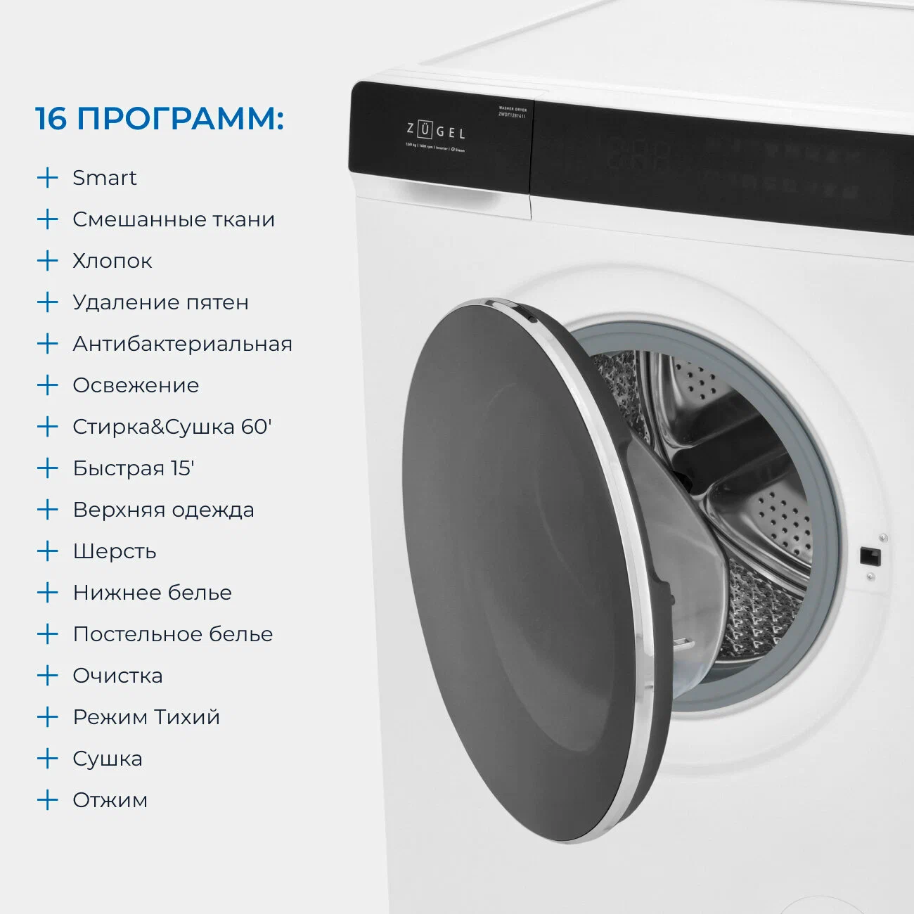 Инверторный бесщеточный двигатель обеспечивает экономное потребление электроэнергии и низкий уровень шума при работе, гарантирует высокое качество стирки и отжима, надежность и долговечностьНизкий уровень шума и возможность отключения звуковых сигналов (Режим Тихий) обеспечивают комфортную эксплуатацию прибора в домашних условияхПрограмма Smart (Интеллектуальная) автоматически настраивает параметры стирки в соответствии с весом загруженных вещей для достижения наилучшего результатаФункция Пар позволяет бережно, но эффективно удалить въевшиеся загрязнения, дезинфицирует, прекрасно освежает и смягчает ткань, облегчает глажкуФункция дозагрузки позволяет приостановить работу программы и добавить в бак белье в процессе стиркиБезопасность: блокировка панели управления, автоматическая блокировка двери, защита от перегреваОткрывание дверцы на 170° облегчает загрузку и извлечение белья из барабанаПрограмма Стирка & Сушка 60' - это чистые и сухие вещи за 1 час!Общие данные:Габариты: 85x60x61 смМаксимальная загрузка: 12 кг (стирка)/8 кг (сушка)Скорость отжима: 1400 об/минКласс стирки: AКласс отжима: ВКласс энергопотребления: А++Программы:16 программ: Smart/Смешанные ткани/Хлопок/Удаление пятен/Антибактериальная/Освежение/Стирка&Сушка 60'/Быстрая 15'/Верхняя одежда/Шерсть/Нижнее белье/Постельное белье/Очистка/Режим Тихий/Сушка/ОтжимДополнительные функции:Программа Стирка & Сушка 60'Программа Smart (Интеллектуальная)Функция ПарФункция дозагрузкиУправление и индикация:Электронное сенсорное управлениеЦветной TFT-дисплей с расширенной индикациейТаймер (отложенный старт) до 24 часовВыбор температуры стирки: холодная-20-30-40-60-90°Регулируемая скорость отжима: 0-600-800-1000-1200-1400 об/минРегулировка уровня сушкиСистемы безопасности:Блокировка от детей (блокировка панели управления)Автоматическая блокировка двериЗащита от перегреваДополнительная информация:Инверторный бесщеточный двигательОбъем барабана, л: 70Потребляемая мощность (стирка/сушка), В: 1800/1200Напряжение/Частота, В/Гц: -220-240/50Макс. ток, А: 16Тип сушки: конденсационнаяСкорость отжима, об/мин (макс.): 1400Годовое энергопотребление, кВт/ч: 317Годовой расход воды, л: 14000Подключение к водопроводу: холодная водаДавление в водопроводе: 0.1-1 МПаУровень шума (стирка), дБ: 62Уровень шума (отжим), дБ: 72Материал барабана: н/ж стальДиаметр барабана, мм: 505Диаметр дверцы/люка, мм: 465/330Угол открытия дверцы, °: 170Длина сетевого шнура, м: 1.5Длина наливного шланга, м: 1.2Длина сливного шланга, м: 1.5Цвет: белыйВес (нетто), кг: 66Вес (брутто), кг: 70