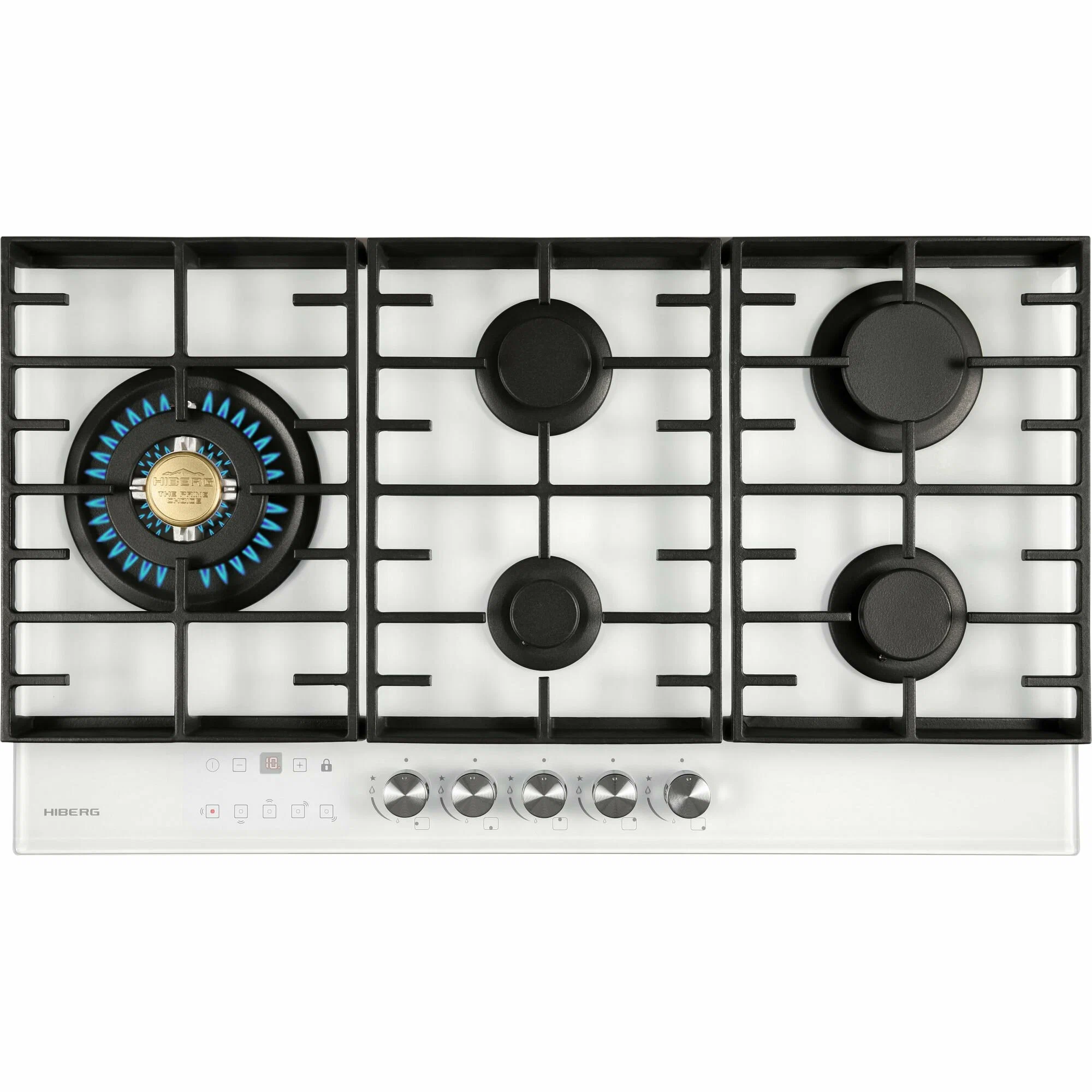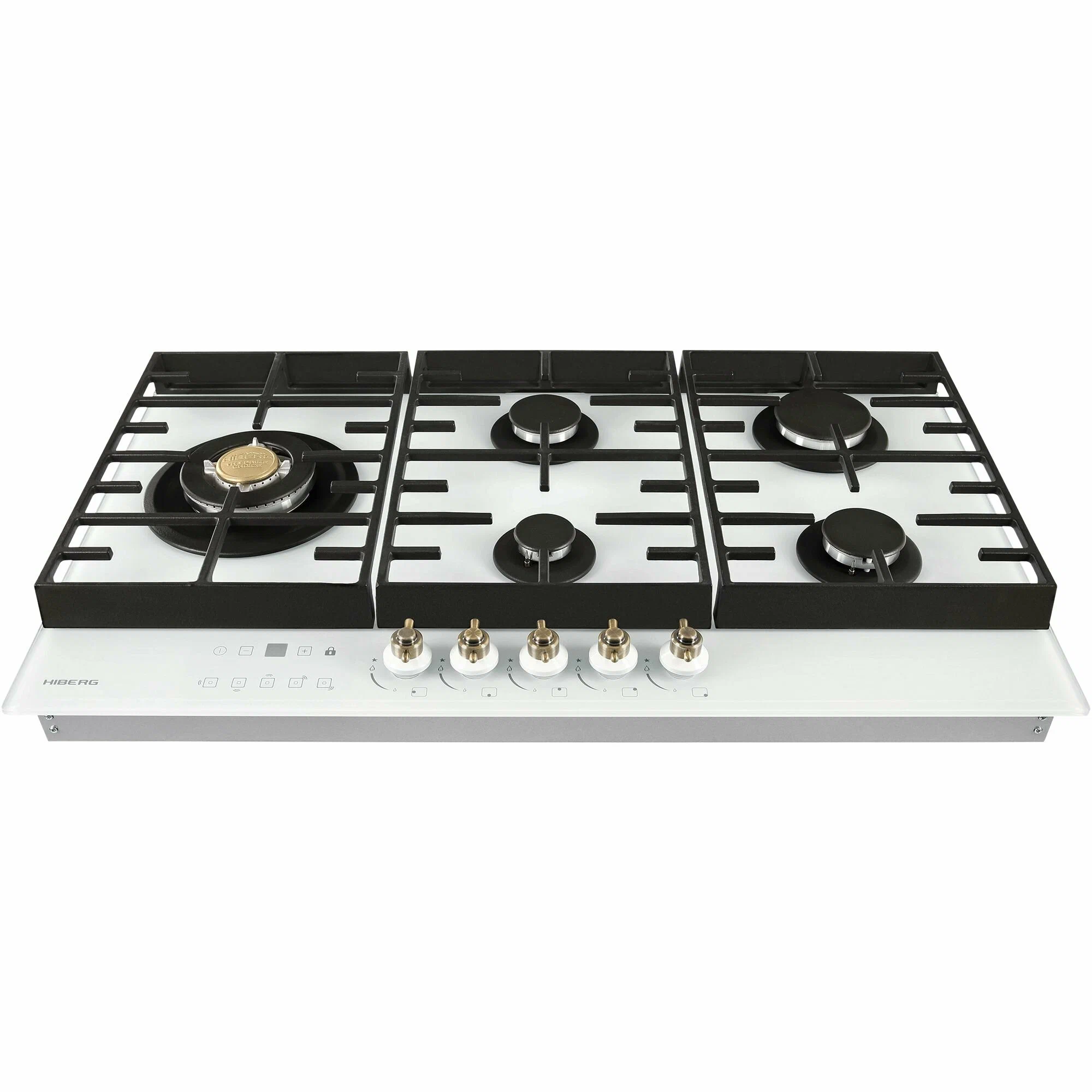 Варочная поверхность газовая Hiberg VM 9155 B из закаленного стекла в черном цвете, оснащена 5 конфорками и функциями: автоматический «электроподжиг», «газ-контроль» и сенсорный таймер отключения. В комплект варочной поверхности входит дополнительный набор ручек регуляторов в ретро-стиле. Рабочая поверхность выполнена из закаленного стекла – прочного и долговечного материала, на ней располагаются 5 конфорок разных по диаметру и мощности огня. WOK конфорка мощностью 3,4 кВт позволяет ускорить закипание воды и использовать интенсивную скорость прожарки. Мощность любой горелки можно регулировать с помощью поворотных переключателей. Для удобства пользования варочной панелью в переключатели встроен «электроподжиг», который позволит одним нажатием руки легко включить нужную конфорку без использования спичек. В варочной поверхности эффективно продумана система безопасности при утечке газа. В случае пролива жидкости на варочную панель или затухания пламени от сквозняка, в конфорке срабатывает функция газ-контроль и подача газа прекращается. Сенсорный индивидуальный таймер для каждой конфорки дает возможность контролировать время готовки каждого блюда. Таймер устанавливается с диапазоном от 1 до 99 минут, по истечении заданного времени варочная панель отключается автоматически. Поверх конфорок установлены чугунные решетки новой конструкции: соприкасаясь со стеклянной панелью только спереди и сзади, обеспечивают меньшую нагрузку на стекло и не оставляют царапин. Кроме того, такие держатели легкие по весу, удобные в уходе и использовании любой посуды на варочной поверхности.