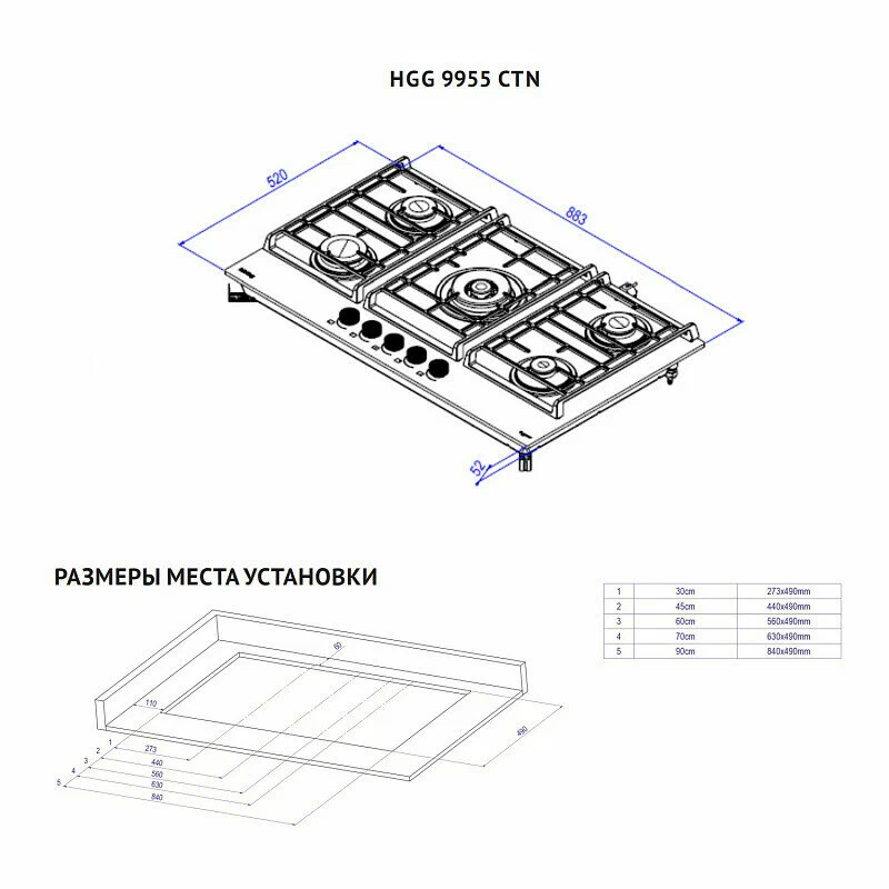 Тип панели: газовая; Установка: независимая; Материал панели: закаленное стекло; Расположение панели управления: спереди; Переключатели: поворотные; Рамка: нет; Общее количество конфорок: 5; Электроподжиг: есть;