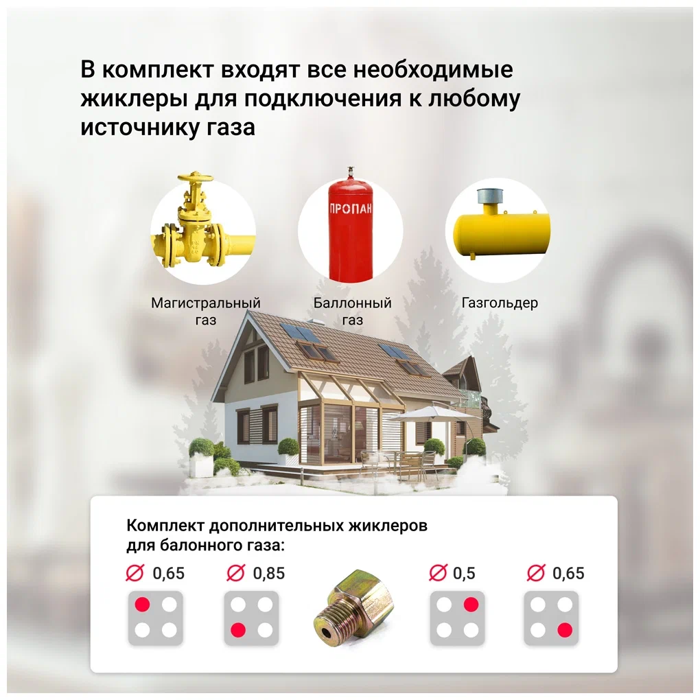 • Особенности: газ-контроль, дополнительные форсунки в комплекте, электроподжиг, электроподжиг в поворотной ручке