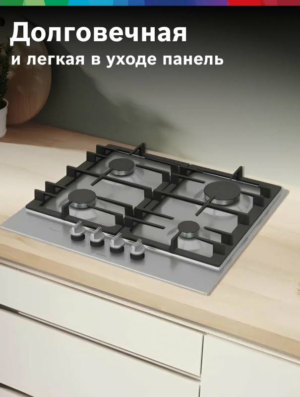"Ищете надежную и стильную газовую варочную панель встраиваемую от проверенного бренда? Варочная газовая панель 4 конфорки BOSCH PCP6A5I90M — это немецкое качество и эргономичный дизайн для вашей кухни! Модель из премиальной нержавеющей стали с интегрированной панелью управления создает бесшовную поверхность для легкого ухода. Четыре мощные конфорки обеспечивают точный контроль приготовления, а фронтальное расположение элементов управления делает использование максимально удобным. Идеальное решение для тех, кто ценит сочетание функциональности, лаконичного дизайна и надежности бренда Bosch.Ключевые характеристики панели варочной газовой :• Бренд: Bosch• Тип: газовая варочная панель 4 конфорки встраиваемая• Количество конфорок: 4• Материал поверхности: нержавеющая сталь• Цвет: нержавеющая сталь• Управление: интегрированная панель• Расположение панели управления: фронтальное• Ширина: 58.2 см• Размеры для встраивания: 56.0-56.0 x 48.0-49.0 смОсобенности и ваши преимущества с BOSCH:• Немецкое качество Bosch — надежность и долговечность от европейского производителя• Цельная поверхность из нержавеющей стали — устойчивость к повреждениям и легкое очищение• Интегрированная панель управления — стильный внешний вид и защита от попадания влаги• Фронтальное расположение элементов управления — удобный доступ и безопасность использования• 4 мощные газовые конфорки — оптимальная конфигурация для различных задач приготовления• Точные размеры для встраивания — простая установка в стандартную кухонную мебельВарочная панель газовая 4 конфорки встраиваемая BOSCH PCP6A5I90M — это образец немецкой инженерной мысли и безупречного качества. Она станет надежным помощником на вашей кухне, сочетая в себе практичность, эргономику и лаконичный дизайн. Доверьтесь наследию Bosch и наслаждайтесь совершенством каждого приготовленного блюда. Выбирайте технику, которая работает на вас — выбирайте Bosch!