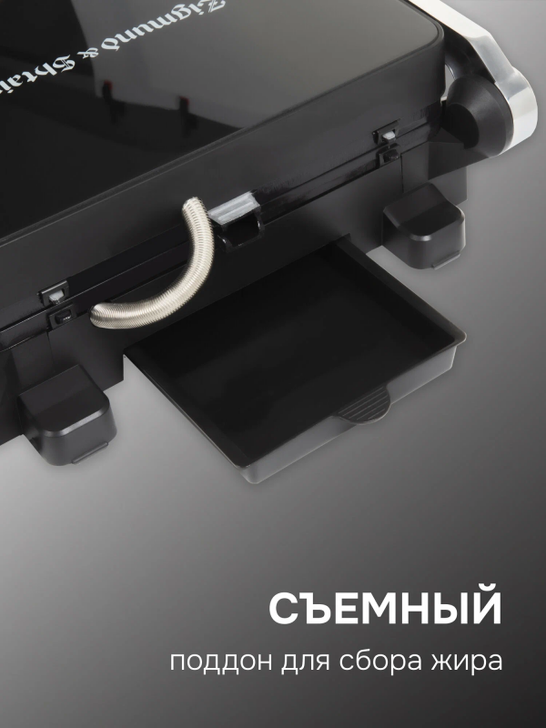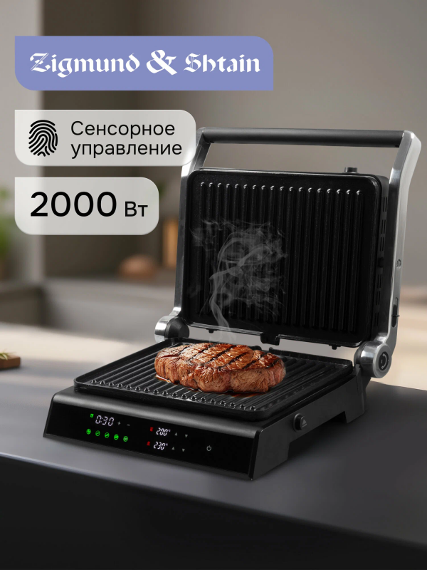 Контактный гриль Grillmeister ZEG-933 позволяет жарить или запекать различные продукты без добавления масла. Вы легко приготовите сочные стейки различной степени прожарки, нежную рыбу, полезные овощи-гриль, котлеты для бургеров, хрустящие тосты и сэндвичи, а также панини, шаурму, буррито с разнообразной начинкой и многое другое.Гриль Grillmeister ZEG-933 – это инновационный прибор с электронным управление и 5 автоматическими программами. Вы выбираете только вид продукта (программу), а верхняя панель автоматически отрегулируется в соответствии с толщиной продукта. При выборе одной из автоматических программ, время приготовления выставляется автоматически.Благодаря большой мощности 2000 Вт, гриль готовит быстро и качественно. Жарочные панели – литые, тяжелые, толщиной 1.7 см и с великолепной теплопроводностью. Они имеют прочное антипригарное покрытие, которое предотвращает подгорание и способствует образованию румяной хрустящей корочки. Рифленая поверхность создает при жарке аппетитные полоски гриля.