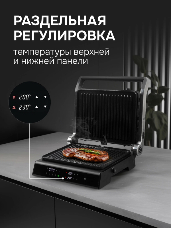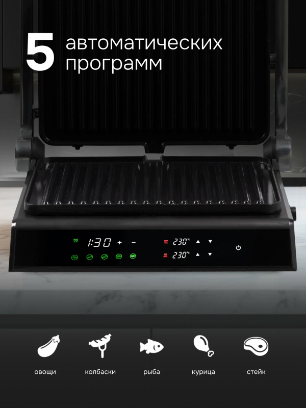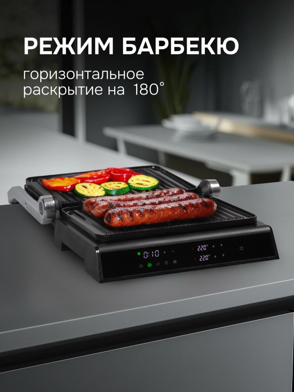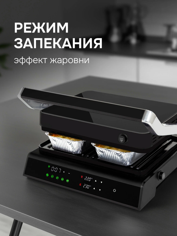 Дополнительная информация: 4 в 1: гриль/барбекю/запекание/сэндвич-тостер, авторегулировка высоты верхней панели, 5 автоматических программ + ручной режим