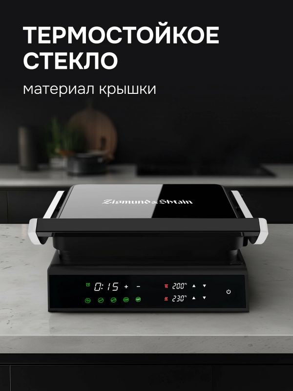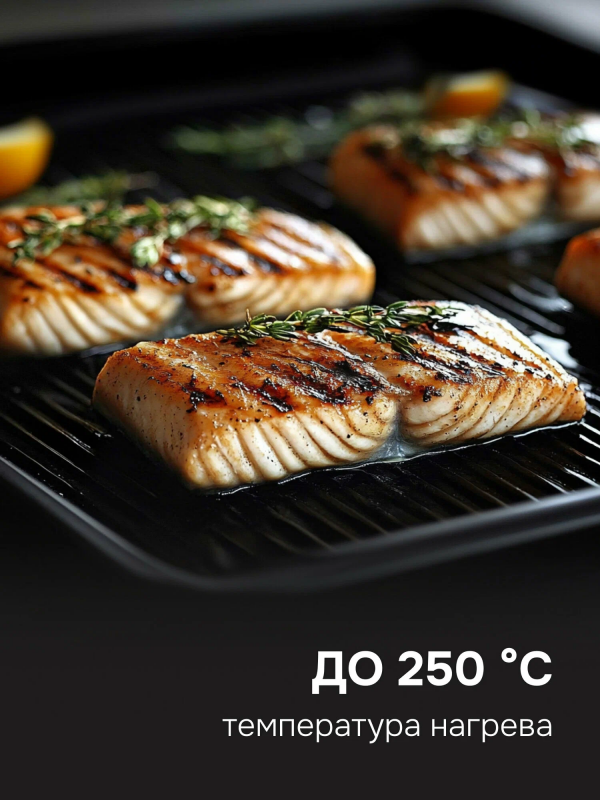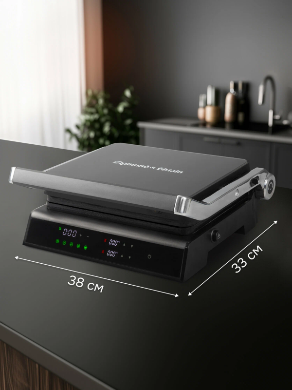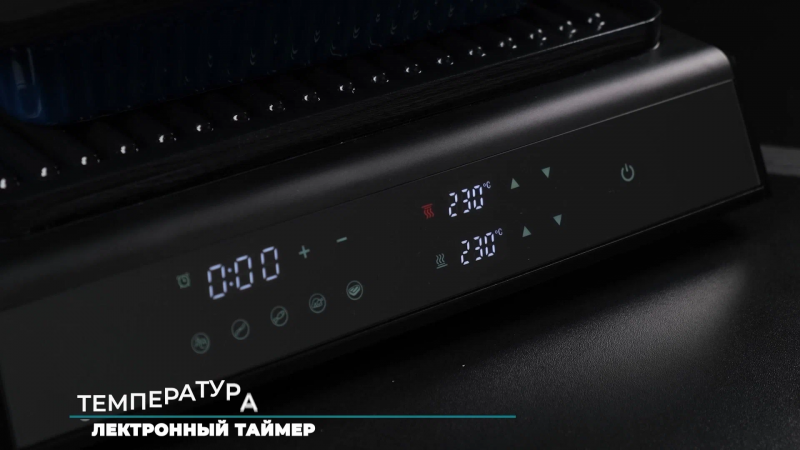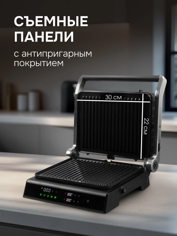 Особенности: антипригарное покрытие, крышка, поддон для сбора жира, регулировка высоты верхней панели, съемные пластины, можно мыть в посудомоечной машине, сенсорное управление
