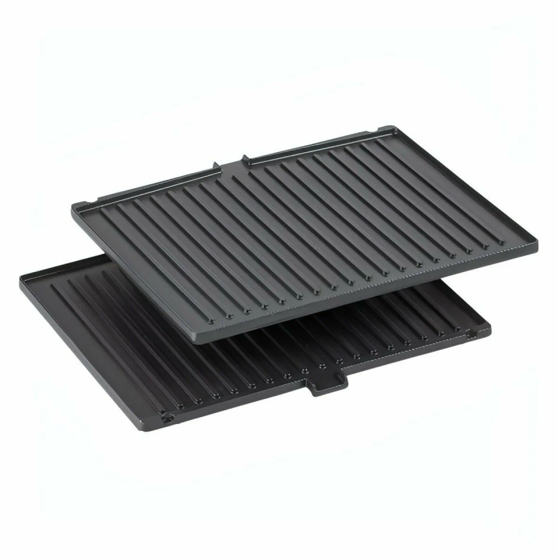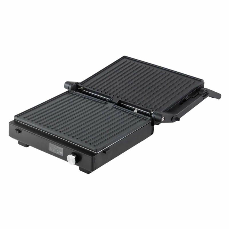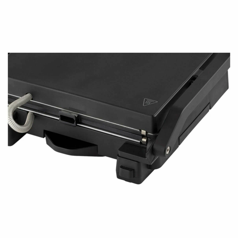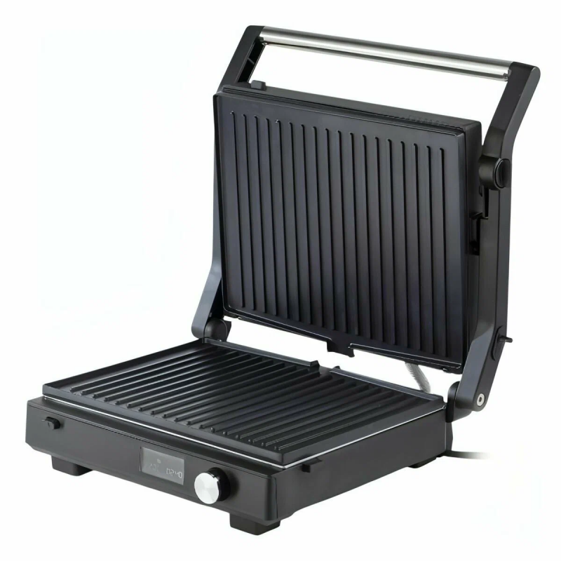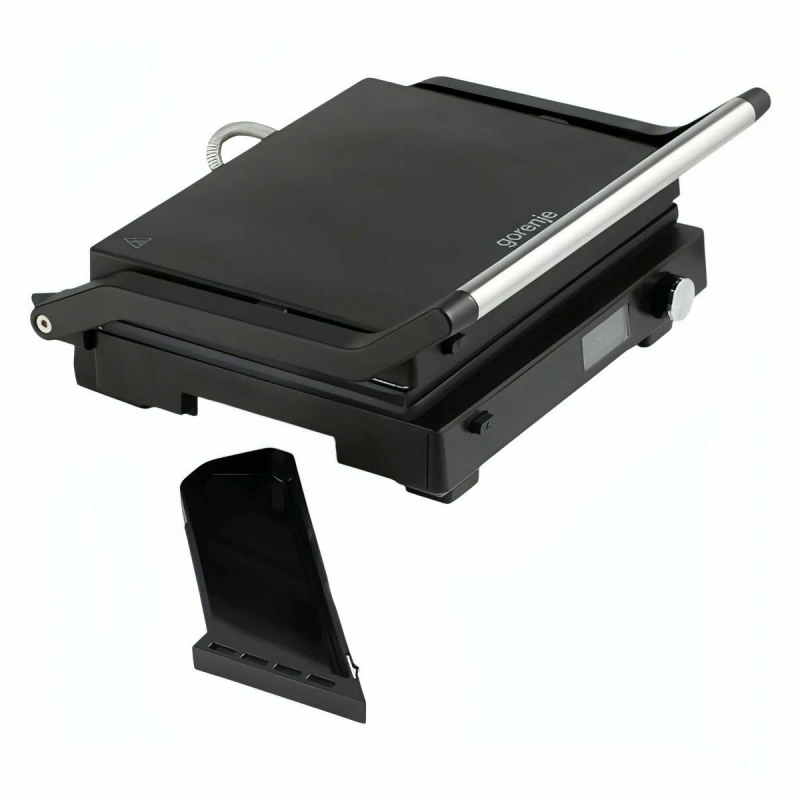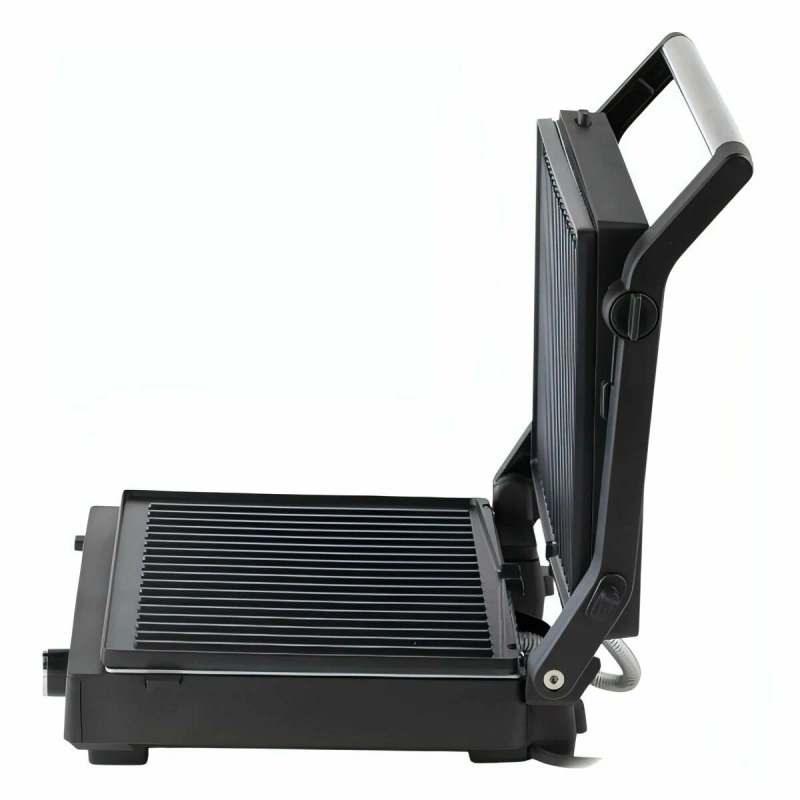 Модель оснащена съемным поддоном для сбора жира. Крышка открывается на 180°, что позволяет использовать электрогриль в открытом виде. Прорезиненные ножки предотвращают скольжение прибора по столу.