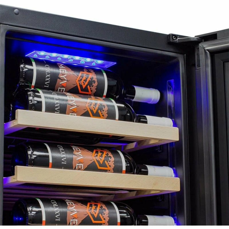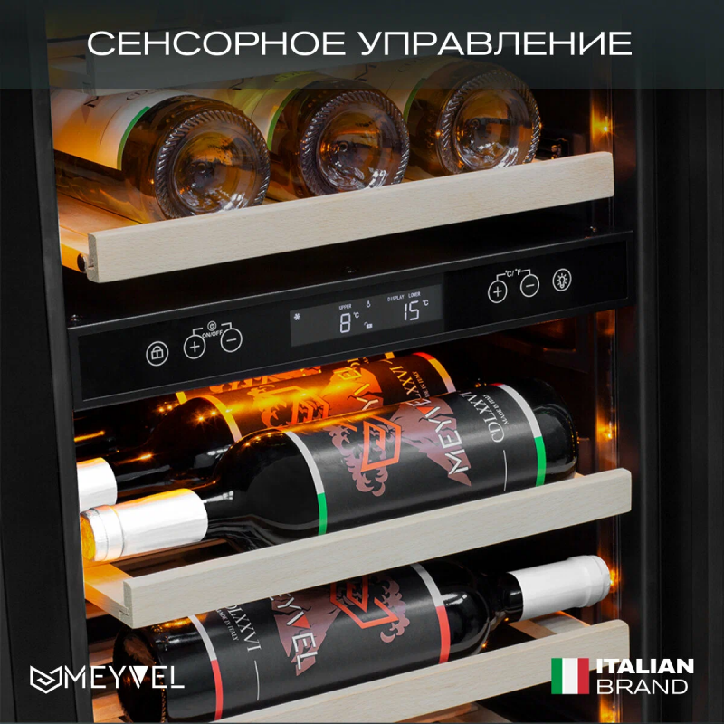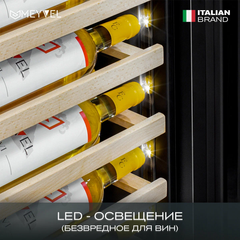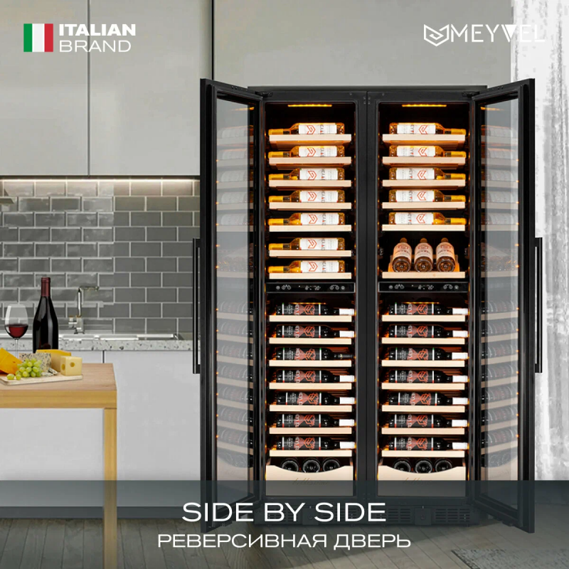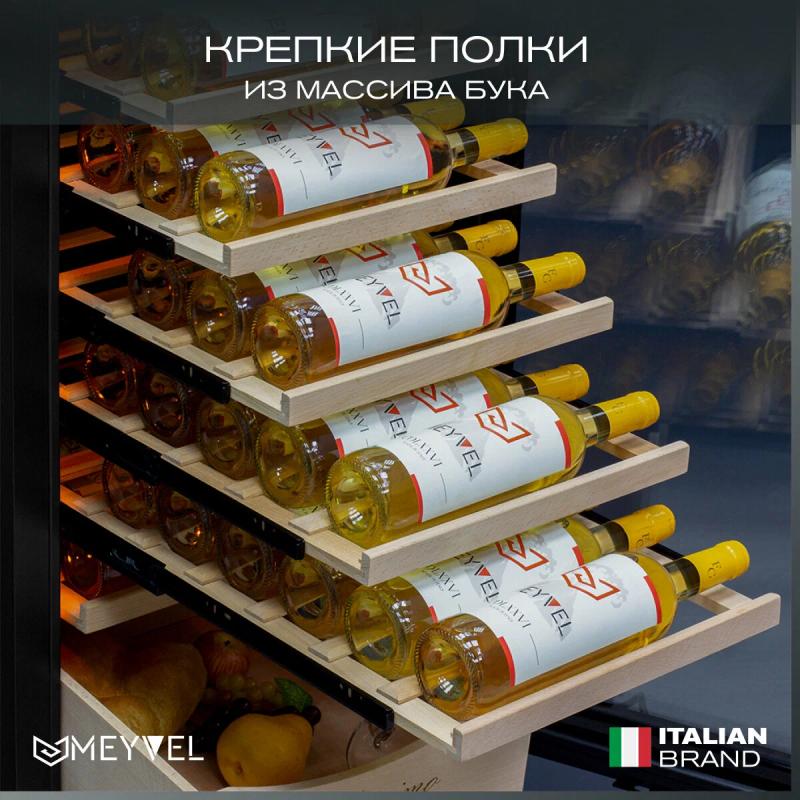 Винный шкаф Meyvel MV106-KBT2 (Slim)Продвинутый функционал и комплектация винного шкафа MV106-KBT2 (Slim) от итальянского бренда Meyvel создаёт одну из самых высококачественных систем для профессионального и длительного хранения различных сортов вин.Внутри шкафа поддерживается влажность в диапазоне 60-80%, как в настоящем винном погребе.Этот винный холодильник отлично впишется в любой кухонный гарнитур благодаря своим размерам. Это одна из немногих моделей, у которой ширина всего 45 см.Широкий функционалНесомненно, Вас порадует наличие панорамного светодиодного освещения (подсвечивает каждую полку), которое имеет три цвета - белый, янтарный и синий. Оно не выделяет тепло и следовательно - не нагревает бутылки с вином. Так что Вы сможете эффектно демонстрировать Вашу винную коллекцию.Благодаря встроенной вентиляции и отсутствию выступающих частей, эта модель может быть не только отдельно стоящей, но и устанавливаться в нишу с минимальными зазорами. Дверь имеет скрытые петли и не требуют дополнительных вырезов в нише.Дверь может открываться слева или справа. Для изменения направления открывания двери её можно перенавесить. (Стандартное исполнение - петли справа).Благодаря возможности перенавешивания двери, Вы можете установить два винных шкафа рядом и организовать систему Side-by-Side.Так же, из важных функций в этой модели есть сигнализация открытой двери, сигнализация отклонения температуры, автоматическая разморозка, «Зимний режим» и режим «Шаббат».Внутреннее пространствоMV106-KBT2 (Slim) отлично подойдёт и для ресторанов. Вмещает до 110 бутылок типа «Бордо», а стильный дизайн отлично выглядит в любом интерьере. (Ручка, вентиляционная решётка и замок выполнены в цвете корпуса).14 полок из массива бука оснащены выкатным механизмом, который обеспечить надёжное и лёгкое выдвижение. Этот натуральный и крепкий материал не только имеет красивую текстуру, но и прекрасно гасит небольшую вибрацию.В каждой зоне есть полка с увеличенным пространством. На таких полках Вы сможете разместить не только стандартные бутылки Бордо, но и Магнум. А если нужно разместить что-то побольше - то в этом случае можно вынуть одну или несколько полок.Одна из полок сделана в виде специальной полки-трансформера. Её можно использовать как стандартную полку, или как демонстрационную. В этом случае бутылки будут располагаться под наклоном, для демонстрации Вашей винной коллекции.Внизу винного шкафа расположен выдвижной ящик - в нем Вы можете хранить вино в бутылках или винные атрибуты (штопор, бокалы, аэраторы, декантеры, каплеуловители, термометры и т. д.).Оптимальные условия храненияДверь имеет тройное стекло (максимальная защита), которое задерживает губительные для вина ультрафиолетовые лучи.Внутренние пространство разделено на 2 зоны с возможностью раздельной настройки температуры. Так что Вы всегда сможете хранить все виды вин при идеальной температуре или установить разные значения, что бы напитки всегда были готовы к подаче.Идеальной температурой хранения вина считается температура +12°C. Подаются розовые и сухие белые вина обычно при температуре от +8°C до +14°C, игристые вина и шампанское при +6°C до +8°C, а легкие красные вина - при +13°C и насыщенные красные вина при +15°C - +19C°.В каждой из зон установлен специальный вентилятор, который не даст воздуху застояться и равномерно ра