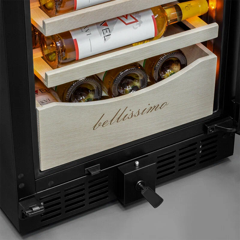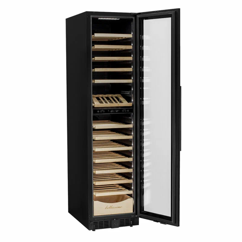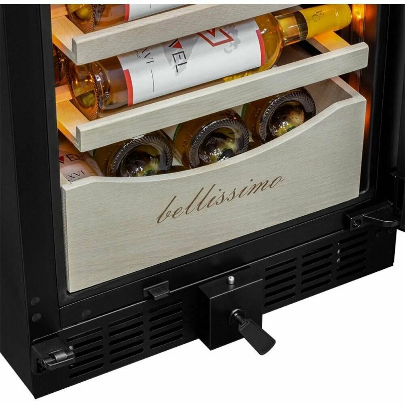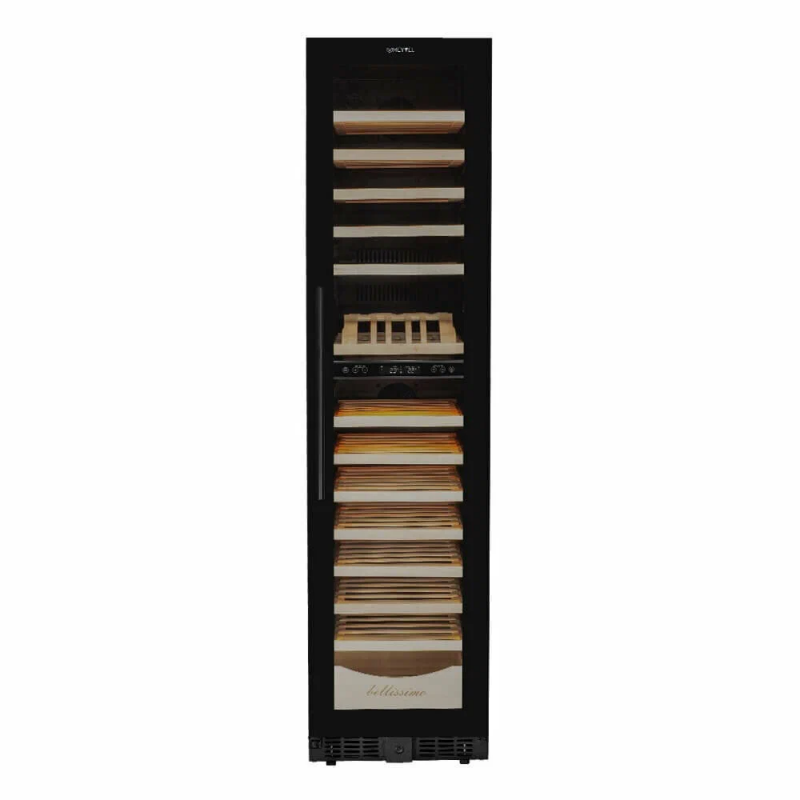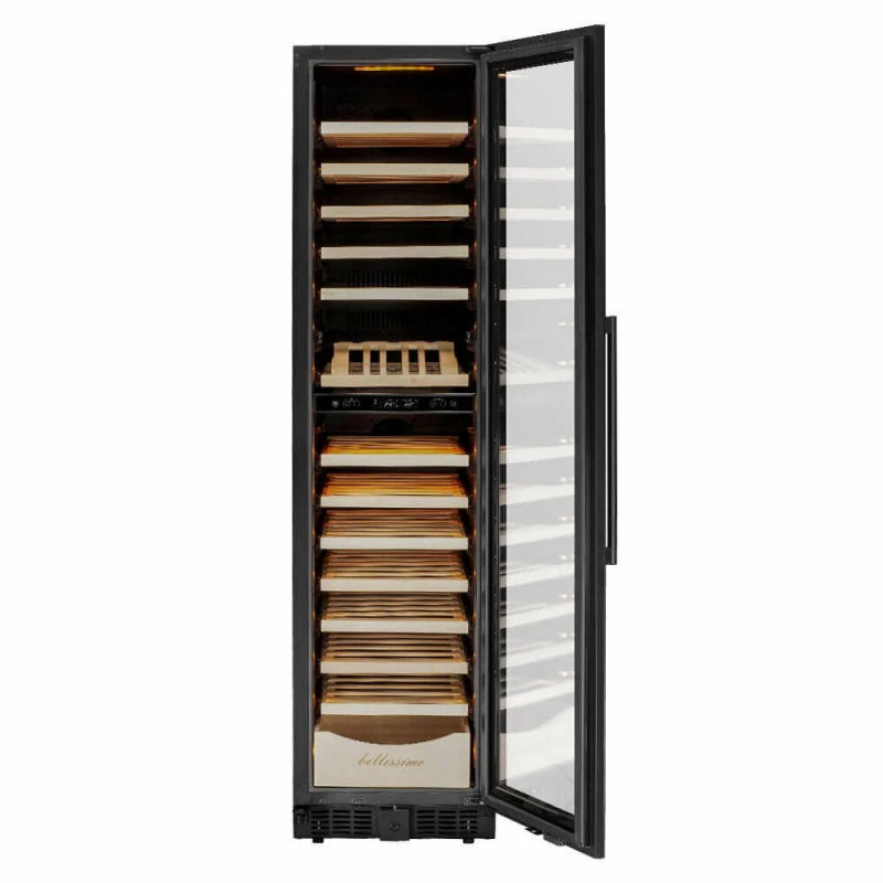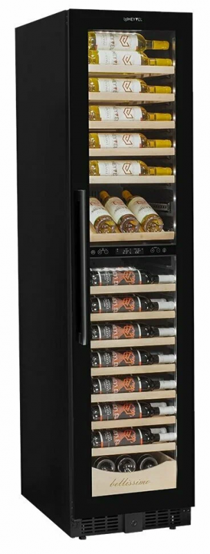 Винный шкаф Meyvel MV106-KBT2 (Slim)Продвинутый функционал и комплектация винного шкафа MV106-KBT2 (Slim) от итальянского бренда Meyvel создаёт одну из самых высококачественных систем для профессионального и длительного хранения различных сортов вин.Внутри шкафа поддерживается влажность в диапазоне 60-80%, как в настоящем винном погребе.Этот винный холодильник отлично впишется в любой кухонный гарнитур благодаря своим размерам. Это одна из немногих моделей, у которой ширина всего 45 см.Широкий функционалНесомненно, Вас порадует наличие панорамного светодиодного освещения (подсвечивает каждую полку), которое имеет три цвета - белый, янтарный и синий. Оно не выделяет тепло и следовательно - не нагревает бутылки с вином. Так что Вы сможете эффектно демонстрировать Вашу винную коллекцию.Благодаря встроенной вентиляции и отсутствию выступающих частей, эта модель может быть не только отдельно стоящей, но и устанавливаться в нишу с минимальными зазорами. Дверь имеет скрытые петли и не требуют дополнительных вырезов в нише.Дверь может открываться слева или справа. Для изменения направления открывания двери её можно перенавесить. (Стандартное исполнение - петли справа).Благодаря возможности перенавешивания двери, Вы можете установить два винных шкафа рядом и организовать систему Side-by-Side.Так же, из важных функций в этой модели есть сигнализация открытой двери, сигнализация отклонения температуры, автоматическая разморозка, «Зимний режим» и режим «Шаббат».Внутреннее пространствоMV106-KBT2 (Slim) отлично подойдёт и для ресторанов. Вмещает до 110 бутылок типа «Бордо», а стильный дизайн отлично выглядит в любом интерьере. (Ручка, вентиляционная решётка и замок выполнены в цвете корпуса).14 полок из массива бука оснащены выкатным механизмом, который обеспечить надёжное и лёгкое выдвижение. Этот натуральный и крепкий материал не только имеет красивую текстуру, но и прекрасно гасит небольшую вибрацию.В каждой зоне есть полка с увеличенным пространством. На таких полках Вы сможете разместить не только стандартные бутылки Бордо, но и Магнум. А если нужно разместить что-то побольше - то в этом случае можно вынуть одну или несколько полок.Одна из полок сделана в виде специальной полки-трансформера. Её можно использовать как стандартную полку, или как демонстрационную. В этом случае бутылки будут располагаться под наклоном, для демонстрации Вашей винной коллекции.Внизу винного шкафа расположен выдвижной ящик - в нем Вы можете хранить вино в бутылках или винные атрибуты (штопор, бокалы, аэраторы, декантеры, каплеуловители, термометры и т. д.).Оптимальные условия храненияДверь имеет тройное стекло (максимальная защита), которое задерживает губительные для вина ультрафиолетовые лучи.Внутренние пространство разделено на 2 зоны с возможностью раздельной настройки температуры. Так что Вы всегда сможете хранить все виды вин при идеальной температуре или установить разные значения, что бы напитки всегда были готовы к подаче.Идеальной температурой хранения вина считается температура +12°C. Подаются розовые и сухие белые вина обычно при температуре от +8°C до +14°C, игристые вина и шампанское при +6°C до +8°C, а легкие красные вина - при +13°C и насыщенные красные вина при +15°C - +19C°.В каждой из зон установлен специальный вентилятор, который не даст воздуху застояться и равномерно ра