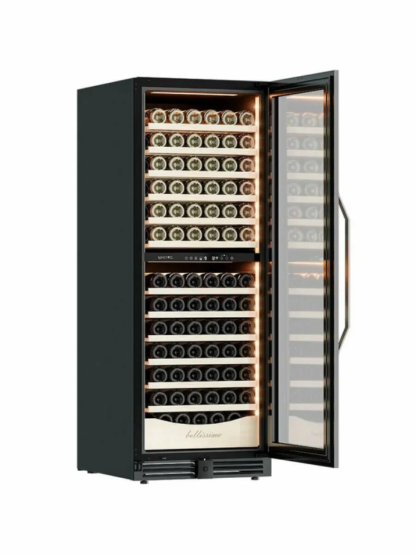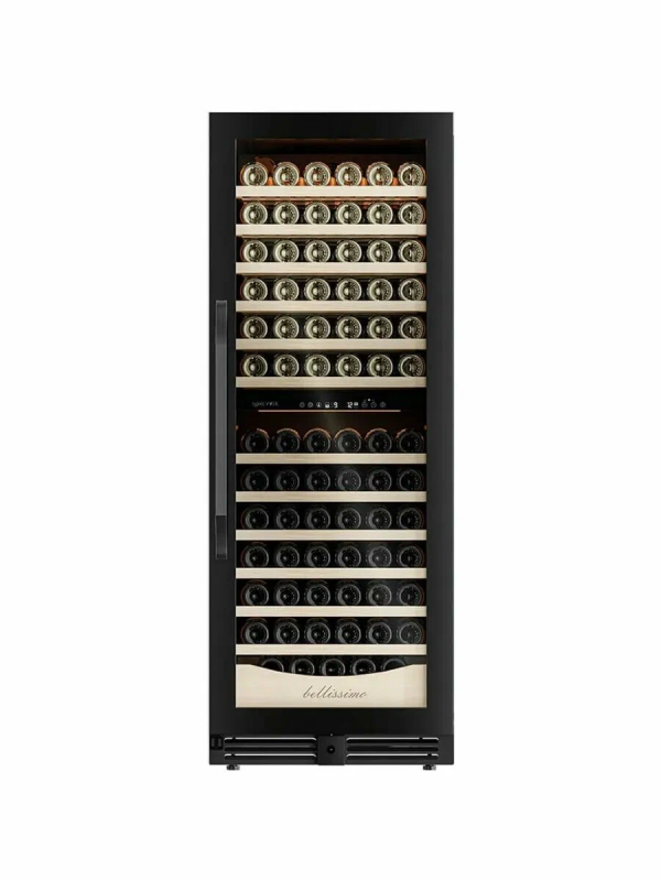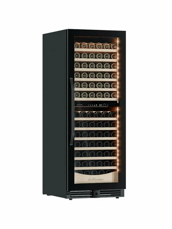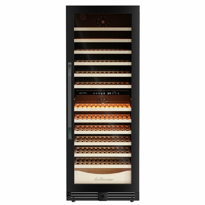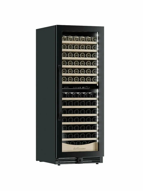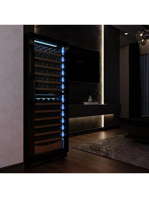 Винный шкаф предназначен для профессионального и длительного хранения различных сортов вин (до 141 бутылок типа Бордо). Он так же оснащен дверью с защитой от ультрафиолетовых лучей и поддерживает влажность в диапазоне 60-80%, как в настоящем винном погребе.Стильный шкаф MV141PRO-KBT2 сочетает в себе неподвластное времени очарование, а так же качество натуральных материалов и высоких технологий.MV141PRO-KBT2 может устанавливаться как отдельно, так и встраиваться в нишу. За счёт того, что верхняя петля двери не выступает за пределы корпуса и шкаф оснащён встроенной системой вентиляции - эта модель устанавливается в нишу с минимальными зазорами.Так же, из важных функций в этой модели есть сигнализация открытой двери и отклонения температуры, автоматическая разморозка и зимний режим, который подогреет внутреннее пространство, если температура в помещении опустилась ниже заданной.Управление сенсорное с функцией блокировки. Есть режим Эко-демо и память настроек.Преимущества винного шкафа Meyvel MV141PRO-KBT2:Идеально подходит для дома и ресторана;Можно установить в нишу или отдельно;Встроенная система вентиляции;Перенавешиваемая дверь;Возможность устанавливать два шкафа Side by Side;Ручка и замок в цвет корпуса;Две температурные зоны для хранения вин и подготовки их к подаче;Полки из массива бука отлично гасят вибрацию;Полка с увеличенным пространством (в каждой зоне) для нестандартных бутылок;Панорамное освещение для максимальной демонстрации винной коллекции;3 цвета освещения на выбор (белый /синий / янтарный);3 стекла для максимальной защиты от ультрафиолета;Угольный фильтр для устранения посторонних запахов;Зимний режим для сохранения заданного температурного режима в неотапливаемых помещениях;Сигнализация отклонения температуры;Сигнализация открытой двери;Память настроек (при отключении питания все настройки сохранятся);Автоматическая разморозка;Оснащён одним из самых надёжных компрессоров с низким уровнем шума.