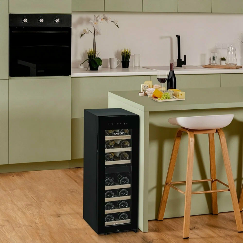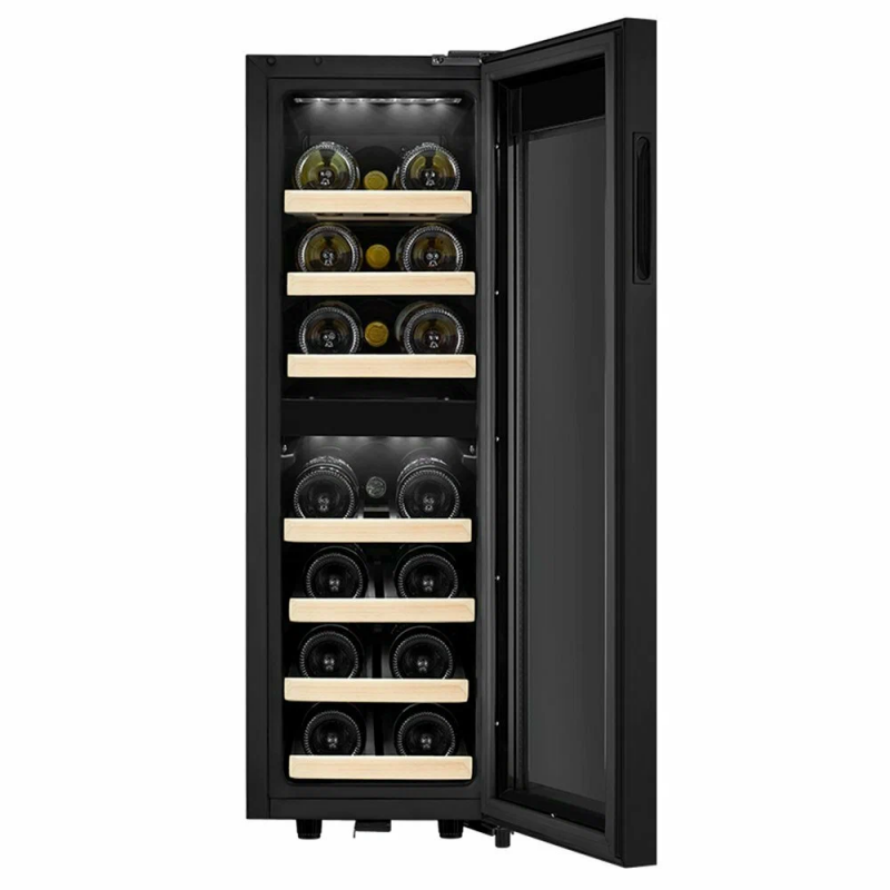Компрессорный винный шкаф MV19-KBF2 Современный винный шкаф MV19-KBF2 – инновационное решение проблемы качественного хранения вина. Расширенная функциональность, изысканный дизайн, полноценная имитация условий «винного погреба» – всё это винный шкаф MV19-KBF2. Лаконичный дизайн. Изысканный дизайн модели делает её абсолютным выбором большинства: корпус MV19-KBF2 выполнен из стали окрашенной в чёрный цвет, современная технология освещения позволит Вам в любое время эффектно продемонстрировать Вашу винную коллекцию гостям. Каждая деталь модели гармонично дополняет друг друга, делая винный шкаф универсальным под любые стили интерьера. Продуманное внутреннее пространство. Благодаря продуманному внутреннему исполнению и съемным полкам Вы сможете размещать бутылки любого объема. Внутреннее пространство рассчитано на хранение до 19 бутылок типа Бордо (0,75 л). При желании можноизвлечь несколько полок и разместить большее количество бутылок. Габариты модели позволяют разместить ее максимально функционально в любой зоне: кухне, столовой, гостиной. Для размещения винных бутылок, шкаф оснащен 7 крепкими полками из массива бука: выдвижные (4), выдвижные полуполки (3). Винные бутылки, расположенные внутри шкафа, надежно защищены от вредоносных ультрафиолетовых лучей двойным стеклом, установленным в дверцу Технологичность. Равномерное охлаждение содержимого шкафа достигается благодаря качественной циркуляции воздуха. С помощью современной сенсорной панели управления Вы сможете быстро и легко управлять всеми функциями шкафа. Практически бесшумная работа винного шкафа Meyvel MV19-KBF2 достигается благодаря установленному современному и энергоэффективному компрессору. Модель оснащена многоступенчатой системой гашения вибраций, обеспечивая полный покой Вашей винной коллекции. Для того, чтобы циркуляция воздуха была максимально качественной и равномерной, необходимо размещать бутылки с вином так, чтобы они не соприкасались со стенкой испарителя, для этого на полках установленыограничительные бортики. Отсутствие посторонних запахов внутри модели MV19-KBF2 обеспечивается подбором качественных материалов, а также сменным угольным фильтром. Удобный балансировочный механизм позволяет произвести установку в максимально быстрые сроки. Преимущества винного шкафа MV19-KBF2: вместительность до 19 бутылок типа Бордо (0,75л); изысканный дизайн, стальной корпус в черном цвете; равномерное охлаждение и качественная циркуляция воздуха; инновационный компрессор, низкий уровень шума; Низкий уровень вибрации; балансировочный механизм, упрощающий процесс монтажных работ; защита от УФ-излучения с помощью двойного стекла; мягкая светодиодная подсветка; современное сенсорное управление; простая система настройки уровня температуры; автоматическое размораживание; возможность закрывания дверцы на замок; диапазон допустимых значений уровня влажности 50-80%; Угол открытия двери – 200°; Приобретенный Вами винный шкаф MV19-KBF2 полностью готов к эксплуатации. При возникновении вопросов, Вы можете обратиться в сервисный центр. Дополнительно Вы можете приобрести для шкафа угольный фильтр. Важно: прежде чем устанавливать винный шкаф, ознакомьтесь с указанными в инструкции показателями напряжения (В) и частоты (Гц) и убедитесь в том, что они совпадают с уровнем показателей в В