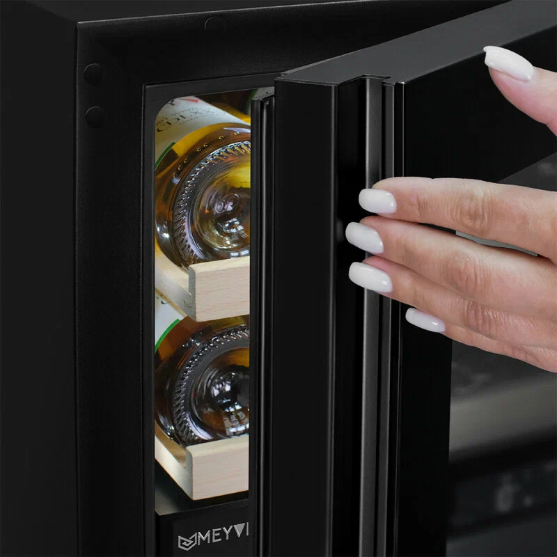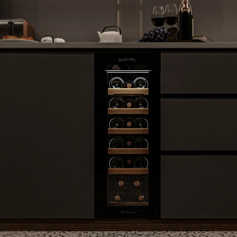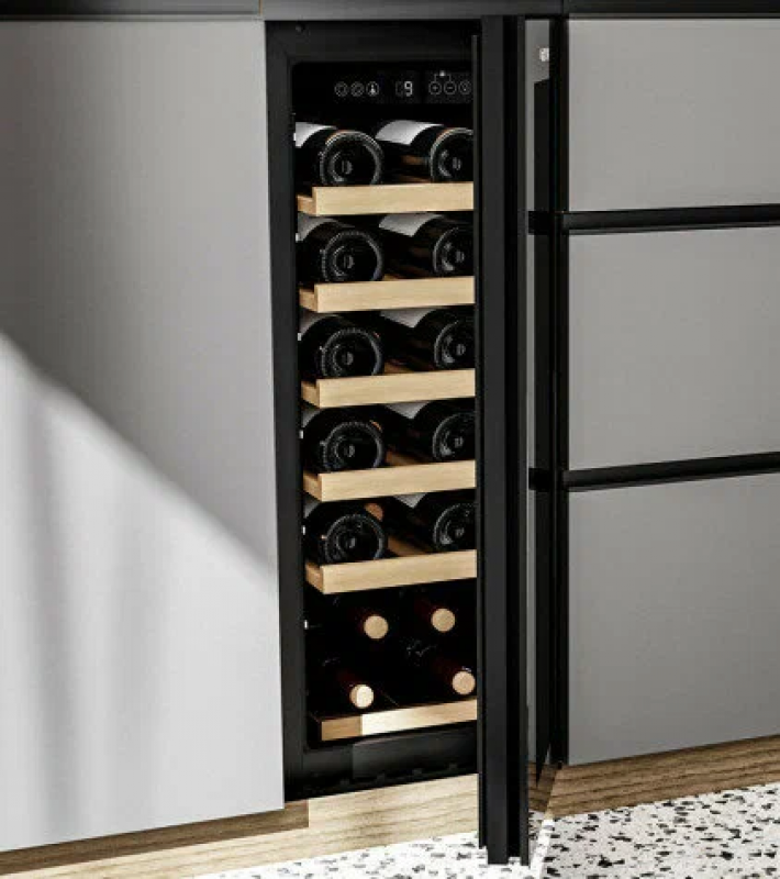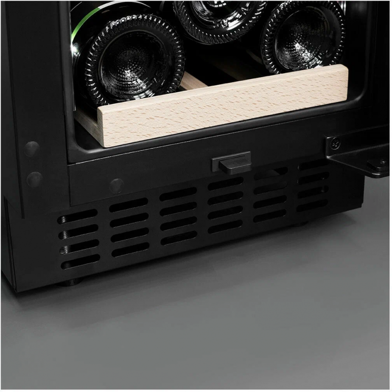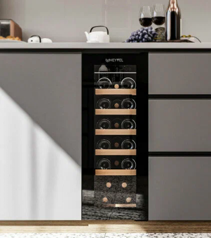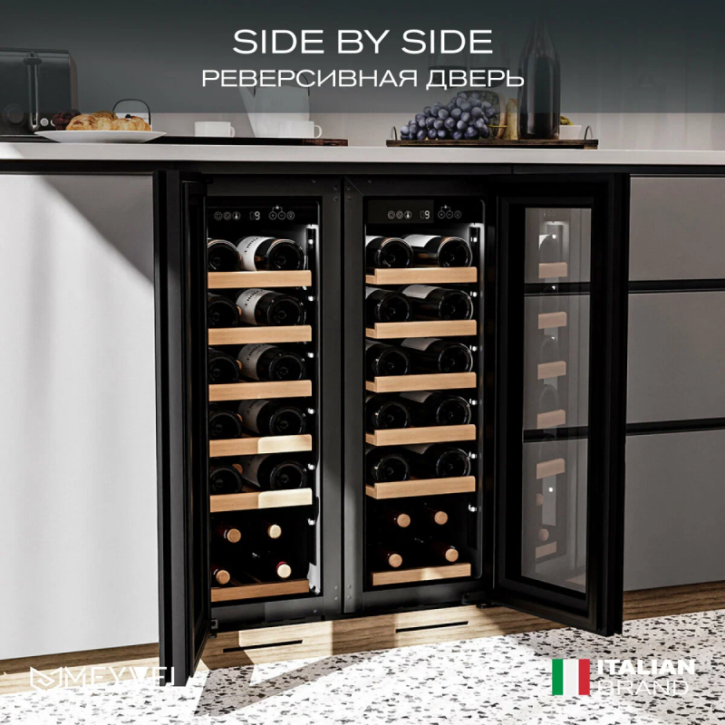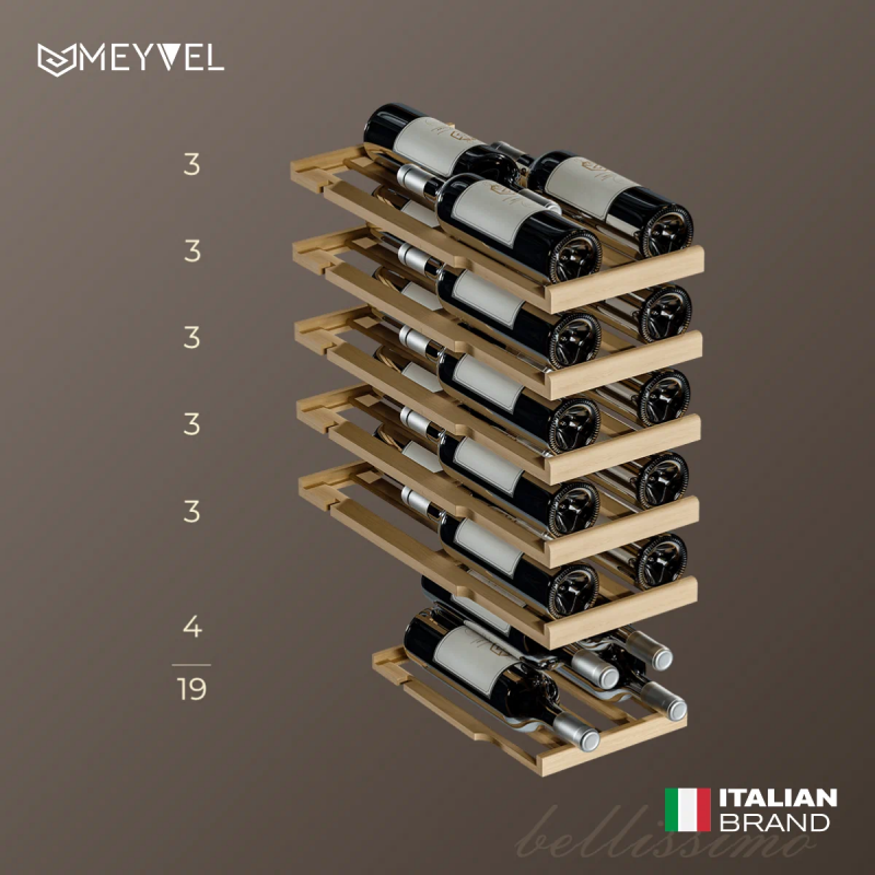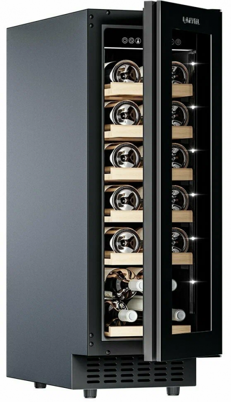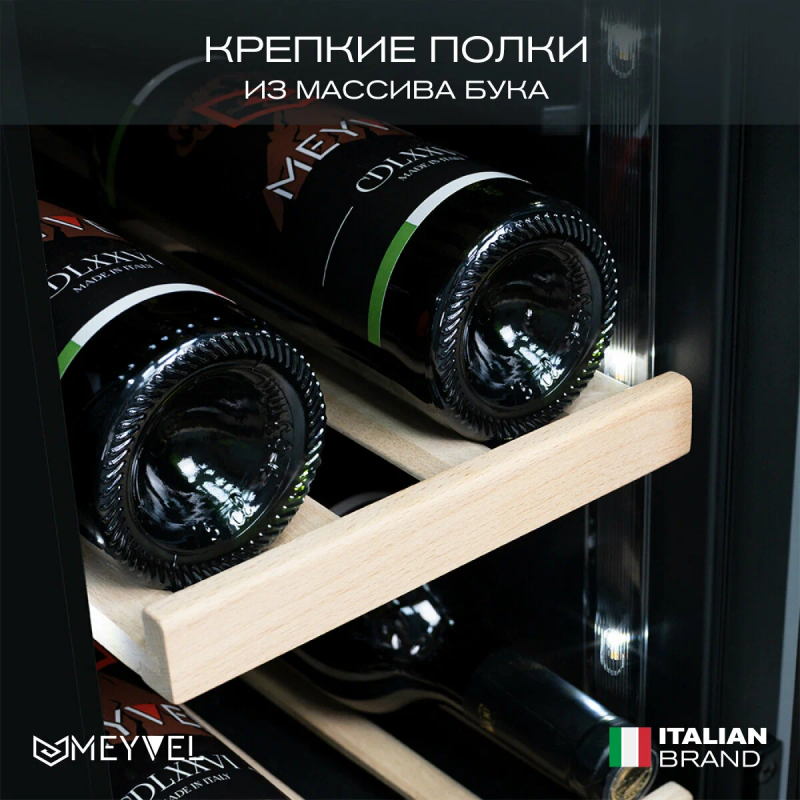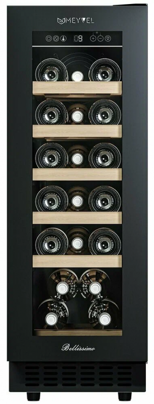 Модель MV19NH-KBT1 имеет привлекательный внешний вид, сочетающий в себе неподвластное времени очарование натуральных материалов с высокотехнологичными системами сохранения продуктов. Винный холодильник Meyvel MV19NH-KBT1 оснащен дверью с защитой от ультрафиолетовых лучей и отлично подойдет для хранения и созревания различных сортов вин. Динамическая система охлаждения обеспечивает оптимальную температуру для вина и сохраняет необходимую влажность внутри камеры.Универсальный микроклиматКомпрессорный винный шкаф Meyvel MV19NH-KBT1 обладает оптимальной вместимостью и даёт возможность разместить до 19 бутылок стандартного типа Бордо (0,75 л). Располагаются они на выдвижных полках из дерева. Внутреннее пространство шкафа поддерживает комфортную для вина температуру от 5C до 20C. Так же, эта модель поддерживает влажность в диапазоне 60-80, как в настоящем винном погребе.Сенсорный дисплейБыстро задавайте необходимую температуру для содержимого и управляйте всеми функциями холодильника с помощью интуитивно-понятного расположения клавиш на сенсорном дисплее.Комфортное расположениеMeyvel MV19NH-KBT1 отлично подходит для расположения на любой кухне, модель имеет утопленную в дверце ручку, что придаёт встроенному шкафу более гармоничный вид. Шкаф можно встроить под столешницу, а так же, перенавесить дверь для более удобного использования (петли входят в комплект).Особенности:Возможность как встроить шкаф под столешницу, так и установить отдельно;Углубленный цоколь;Температурный режим от 5C до 20C;Удобное сенсорное управление;Электронный термостат;Демонстрационное освещение;Панорамное освещение;Перенавешиваемая дверь (петли в комплекте);Регулируемые ножки;Тройное стекло с УФ-фильтром;Выдвижные полкиОбратите внимание:прежде чем устанавливать винный шкаф, ознакомьтесь с указанными в инструкции показателями напряжения (В) и частоты (Гц) и убедитесь в том, что они совпадают с уровнем показателей в Вашем доме;не наклоняйте винный шкаф более чем на 45;не устанавливайте винный шкаф вблизи с нагревающимися электроприборами, а также в зоне прямого попадания солнечных лучей;необходимо установить винный шкаф по уровню и отрегулировать зазоры между дверью и мебельным фасадом, чтобы не повредить их.Общие данные:Размеры:высота: 82 смширина: 29,5 смглубина: 57,8 смОбъем, л: 58Максимальное количество бутылок: 19Тип управления: электронныйКласс энергоэффективности: AКлиматический класс: N-ST (от 16C до 38C)Энергопотребление, кВт/год: 108Количество температурных зон: 1Диапазон температуры, C: от 5 до 20Тип системы охлаждения: КомпрессорныйВинное отделение:Количество полок: 6Материал полок: Дерево (массив бука)Тип полок: Выдвижные, Мини-полкаВид охлаждения: ДинамическийДемонстрационное освещениеЦвет освещения: Белый/Синий/ЯнтарныйПанорамное освещениеУгольный фильтрДополнительная информация:Установка: Встраиваемая, ОтдельностоящаяВстроенная система вентиляцииМатериал корпуса: стальЦвет корпуса: ЧёрныйРамка двери: ЧёрныйПеренавешиваемая дверьСтекло: Тройное с УФ-фильтромТип управления: СенсорныйСигнализация открытой двериСигнализация отклонения температурыБлокировка панели управленияРежим Эко ДемоПамять настроекДиапазон влажности, : 60-80Углублённый цокольРегулируемые ножкиУровень шума, дБ: 40Хладагент: R600A