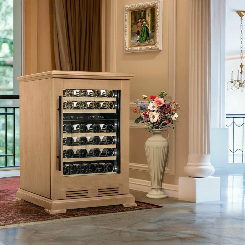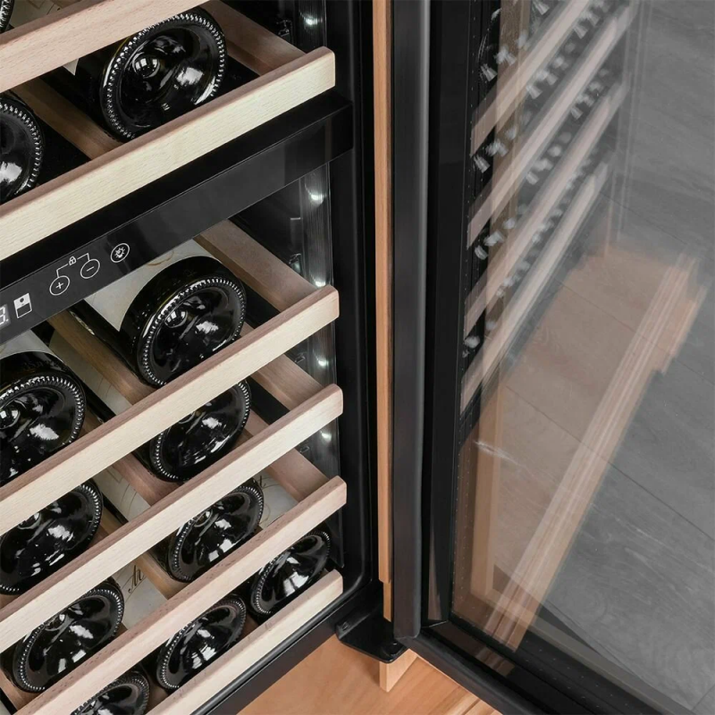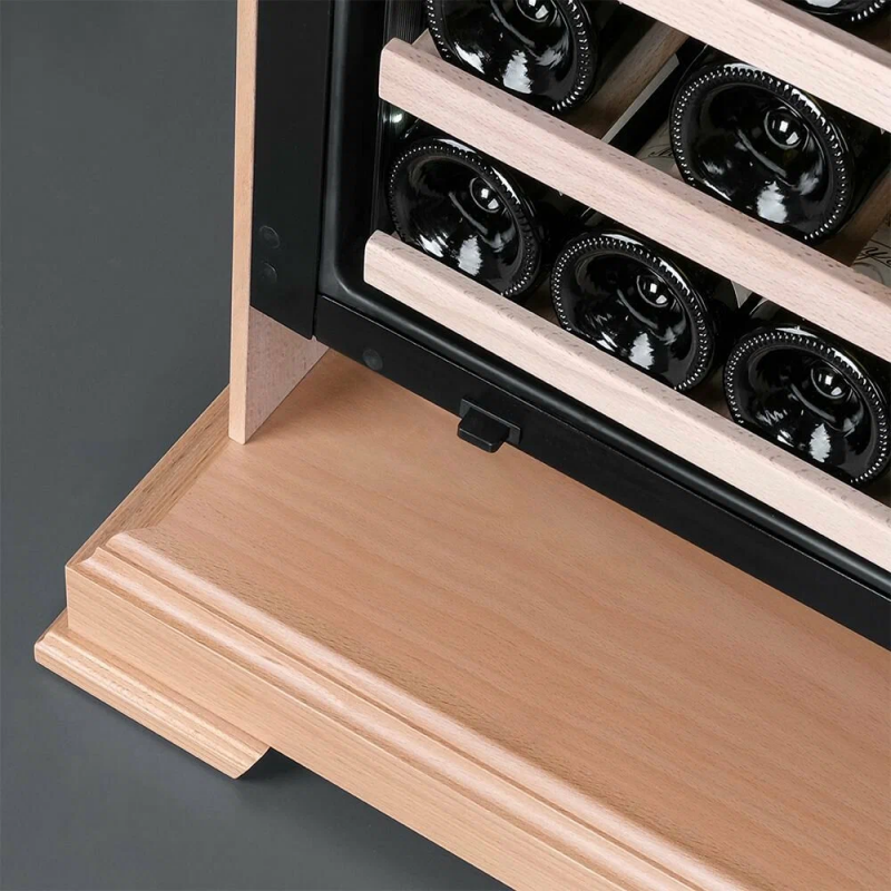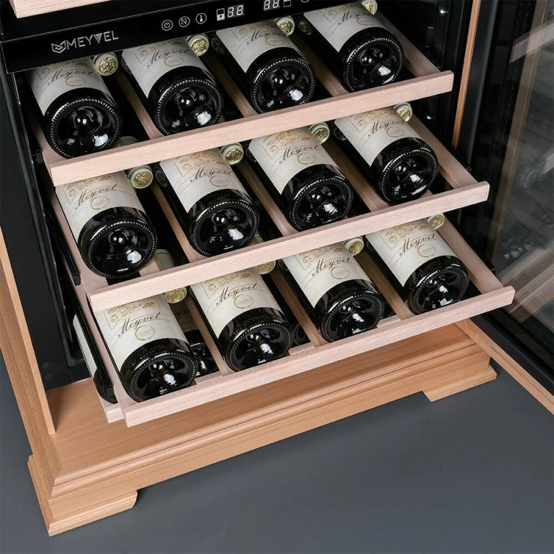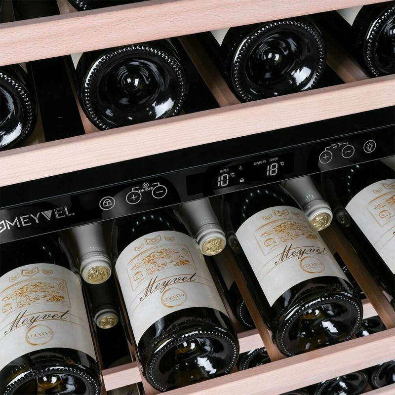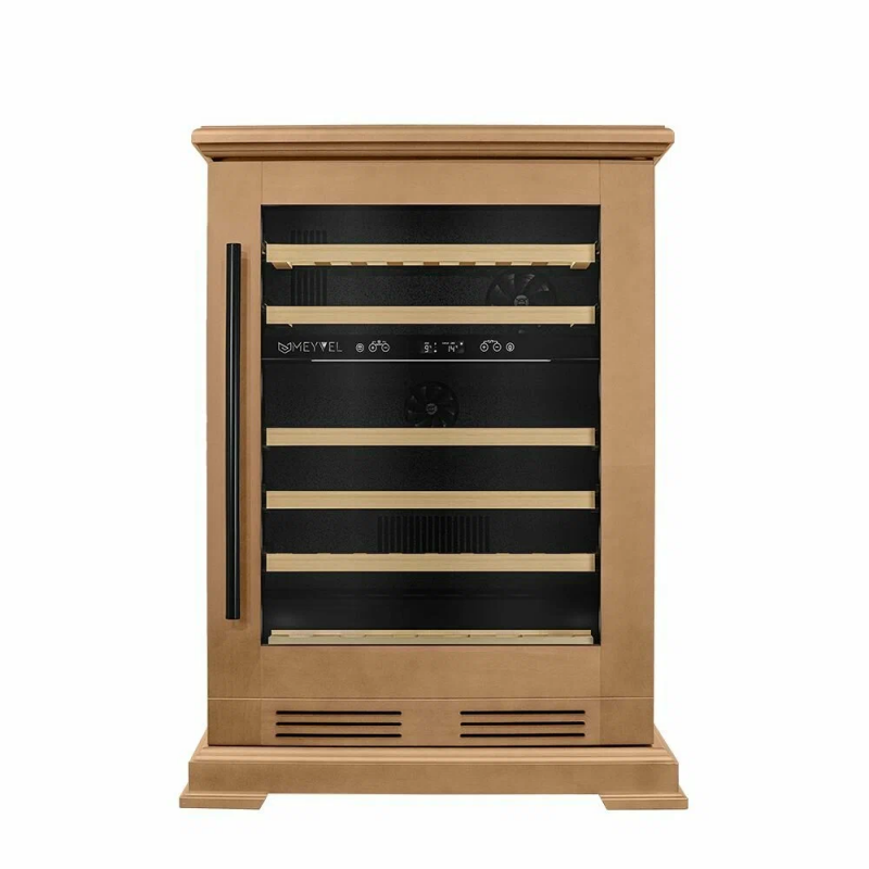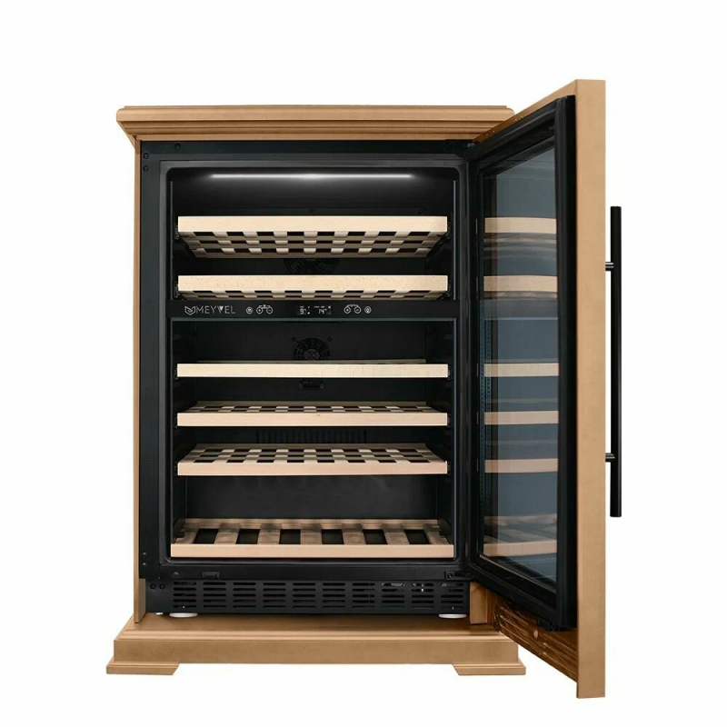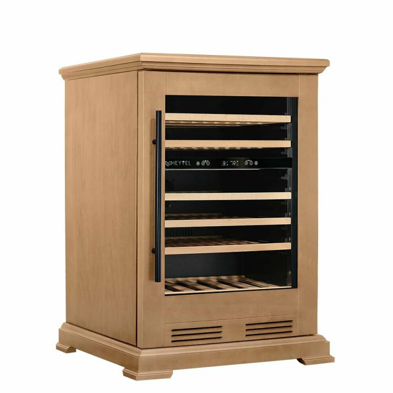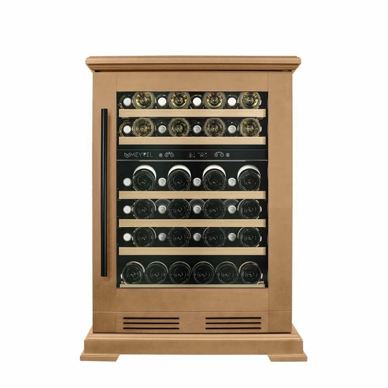 Винный шкаф Meyvel MV46PRO-KBT2 (Натуральный бук) Модель MV46PRO-KBT2 (Натуральный бук) имеет привлекательный внешний вид, сочетающий в себе неподвластное времени очарование натуральных материалов с высокотехнологичными системами сохранения продуктов. Винный холодильник Meyvel MV46PRO-KBT2 (Натуральный бук) оснащен дверью с защитой от ультрафиолетовых лучей и отлично подойдет для хранения и созревания различных сортов вин. Динамическая система охлаждения обеспечивает оптимальную температуру для вина и сохраняет необходимую влажность внутри камеры. Универсальный микроклимат Компрессорный винный шкаф Meyvel MV46PRO-KBT2 (Натуральный бук) обладает большой вместимостью и даёт возможность разместить до 46 бутылок стандартного типа Бордо (0,75 л). Располагаются они на выкатных полках из дерева. Внутреннее пространство шкафа разделено на 2 температурные зоны, с возможностью настраивать каждую из них. Диапазон верхней зоны варьируется от +5°C до +12°C, а нижней - от +12°C до +20°C. Сенсорный дисплей Быстро задавайте необходимую температуру для содержимого и управляйте всеми функциями холодильника с помощью интуитивно-понятного расположения клавиш на сенсорном дисплее. Фильтрация поступающего воздуха В винный шкаф встроен угольный фильтр, который будет очищать поступающий воздух от посторонних запахов, которые губительно влияют на вкусовые качества вина. Рекомендуем проводить замену фильтра 1 раз в год. Преимущества винного шкафа Meyvel MV46PRO-KBT2 (Натуральный бук) Вместимость 46 бутылок стандартного типа Бордо (0,75 л); Две температурные зоны; Тройное стекло с УФ-фильтром; Общий температурный режим от +5°C до +20°C; Удобное сенсорное управление; Световой и звуковой сигналы при открытой двери (более 2 минут); Электронный термостат; Удобное обозначение зон на сенсорной панели; Угольный фильтр; Демонстрационное освещение; Панорамное освещение; Выдвижные полки; Гарантия 2 года. Обратите внимание прежде чем устанавливать винный шкаф, ознакомьтесь с указанными в инструкции показателями напряжения (В) и частоты (Гц) и убедитесь в том, что они совпадают с уровнем показателей в Вашем доме; не наклоняйте винный шкаф более чем на 45°; не устанавливайте винный шкаф вблизи с нагревающимися электроприборами, а также в зоне прямого попадания солнечных лучей.