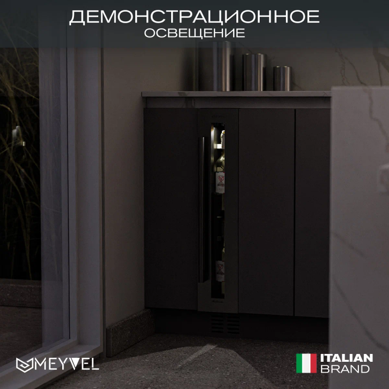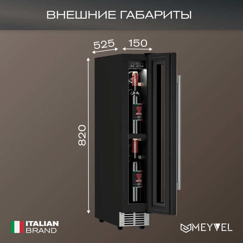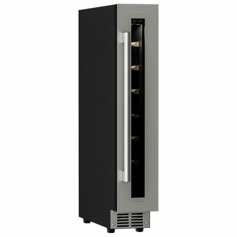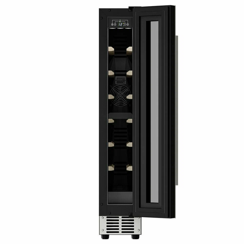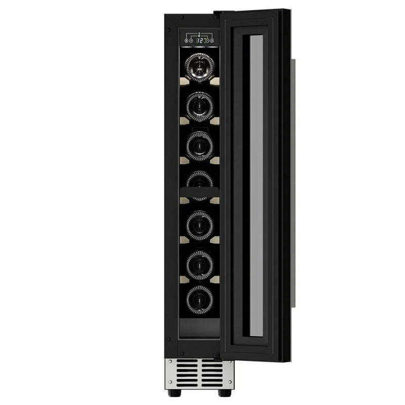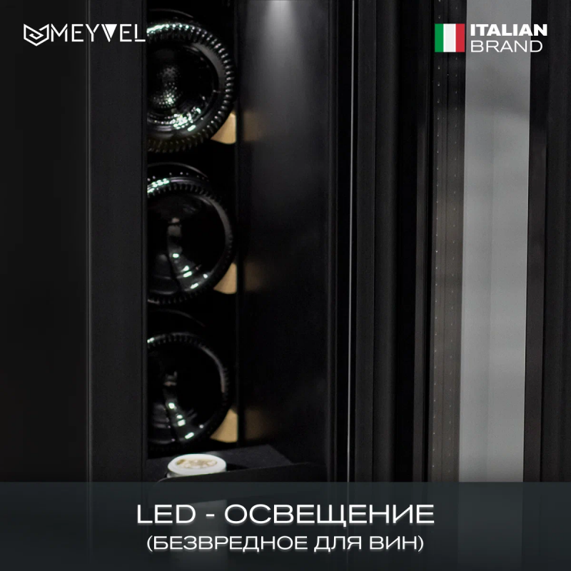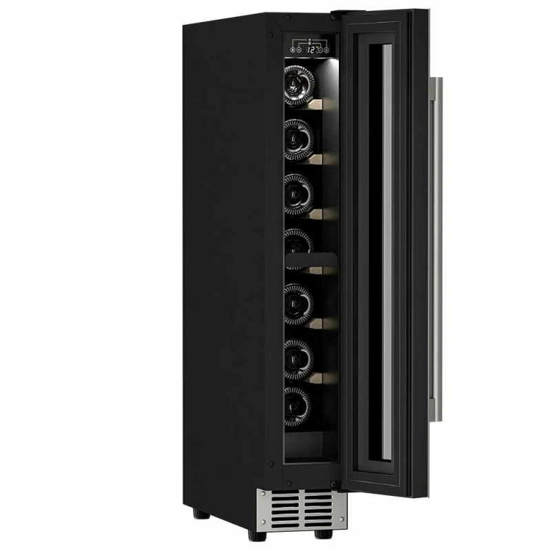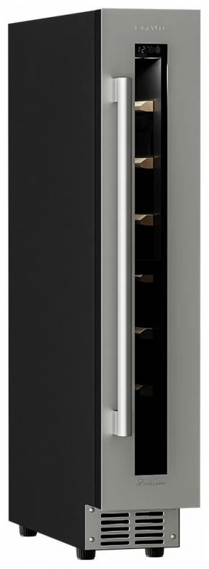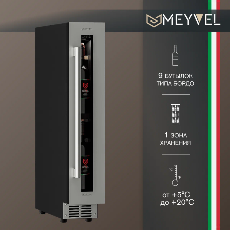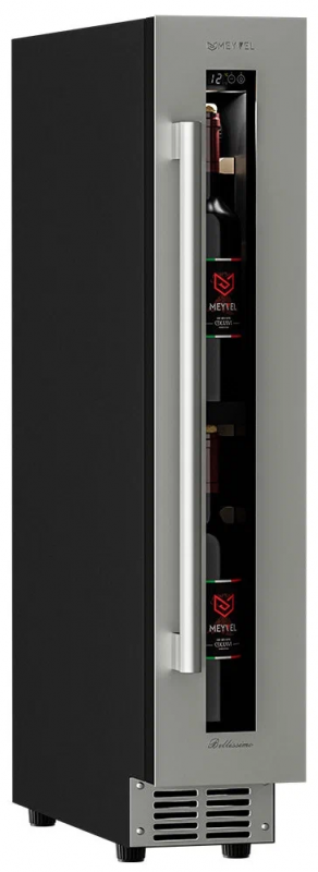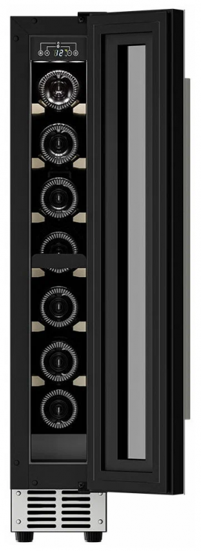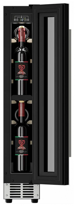 Винный шкаф Meyvel MV9-KST1 Модель MV9-KST1 имеет привлекательный внешний вид, сочетающий в себе неподвластное времени очарование натуральных материалов с высокотехнологичными системами сохранения продуктов. Винный холодильник Meyvel MV9-KST1 оснащен дверью с защитой от ультрафиолетовых лучей и отлично подойдет для хранения и созревания различных сортов вин. Динамическая система охлаждения обеспечивает оптимальную температуру для вина и сохраняет необходимую влажность внутри камеры. Универсальный микроклимат Компрессорный винный шкаф Meyvel MV9-KST1 несмотря на небольшой размер, обладает большой вместимостью и дает возможность разместить до 9 бутылок. Располагаются они на держателях из массива бука. Внутреннее пространство шкафа поддерживает комфортную для вина температуру от +5℃ до +20℃ и имеет самую большую вместимость среди аналогичных винных шкафов. Преимуществом этой модели является возможность разместить внутри одну высокую бутылку. Так же, MV9-KST1 данная модель поддерживает влажность в диапазоне 60-80%, как в настоящем винном погребе. Сенсорный дисплей Быстро задавайте необходимую температуру для содержимого и управляйте всеми функциями холодильника с помощью интуитивно-понятного расположения клавиш на сенсорном дисплее. Преимущества винного шкафа Meyvel MV9-KST1 Вместимость 9 бутылок 0,75 л; Возможность как встроить шкаф под столешницу, так и установить его отдельно; Углубленный цоколь; Демонстрационное освещение; Температурный режим от +5°C до +20°C; Компактный размер и привлекательный дизайн; Удобное сенсорное управление; Автоматическая разморозка; Тройное стекло с УФ-фильтром; Набор запасных логотипов для перенавешивания двери; Держатели из массива бука. Обратите внимание: прежде чем устанавливать винный шкаф, ознакомьтесь с указанными в инструкции показателями напряжения (В) и частоты (Гц) и убедитесь в том, что они совпадают с уровнем показателей в Вашем доме; не наклоняйте винный шкаф более чем на 45°; не устанавливайте винный шкаф вблизи с нагревающимися электроприборами, а также в зоне прямого попадания солнечных лучей; необходимо установить винный шкаф по уровню и отрегулировать зазоры между дверью и мебельным фасадом, чтобы не повредить их. Meyvel оставляет за собой право изменять параметры без предварительного уведомления.