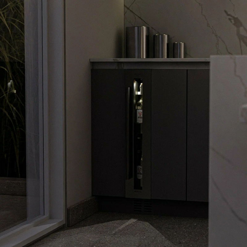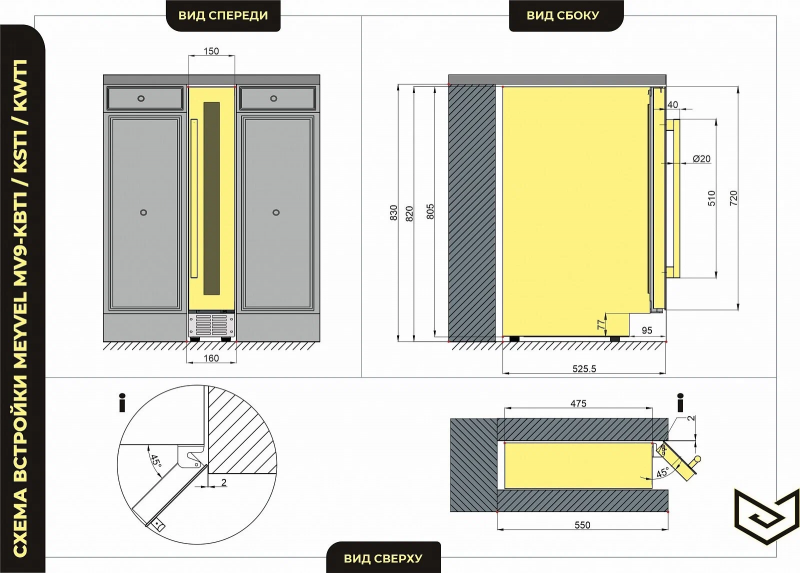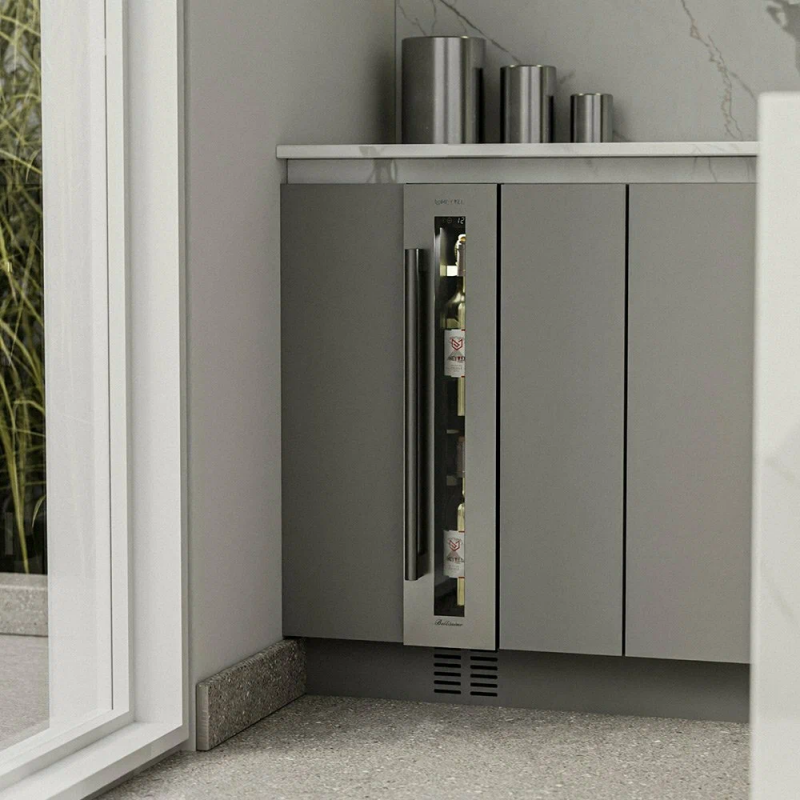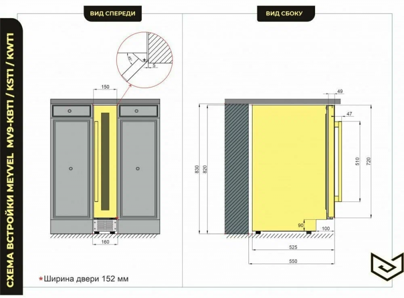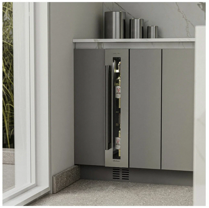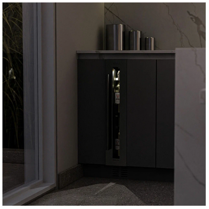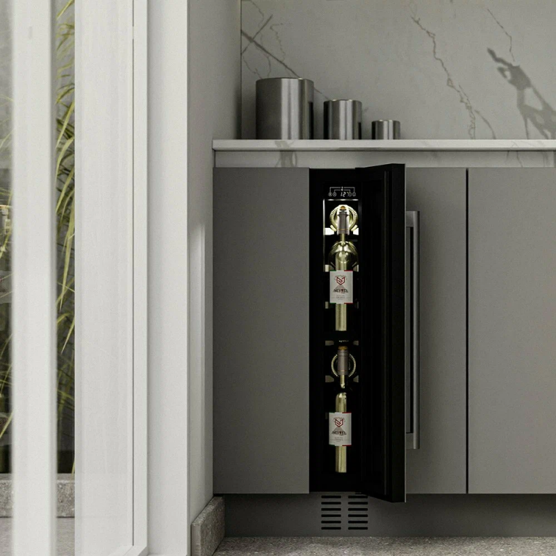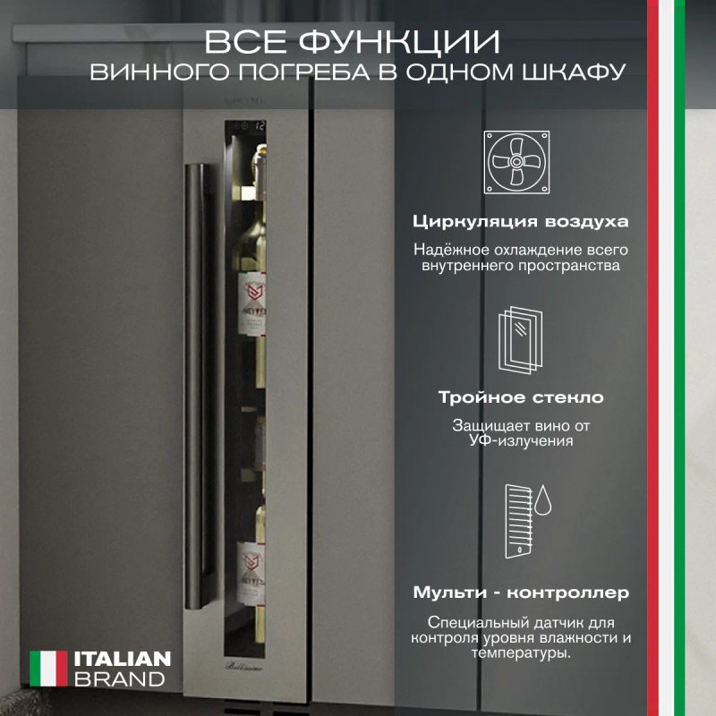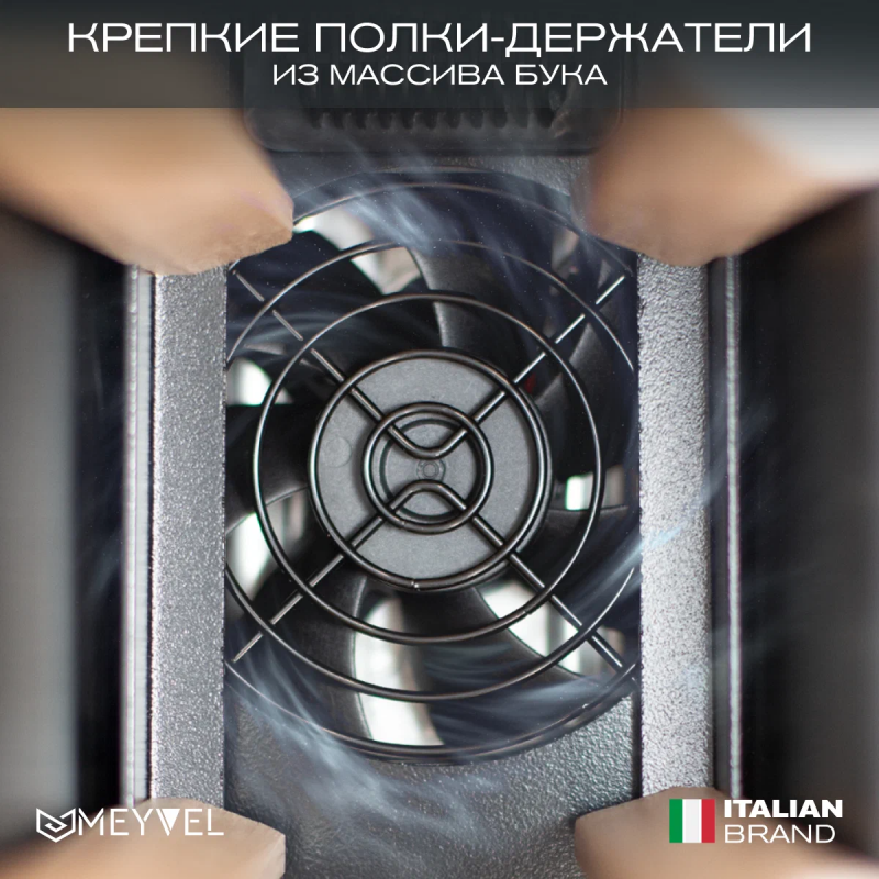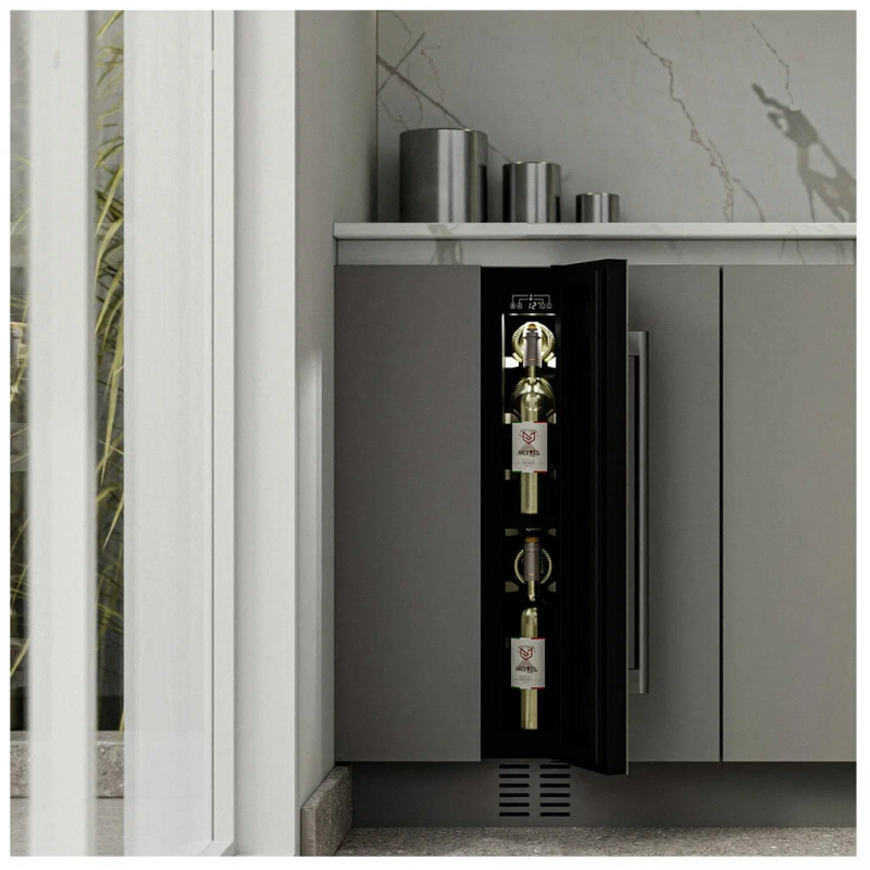 Винный шкаф Meyvel MV9-KST1 Модель MV9-KST1 имеет привлекательный внешний вид, сочетающий в себе неподвластное времени очарование натуральных материалов с высокотехнологичными системами сохранения продуктов. Винный холодильник Meyvel MV9-KST1 оснащен дверью с защитой от ультрафиолетовых лучей и отлично подойдет для хранения и созревания различных сортов вин. Динамическая система охлаждения обеспечивает оптимальную температуру для вина и сохраняет необходимую влажность внутри камеры. Универсальный микроклимат Компрессорный винный шкаф Meyvel MV9-KST1 несмотря на небольшой размер, обладает большой вместимостью и дает возможность разместить до 9 бутылок. Располагаются они на держателях из массива бука. Внутреннее пространство шкафа поддерживает комфортную для вина температуру от +5℃ до +20℃ и имеет самую большую вместимость среди аналогичных винных шкафов. Преимуществом этой модели является возможность разместить внутри одну высокую бутылку. Так же, MV9-KST1 данная модель поддерживает влажность в диапазоне 60-80%, как в настоящем винном погребе. Сенсорный дисплей Быстро задавайте необходимую температуру для содержимого и управляйте всеми функциями холодильника с помощью интуитивно-понятного расположения клавиш на сенсорном дисплее. Преимущества винного шкафа Meyvel MV9-KST1 Вместимость 9 бутылок 0,75 л; Возможность как встроить шкаф под столешницу, так и установить его отдельно; Углубленный цоколь; Демонстрационное освещение; Температурный режим от +5°C до +20°C; Компактный размер и привлекательный дизайн; Удобное сенсорное управление; Автоматическая разморозка; Тройное стекло с УФ-фильтром; Набор запасных логотипов для перенавешивания двери; Держатели из массива бука. Обратите внимание: прежде чем устанавливать винный шкаф, ознакомьтесь с указанными в инструкции показателями напряжения (В) и частоты (Гц) и убедитесь в том, что они совпадают с уровнем показателей в Вашем доме; не наклоняйте винный шкаф более чем на 45°; не устанавливайте винный шкаф вблизи с нагревающимися электроприборами, а также в зоне прямого попадания солнечных лучей; необходимо установить винный шкаф по уровню и отрегулировать зазоры между дверью и мебельным фасадом, чтобы не повредить их. Meyvel оставляет за собой право изменять параметры без предварительного уведомления.