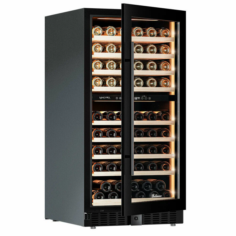Модель MV99PRO-KBT2 имеет привлекательный внешний вид, сочетающий в себе неподвластное времени очарование натуральных материалов с высокотехнологичными системами сохранения продуктов. Винный холодильник Meyvel MV99PRO-KBT2 оснащен дверью с защитой от ультрафиолетовых лучей и отлично подойдет для хранения и созревания различных сортов вин. Динамическая система охлаждения обеспечивает оптимальную температуру для вина и сохраняет необходимую влажность внутри камеры.Универсальный микроклиматКомпрессорный винный шкаф Meyvel MV99PRO-KBT2 обладает большой вместимостью и способен разместить до 99 бутылок. Располагаются они на полках из массива бука. Внутреннее пространство шкафа разделено на 2 температурные зоны с возможностью настройки в диапазоне от + 5C до +20C. Холодильник поддерживает влажность в диапазоне 60-80%, как в настоящем винном погребе.Сенсорный дисплейБыстро задавайте необходимую температуру для содержимого и управляйте всеми функциями холодильника с помощью интуитивно-понятного расположения клавиш на сенсорном дисплее.Преимущества винного шкафа Meyvel MV99PRO-KBT2:Идеально подходит для дома и для ресторана;Можно установить в нишу или отдельно;Две температурные зоны для хранения вин и подготовки их к подаче;Полки из массива бука на метабоксах отлично гасят вибрацию;Полка с увеличенным пространством (в каждой зоне) для нестандартных бутылок;Панорамное освещение для максимальной демонстрации винной коллекции;3 цвета освещения на выбор (белый /синий / янтарный);3 стекла для максимальной защиты от ультрафиолета;Угольный фильтр для устранения посторонних запахов;Зимний режим для сохранения заданного температурного режима в неотапливаемых помещениях;Сигнализация отклонения температуры;Сигнализация открытой двери;Память настроек (при отключении питания все настройки сохранятся);Автоматическая разморозка;Ручка и замок в цвет корпуса;
