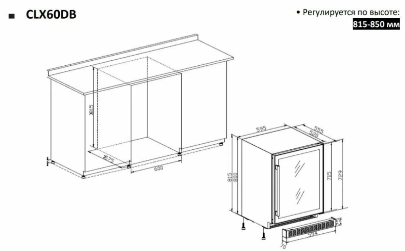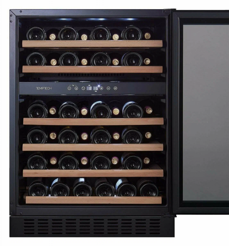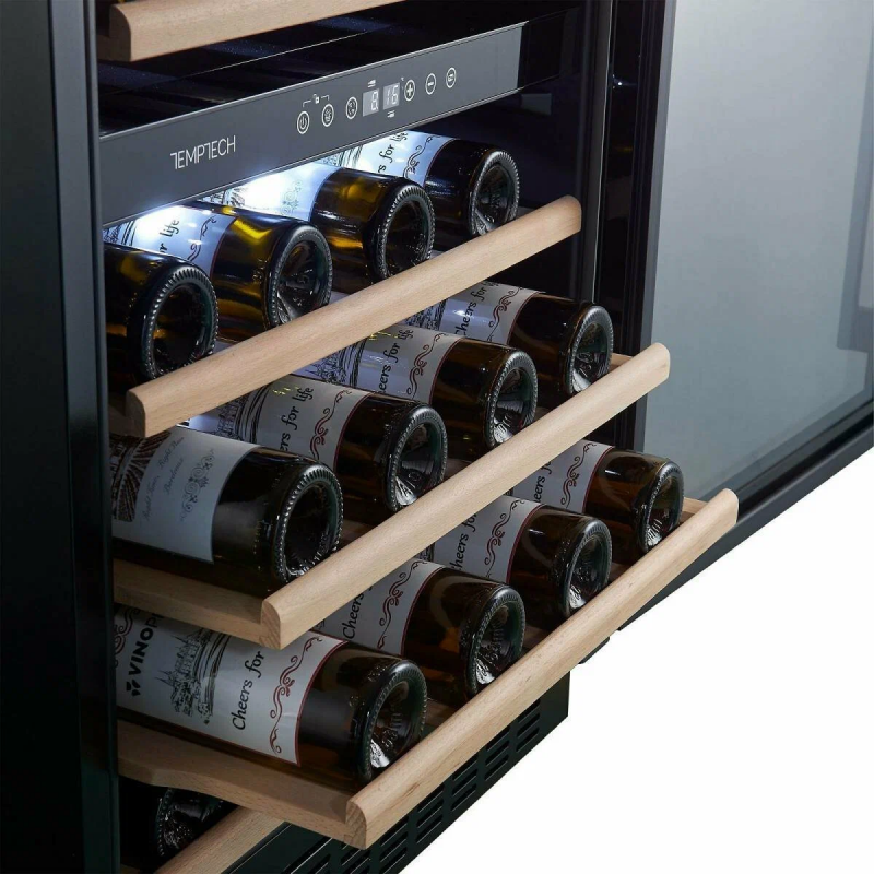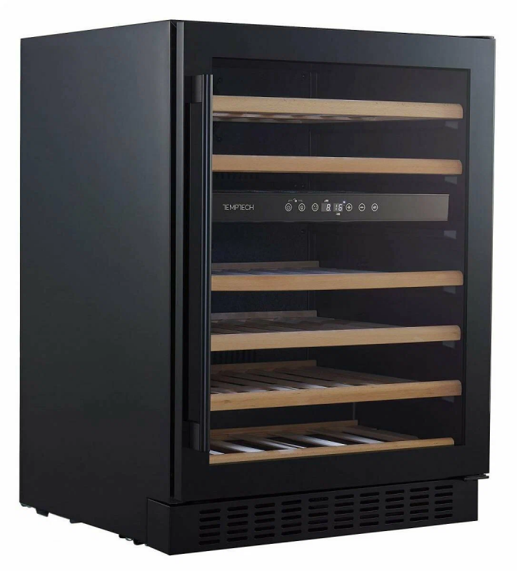 Винный шкаф Temptech CLX60DB — это стильное и функциональное решение для хранения вашей винной коллекции. Шкаф имеет две температурные зоны: 5–12°C и 12–20°C, что позволяет создать идеальные условия для хранения разных видов вин. Вместимость шкафа составляет до 46 бутылок. Шкаф выполнен в современном дизайне с передней панелью из чёрного стекла и полками из бука. Внутренняя светодиодная подсветка создаёт приятную атмосферу. Сенсорная панель и цифровой дисплей обеспечивают удобное управление и контроль параметров. Важным преимуществом этого винного шкафа является его способность поддерживать стабильную температуру, оптимальную влажность и низкий уровень вибрации, что позволяет сохранить вино в идеальном состоянии. Дверца шкафа оснащена двойным стеклом с УФ-фильтром, который защищает вино от вредных ультрафиолетовых лучей и тепла. Активный вентилятор равномерно распределяет температуру внутри шкафа, поддерживая оптимальные условия для хранения вина. Уровень влажности составляет 50–70%, что также способствует сохранению качества вина. Дополнительные параметры Количество зон: две Температурный режим: +5.+20 °C (верх. 5-12/ ниж. 12-20) Количество бутылок: 46 шт. Условие эксплуатации: +16.+38 °C Возможность встроить: есть Хладагент (доза): R600a (29 гр.) Охлаждение: динамическое Вид охлаждения: компрессорное Дверь: стеклянная в черной раме, стекло с защитой от УФ (высота 715 мм) Ручка двери: навесная, черная Полки: деревянные из Бука, 6 шт. Подсветка: светодиодная, верхняя, белая Объем: 135 л. Внутренняя влажность: 40-80 % (регулировка через емкость с водой, в комплекте нет) Потребляемая мощность: 100 Вт Энергопотребление в сутки: 0,397 кВт Энергетический класс: G (по таблице классов с 2021г) Номинальное напряжение: 220 В, 50 Гц Корпус: черный, металлический Разморозка: автоматическая Угольный фильтр: нет Зимний режим: нет Перевеска двери: есть Замок: нет Управление: сенсорное и через приложение Vinotag по wi-fi Уровень шума: 38 дБ Страна сборки: Китай Сигнал тревоги: визуальный и звуковой Защита от детей: блокировка кнопок Размеры (ШхГхВ): 595х555х815 мм Масса (без упк./в упк.): 46 / 49 кг Размеры ниши (ШхГхВ): 600х580х820 мм Размер в упаковке (ШхГхВ): 660х625х880 мм Гарантия производителя: 2 года