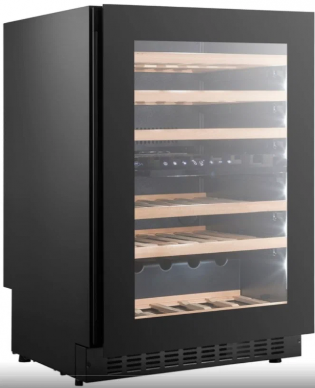 Стильный дизайн с передней панелью из черного стекла со встроенной ручкой, полками из натурального дерева и внутренней светодиодной подсветкой.