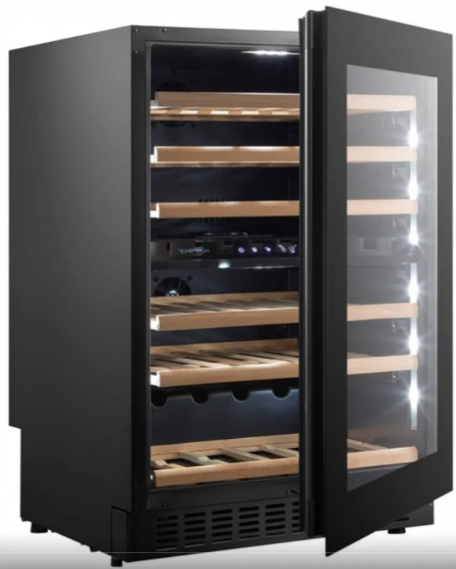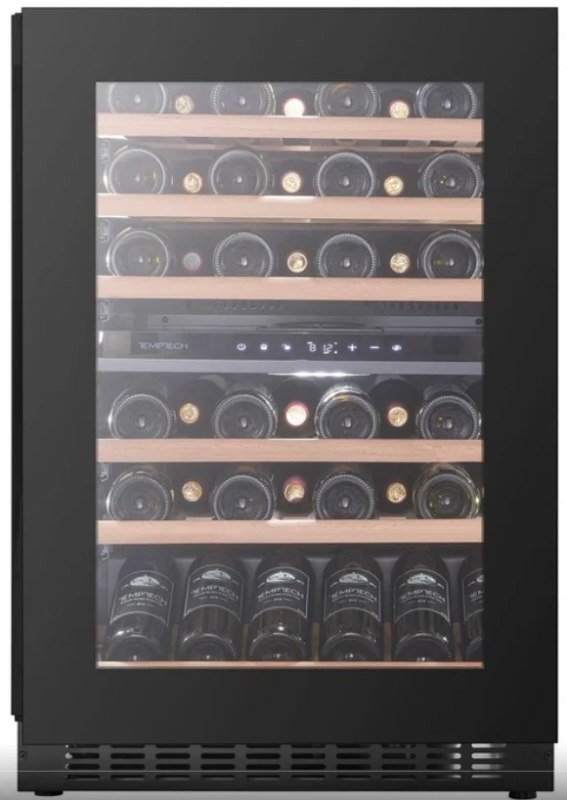 Винный шкаф Temptech SKX6080DRB с двумя температурными зонами (5-12°C, 12-20°C) и вместимостью до 46 бутылок вина.