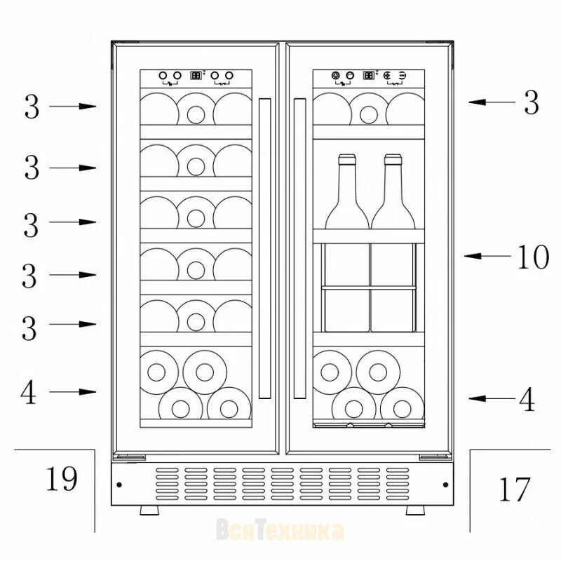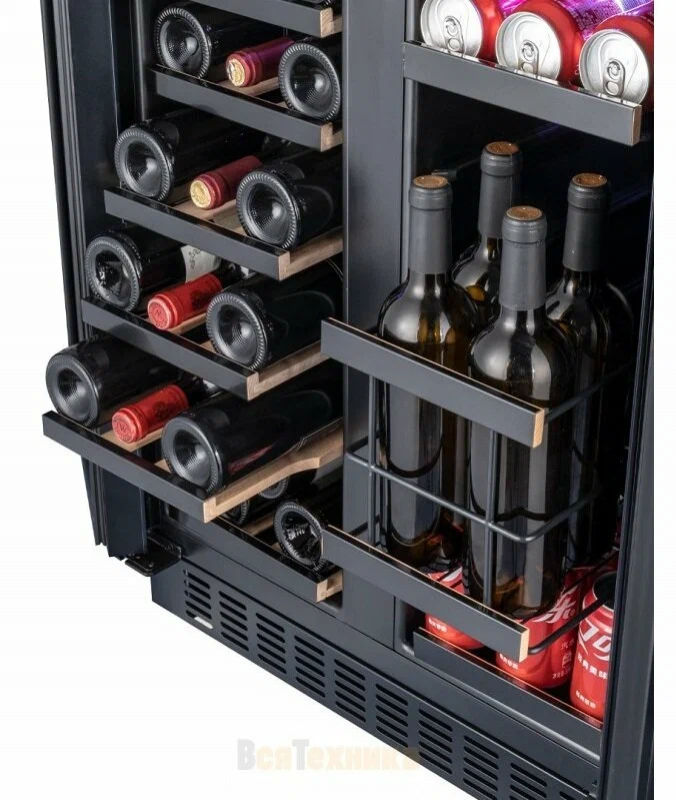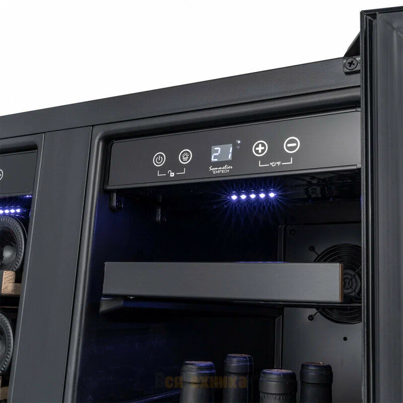 Дверцы шкафа с тройным стеклом и УФ-фильтром защищает вино от вредных ультрафиолетовых лучей и тепла, которые могут проникнуть внутрь холодильника.