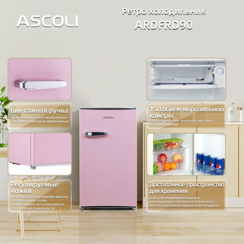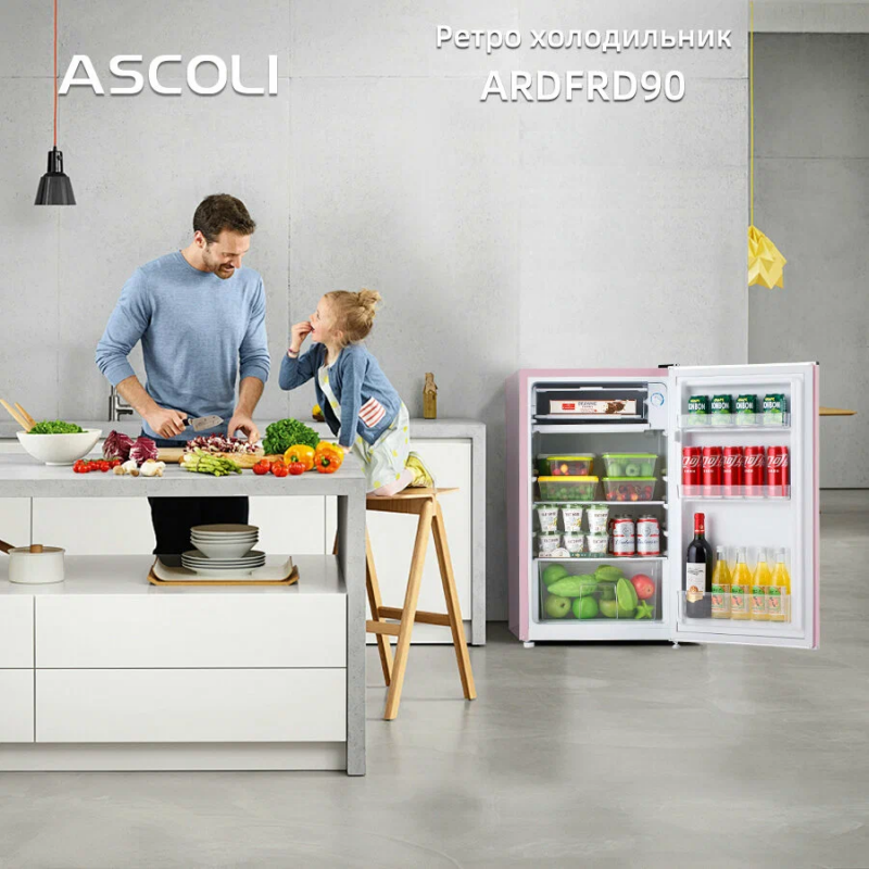 Холодильник однокамерный Ascoli ADFRD90 выполнен в ретро дизайне, что делает его стильным и необычным элементом интерьера.Компактные размеры (высота 83,3 см, ширина 47,4 см, глубина 44,7 см) позволяют разместить холодильник даже на небольшой кухне. Общий объем составляет 92 литра, из которых 85 литров приходится на холодильную камеру.Холодильник Ascoli ADFRD90 оснащен механическим типом управления, что делает его простым и удобным в использовании. Класс энергопотребления A гарантирует экономичное потребление энергии (110 кВтч в год).В холодильнике предусмотрено ручное размораживание, что упрощает процесс ухода за ним. Полки из закаленного стекла и ящик для овощей и фруктов обеспечивают удобное хранение продуктов.Уровень шума составляет всего 42 дБ, что делает работу холодильника практически бесшумной.Холодильник Ascoli ADFRD90 выполнен из металла с покрытием, что обеспечивает его долговечность и надежность.