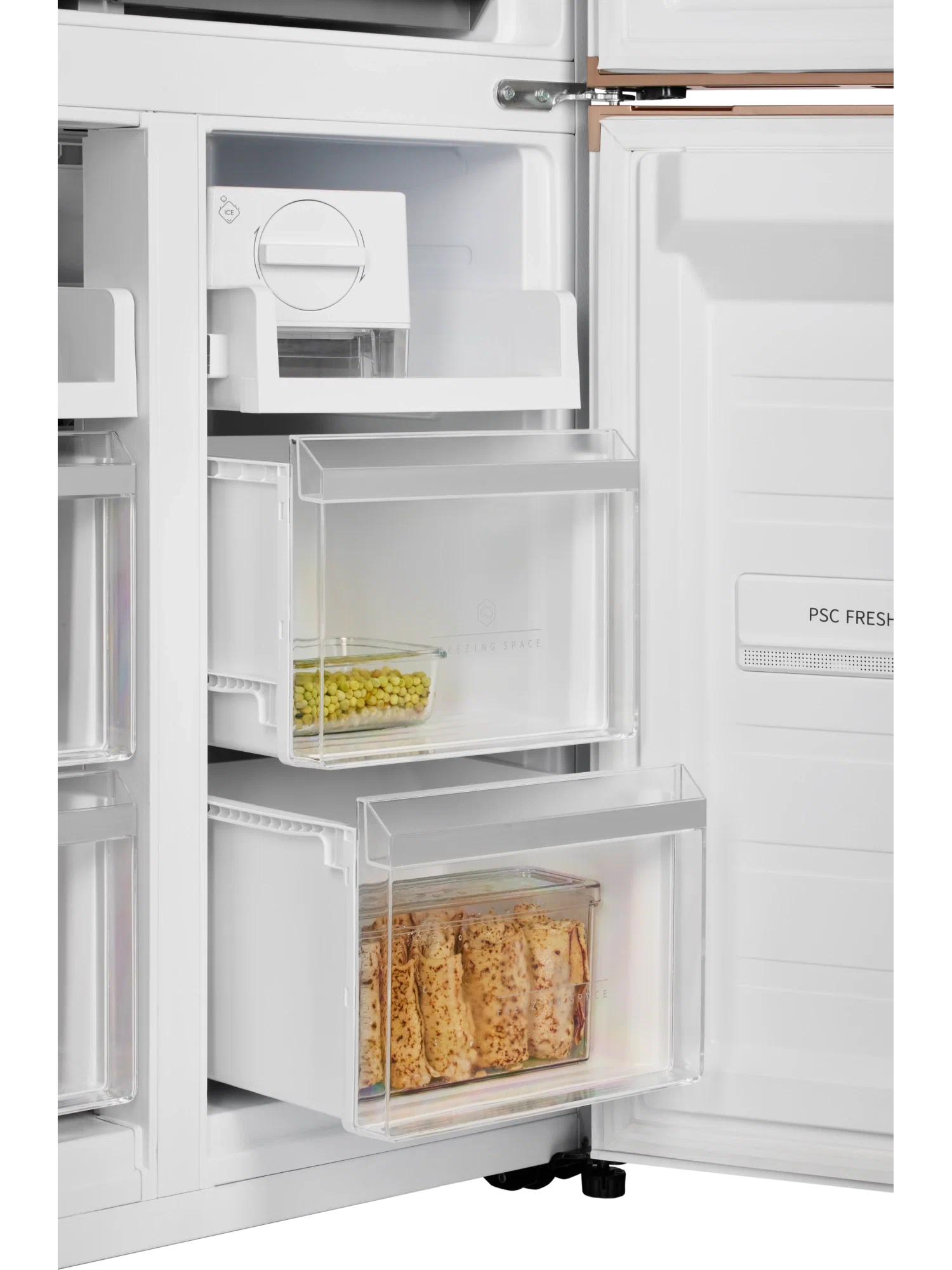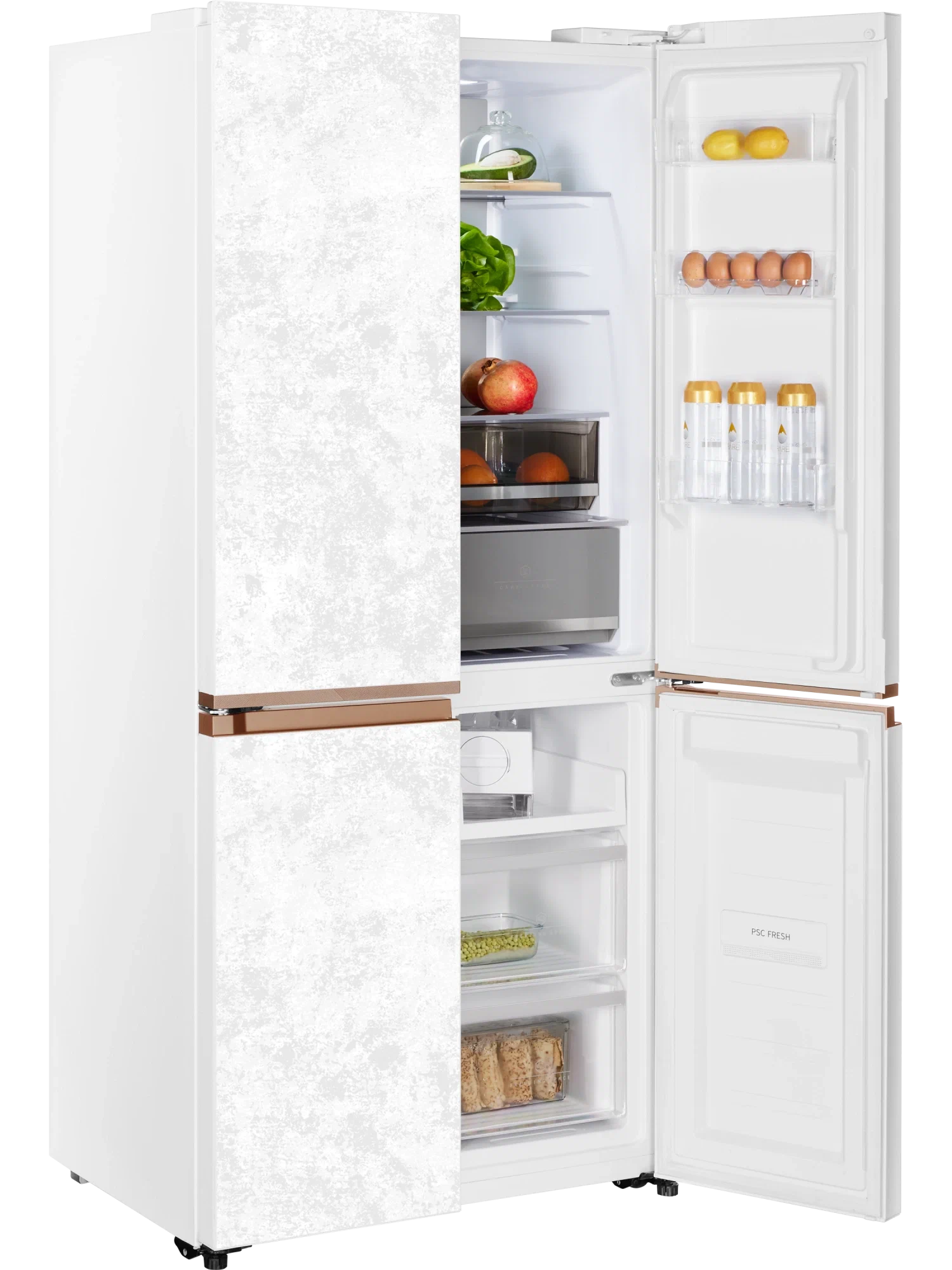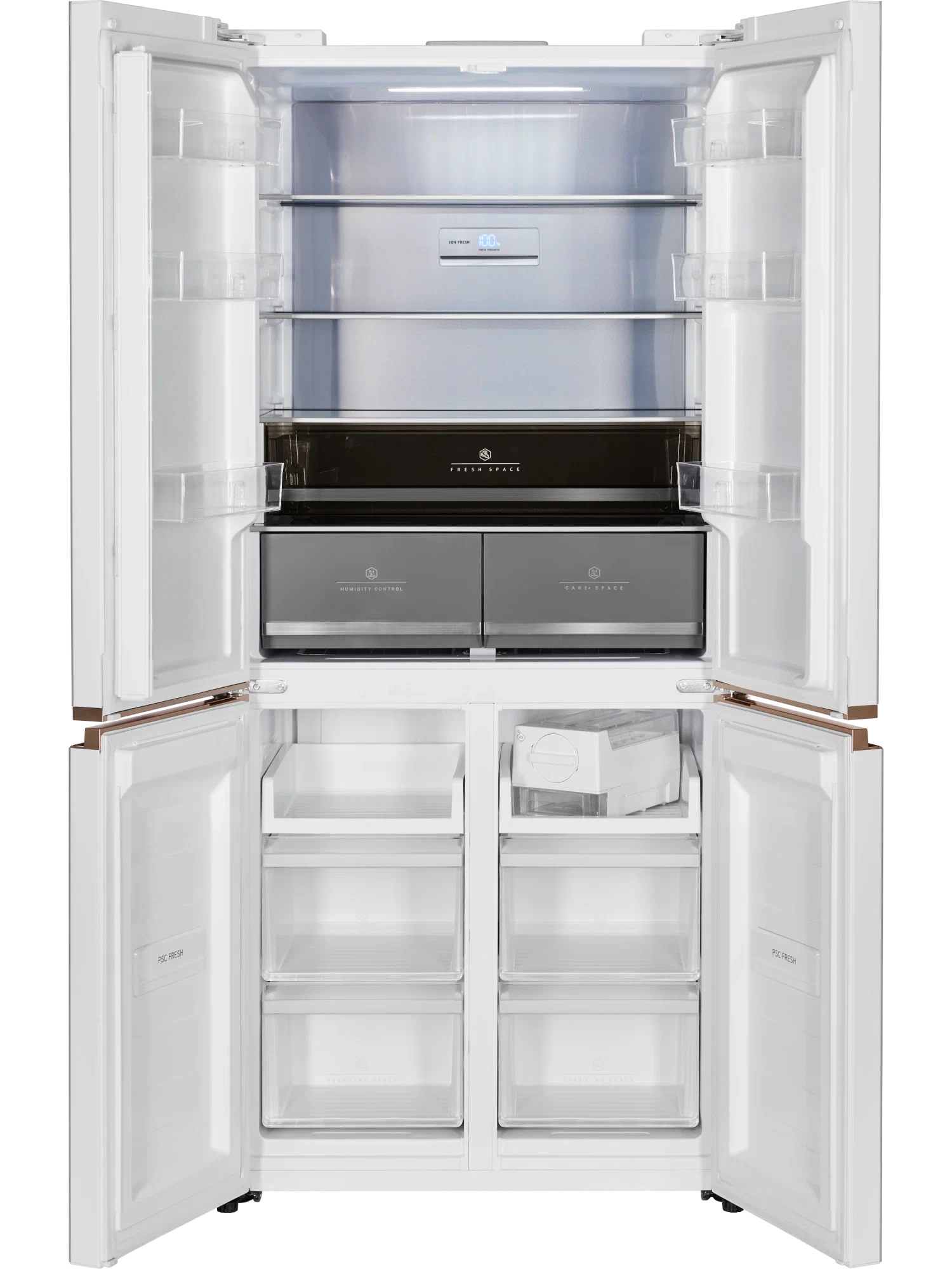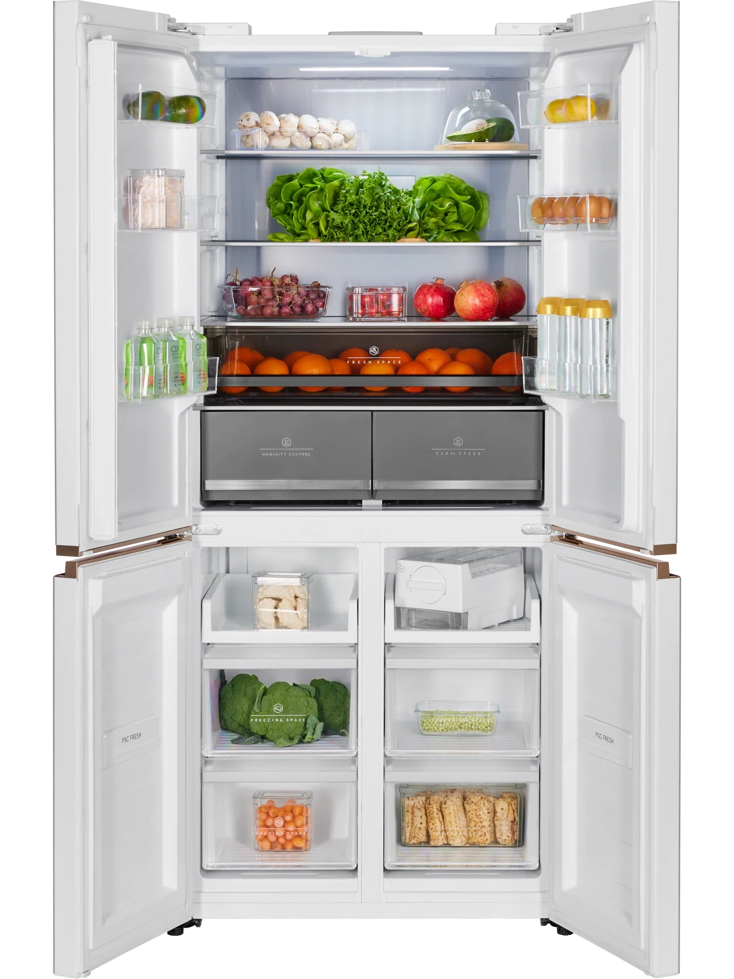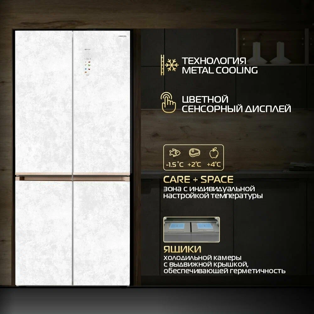 Четырехдверный инверторный холодильник HIBERG i-RFQ 630G WS – изысканный представитель бренда. Эффектный фасад из закаленного стекла белого цвета с эффектом мрамора станет украшением любого кухонного и столового интерьера. Конструкция отдельно стоящей модели и глубина 60 см позволят интегрировать холодильник в мебельный гарнитур: достаточно всего 3 мм пространства по бокам. А угол открытия двери в 90 градусов не препятствует полному выдвижению ящиков.