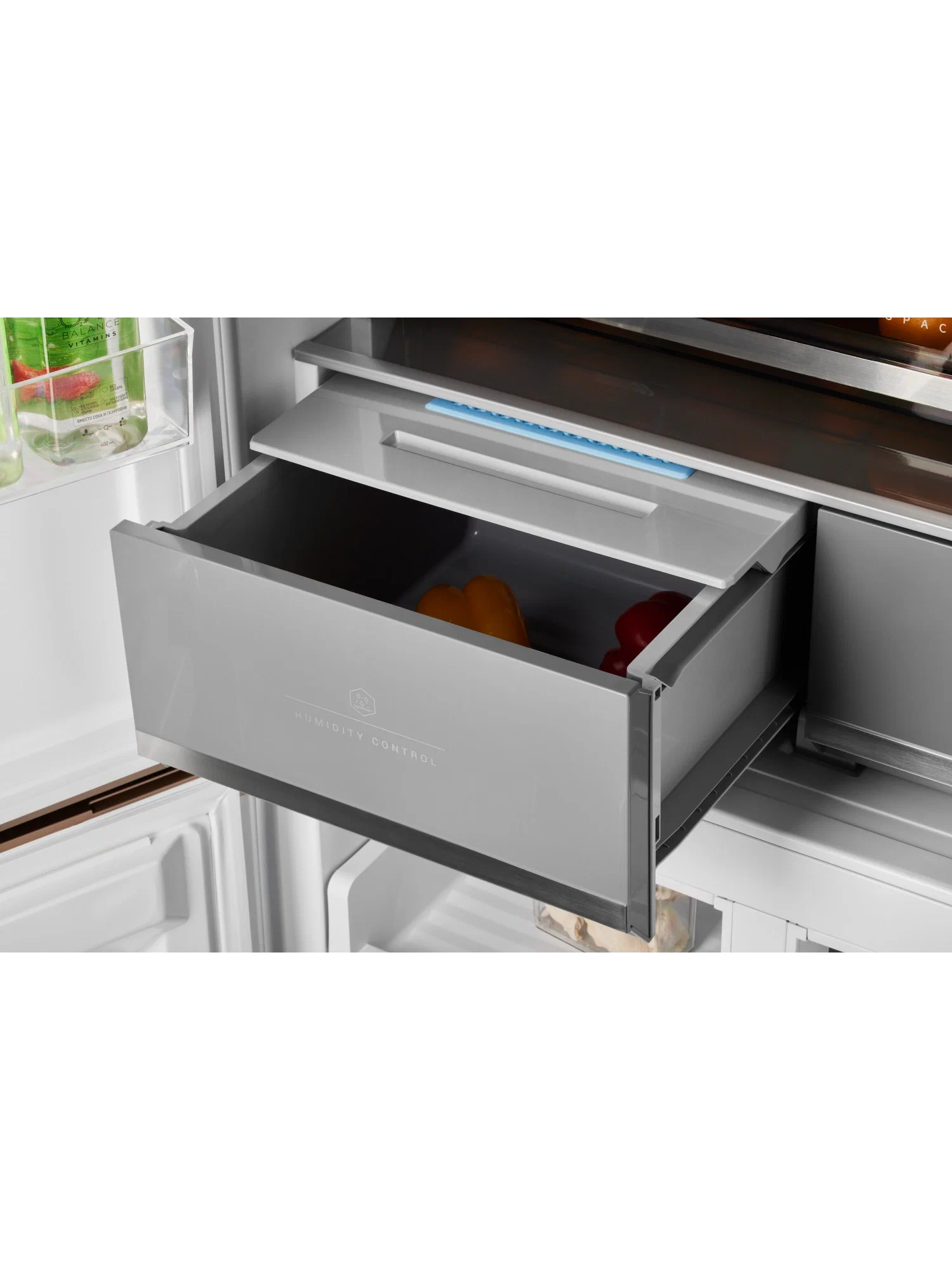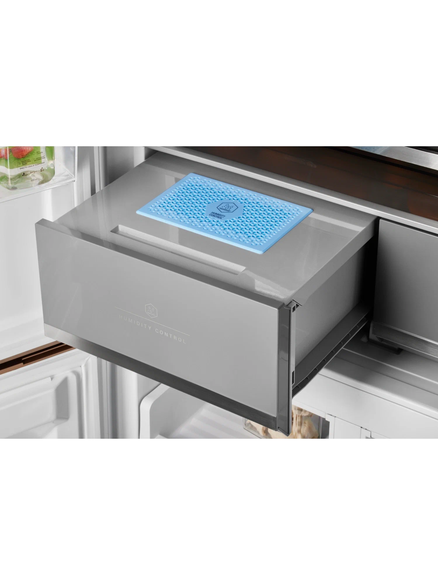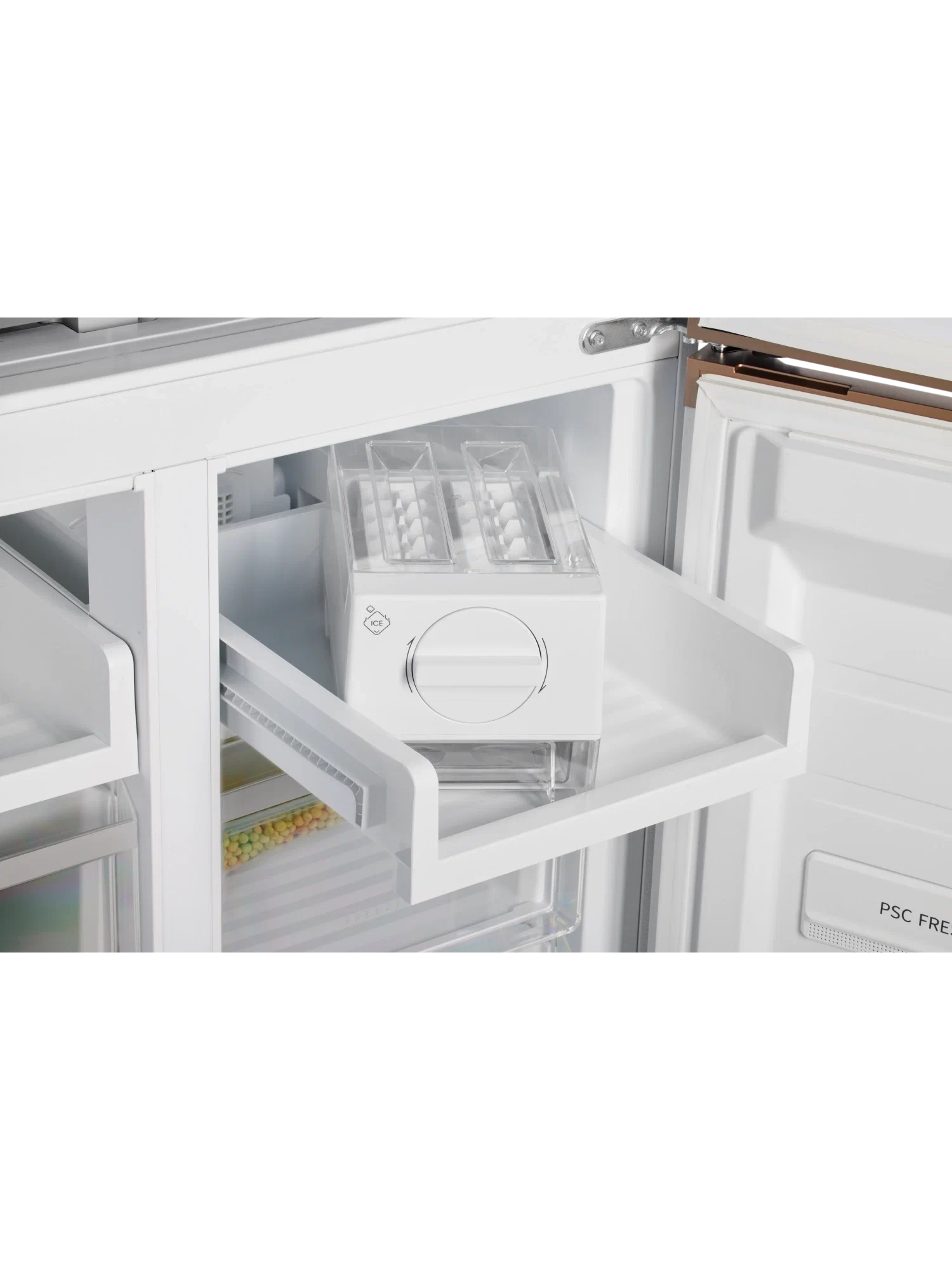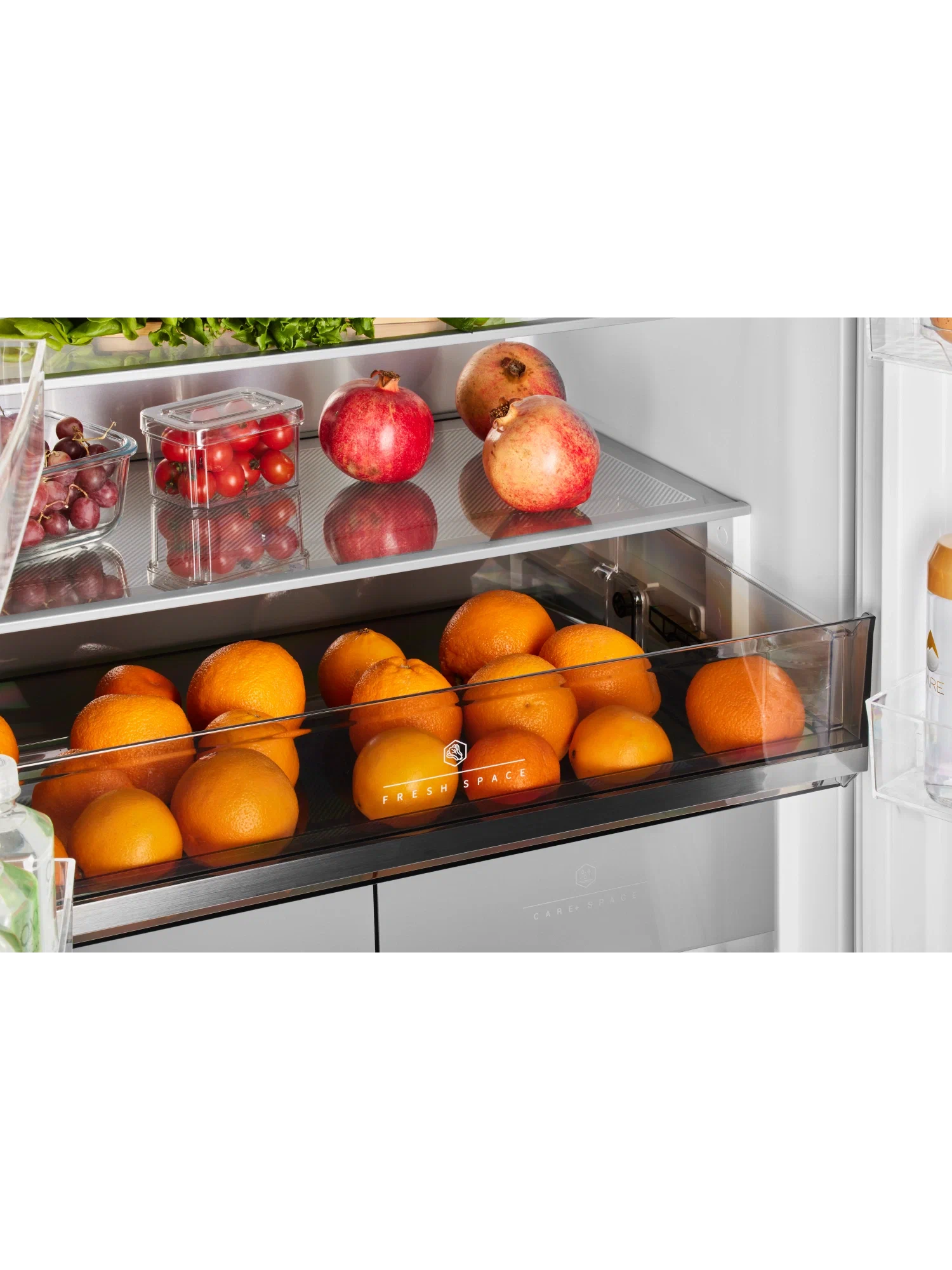 Четырехдверный инверторный холодильник HIBERG i-RFQ 630G WS – изысканный представитель бренда. Эффектный фасад из закаленного стекла белого цвета с эффектом мрамора станет украшением любого кухонного и столового интерьера. Конструкция отдельно стоящей модели и глубина 60 см позволят интегрировать холодильник в мебельный гарнитур: достаточно всего 3 мм пространства по бокам. А угол открытия двери в 90 градусов не препятствует полному выдвижению ящиков.