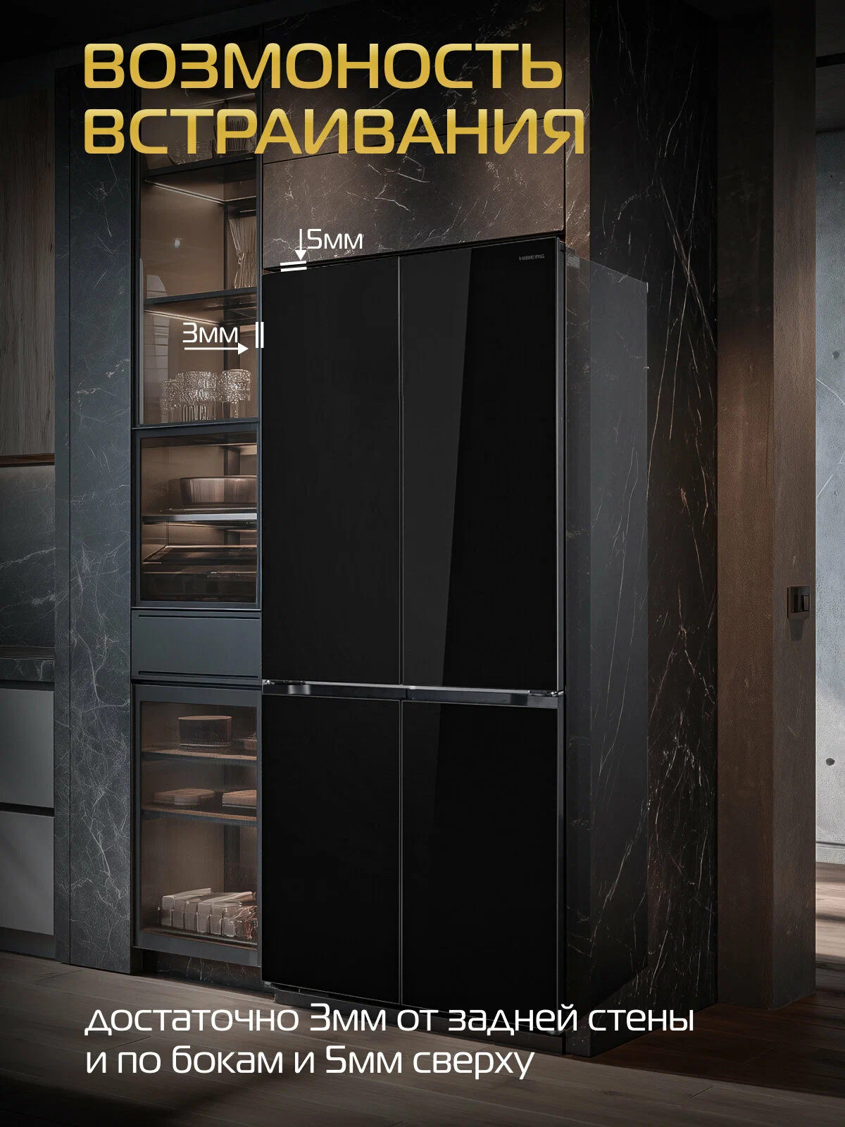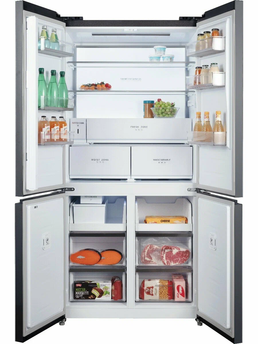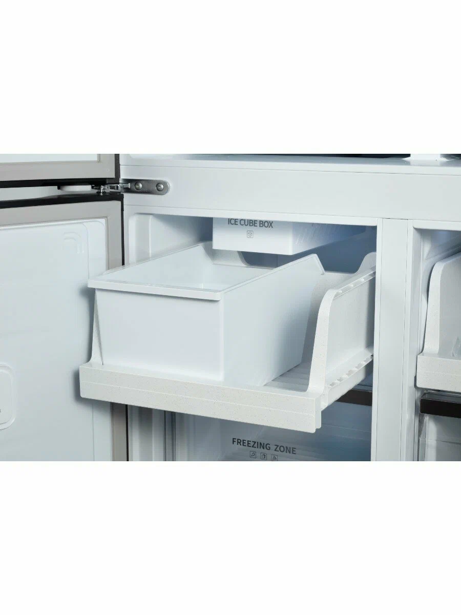 HIBERG i-RFQ 705G B — это уникальный четырехдверный холодильник с элегантным фасадом из черного мерцающего стекла, рассчитанный на тех, кто ценит высокую вместимость, современный дизайн и функциональные решения. Высота модели составляет 191 см, а глубина — всего 60 см, что делает её идеальной для встраивания в кухонный гарнитур без зазоров и потери пространства.Впечатляющий общий объем 600 литров и продуманная организация внутреннего пространства позволяют легко распределять продукты, а двери с открытием на 90° обеспечивают полный доступ даже при установке рядом с мебелью. Фантомный сенсорный дисплей, встроенный в стеклянный фасад, сохраняет минимализм внешнего вида и интуитивность управления.Интеллектуальное хранение и премиальная эргономикаВ холодильной камере расположено три вместительных выдвижных ящика на металлических направляющих. Один из них оснащён регулятором влажности и предназначен для овощей, зелени и фруктов — здесь поддерживаются оптимальные условия для сохранения свежести. Второй — это просторная мультитемпературная зона FLEX ZONE с возможностью выбора одного из трёх режимов: -4, 0 или +4 °С. Благодаря своей глубине и объему, этот ящик отлично подходит для хранения мяса, напитков или фруктов — в зависимости от потребностей.Все ящики имеют фасады из закаленного стекла, что придаёт им премиальный внешний вид и устойчивость к повреждениям. Полки выполнены из стекла, боковые карманы вместительны, а Ambient-подсветка задней стенки мягко освещает содержимое, делая использование холодильника комфортным в любое время суток.Уверенная заморозка и ледогенератор без подключения к водопроводуВ морозильной камере объёмом 197 литров находятся четыре удобных выдвижных ящика и светодиодная подсветка. Холодильник поддерживает производительность замораживания до 12 кг в сутки, а при отключении электроэнергии способен сохранять холод до 12 часов.Модель располагает автоматическим ледогенератором, который не требует подключения к водопроводу. Вода заливается вручную во встроенный резервуар объёмом 1,6 литра — и вы всегда получаете свежий лед в любое время. В морозильной камере предусмотрен контейнер для сбора льда, а в комплекте поставляется удобная лопатка.Технологии хранения и чистотыСистема Total No Frost исключает образование инея, равномерно распределяя холодный воздух по всем отделениям. Это избавляет от необходимости размораживания и способствует сохранению оптимального уровня температуры.Встроенный фильтр Pure Space эффективно устраняет запахи и очищает воздух внутри камер. Благодаря ему продукты дольше остаются свежими, не впитывают посторонние ароматы, а холодильник сохраняет чистоту и приятный микроклимат.Инверторный компрессор обеспечивает стабильную работу при низком уровне шума — всего 38 дБ, а класс энергоэффективности A+ гарантирует умеренное потребление электроэнергии (474,5 кВт/год). Управление всеми зонами осуществляется через сенсорную панель с фантомным дисплеем, на котором можно задать точные значения температуры и активировать нужные режимы: от суперзаморозки до интеллектуальной автонастройки.HIBERG i-RFQ 705G B — это холодильник нового поколения, в котором объединены максимальная вместимость, гибкие температурные зоны, встраиваемый корпус и ледогенератор без подключения к водопроводу. Это технологичное и эс