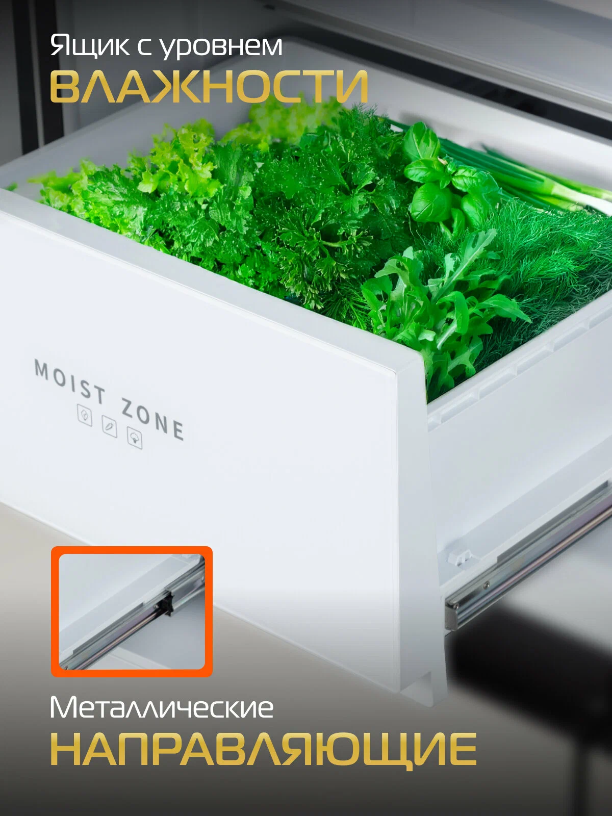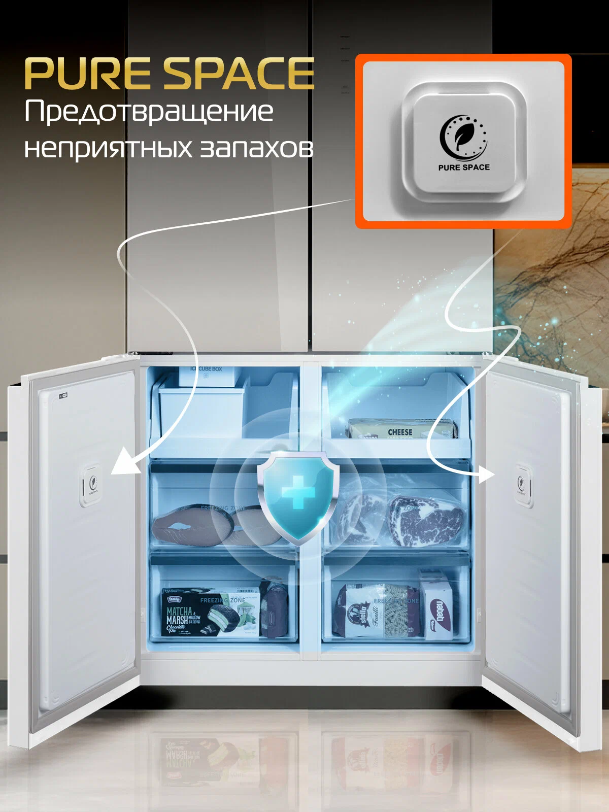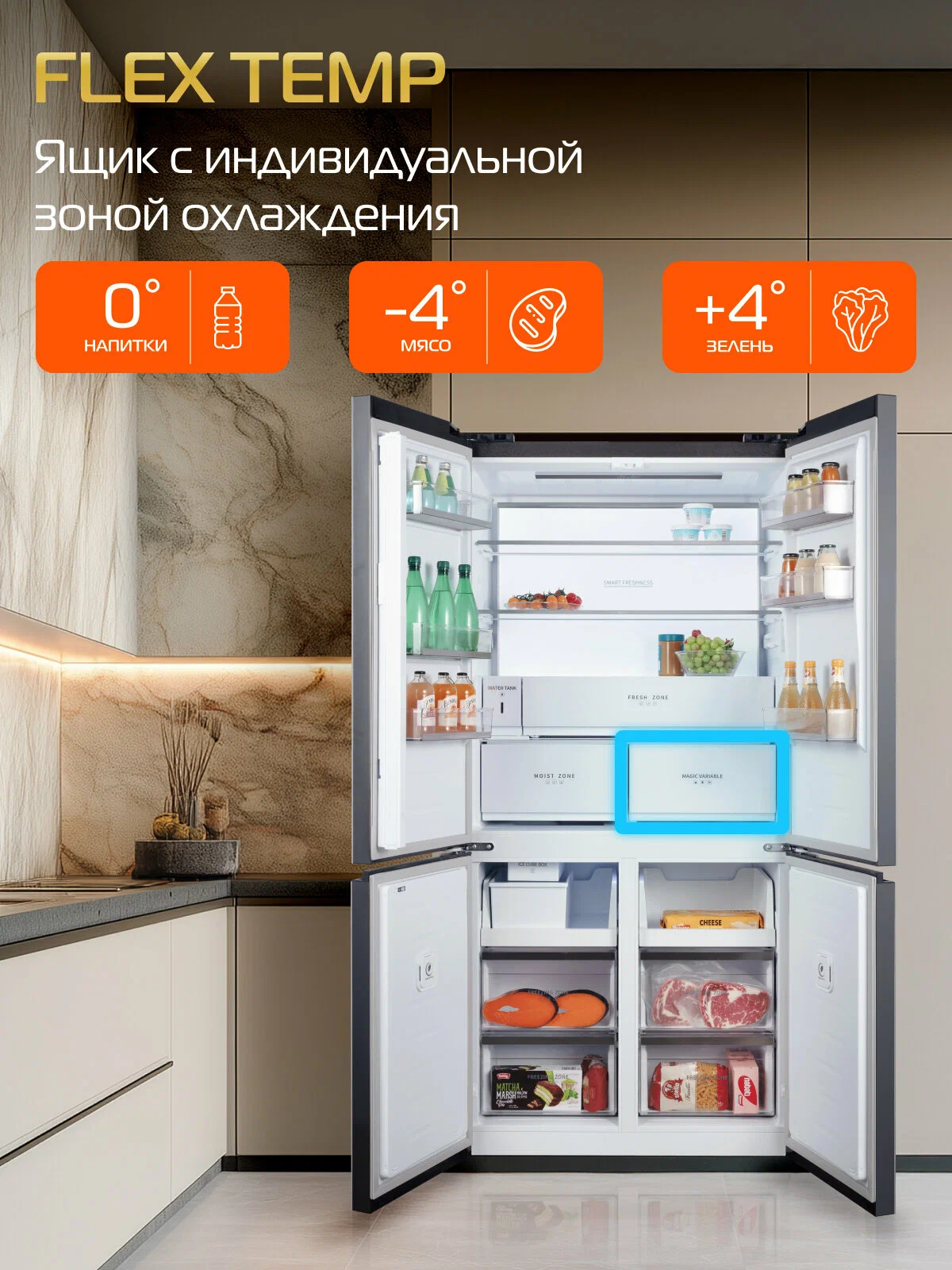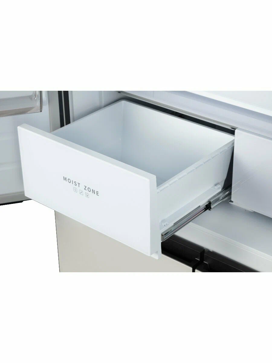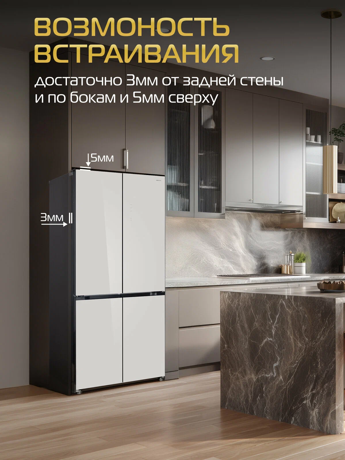 HIBERG i-RFQ 705G Y — это уникальный четырехдверный холодильник с элегантным фасадом из бежевого стекла, рассчитанный на тех, кто ценит высокую вместимость, современный дизайн и функциональные решения. Высота модели составляет 191 см, а глубина — всего 60 см, что делает её идеальной для встраивания в кухонный гарнитур без зазоров и потери пространства.Впечатляющий общий объем 600 литров и продуманная организация внутреннего пространства позволяют легко распределять продукты, а двери с открытием на 90° обеспечивают полный доступ даже при установке рядом с мебелью. Фантомный сенсорный дисплей, встроенный в стеклянный фасад, сохраняет минимализм внешнего вида и интуитивность управления.Интеллектуальное хранение и премиальная эргономикаВ холодильной камере расположено три вместительных выдвижных ящика на металлических направляющих. Один из них оснащён регулятором влажности и предназначен для овощей, зелени и фруктов — здесь поддерживаются оптимальные условия для сохранения свежести. Второй — это просторная мультитемпературная зона FLEX ZONE с возможностью выбора одного из трёх режимов: -4, 0 или +4 °С. Благодаря своей глубине и объему, этот ящик отлично подходит для хранения мяса, напитков или фруктов — в зависимости от потребностей.Все ящики имеют фасады из закаленного стекла, что придаёт им премиальный внешний вид и устойчивость к повреждениям. Полки выполнены из стекла, боковые карманы вместительны, а Ambient-подсветка задней стенки мягко освещает содержимое, делая использование холодильника комфортным в любое время суток.Уверенная заморозка и ледогенератор без подключения к водопроводуВ морозильной камере объёмом 197 литров находятся четыре удобных выдвижных ящика и светодиодная подсветка. Холодильник поддерживает производительность замораживания до 12 кг в сутки, а при отключении электроэнергии способен сохранять холод до 12 часов.Модель располагает автоматическим ледогенератором, который не требует подключения к водопроводу. Вода заливается вручную во встроенный резервуар объёмом 1,6 литра — и вы всегда получаете свежий лед в любое время. В морозильной камере предусмотрен контейнер для сбора льда, а в комплекте поставляется удобная лопатка.Технологии хранения и чистотыСистема Total No Frost исключает образование инея, равномерно распределяя холодный воздух по всем отделениям. Это избавляет от необходимости размораживания и способствует сохранению оптимального уровня температуры.Встроенный фильтр Pure Space эффективно устраняет запахи и очищает воздух внутри камер. Благодаря ему продукты дольше остаются свежими, не впитывают посторонние ароматы, а холодильник сохраняет чистоту и приятный микроклимат.Инверторный компрессор обеспечивает стабильную работу при низком уровне шума — всего 38 дБ, а класс энергоэффективности A+ гарантирует умеренное потребление электроэнергии (474,5 кВт/год). Управление всеми зонами осуществляется через сенсорную панель с фантомным дисплеем, на котором можно задать точные значения температуры и активировать нужные режимы: от суперзаморозки до интеллектуальной автонастройки.HIBERG i-RFQ 705G Y — это холодильник нового поколения, в котором объединены максимальная вместимость, гибкие температурные зоны, встраиваемый корпус и ледогенератор без подключения к водопроводу. Это технологичное и эстетичное р
