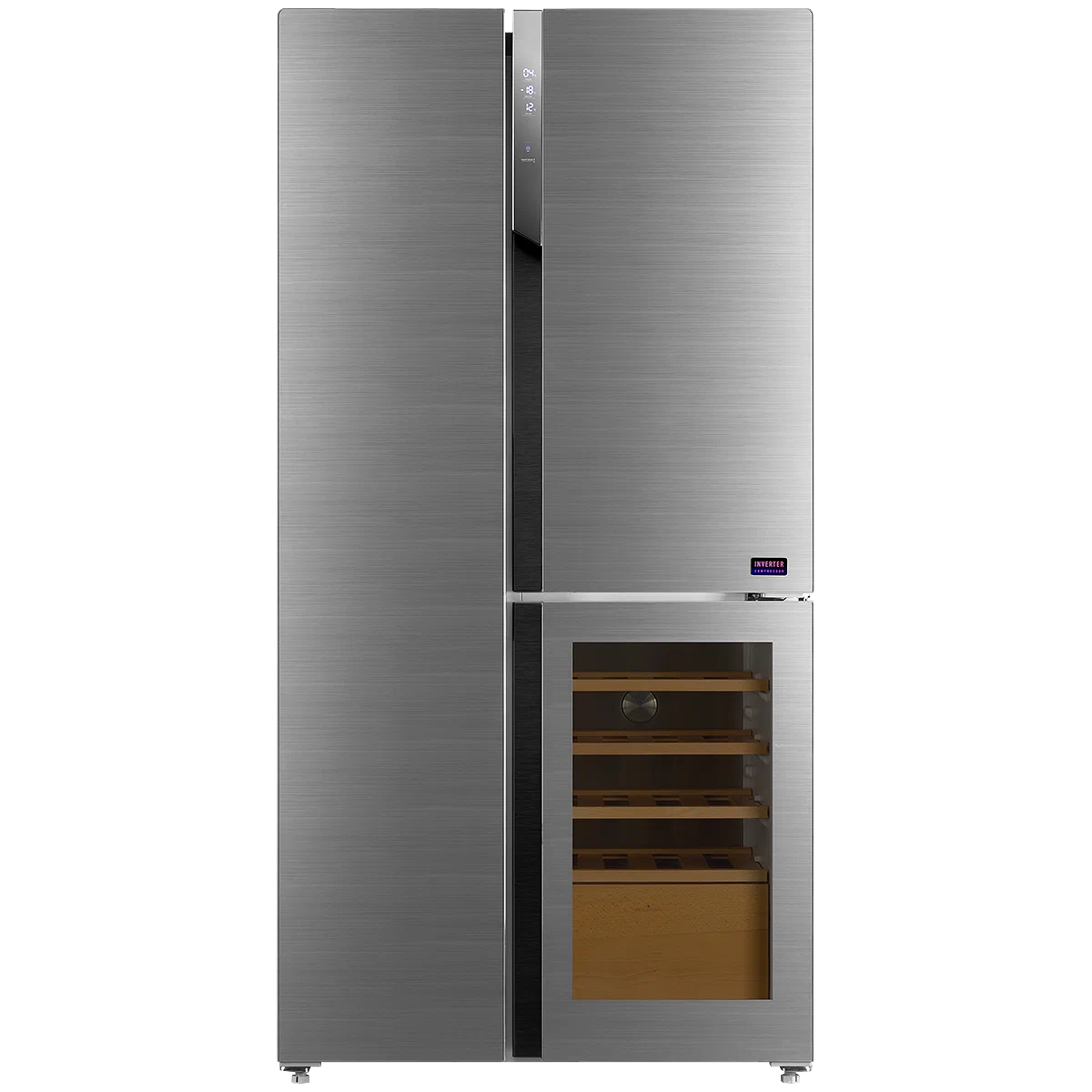 Холодильник Side-by-side с винным шкафом RFWI 1890 SIG - это элегантный и многофункциональный холодильник с вместительностью 535 литров. Он оборудован инверторным компрессором для более эффективной работы и имеет систему No Frost для предотвращения образования инея. Управление осуществляется сенсорным электронным панелью с LED-дисплеем.Холодильное отделение включает в себя 3 стеклянные полки, 2 регулируемые по высоте, а также 3 навесные дверные полки и отсек для овощей. Есть также специальная полка для яиц. Морозильное отделение оснащено 2 выдвижными ящиками, 5 полками для заморозки, и есть возможность производства льда и использования ледогенератора.Этот холодильник имеет класс энергопотребления A+ и стильный дизайн с матовой стеклянной панелью и цветом "Темный графит". Он также обладает функцией "Супер охлаждение" и "Супер заморозка" для быстрого охлаждения или заморозки продуктов. С уровнем шума в 42 дБ он подходит для размещения в различных помещениях.