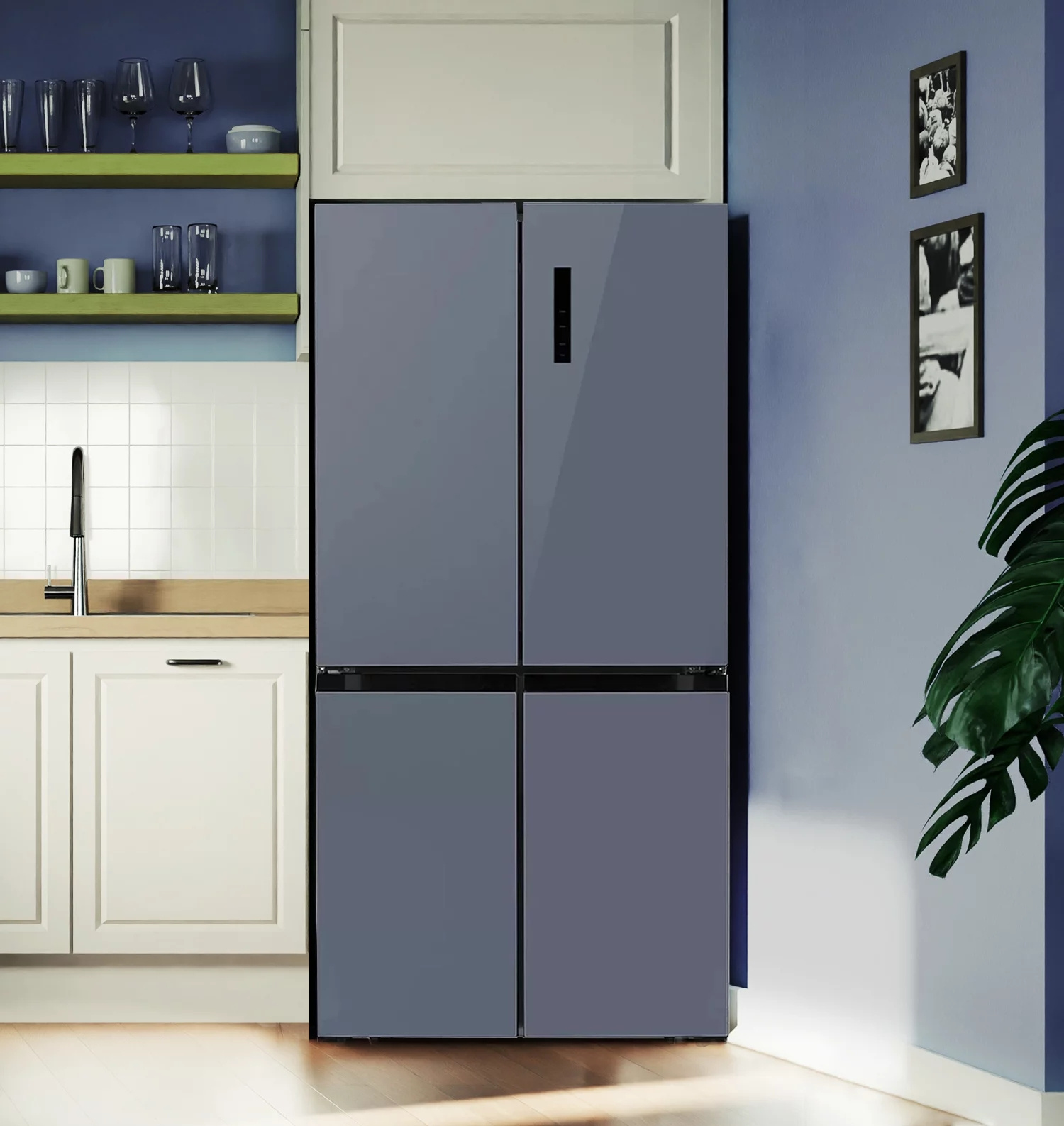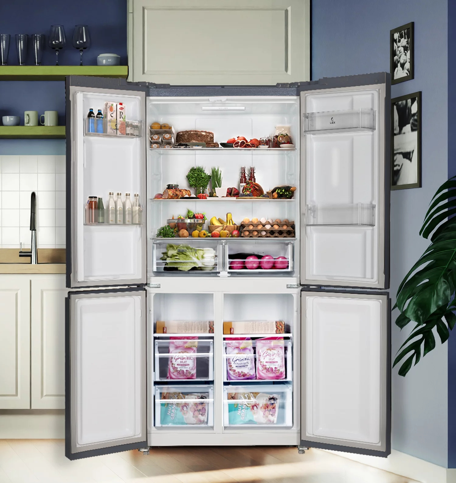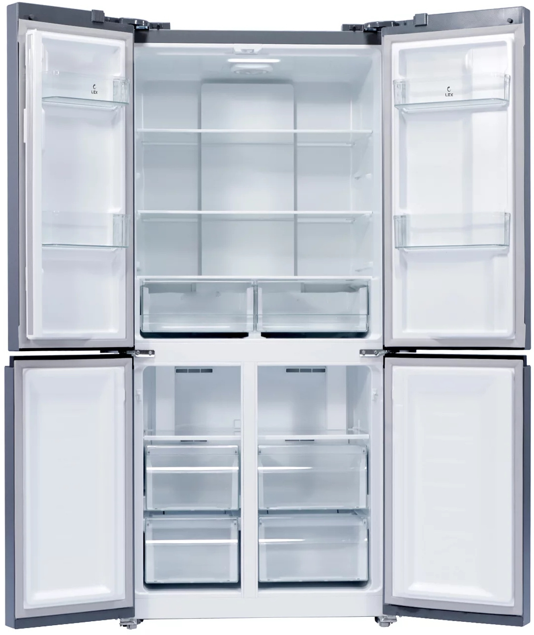 Модель LEX LCD 450 — передовые технологии и множество вариантов дизайна. Удобная панель управления и расположение дверей по типу CROSS DOOR помогут поддерживать нужные параметры хранения для каждого отделения. Холодильник с мощным, экономичным и тихим инверторным компрессором работает по технологии Total No Frost, которая не дает инею скапливаться внутри рабочих камер, значительно упрощая уход за устройством. Запатентованная многопоточная система охлаждения быстро и равномерно распределяет холодный воздух по всем зонам хранения. Модель позволяет хранить продукты при температуре от +8 °С в холодильном отделении до –23 °С в морозильном. А в режиме суперзаморозки можно установить еще более низкое значение: –28 °С. Суперрежимы позволяют максимально охладить содержимое во всех отделениях за короткое время. Это удобно, если вы загружаете сразу много продуктов, например, после похода в супермаркет или отключения электричества. В последнем случае также может пригодиться режим поддержания температуры, который будет работать 10 часов. Еще одна полезная функция — «Отпуск»: когда она активна, в каждой камере устанавливается температура, оптимальная одновременно и для сохранения свежести продуктов, и для уменьшения расхода электричества. Для этого холодильника можно выбрать один из шести стилей матового или глянцевого, стеклянного или металлического корпуса в разных цветах.Длина провода с евровилкой 2,4 мХолодильник Cross Door имеет большую холодильную камеру сверху и два морозильных отсека по три ящика снизу. С помощью удобной организации пространства вы сможете хранить больше продуктов.