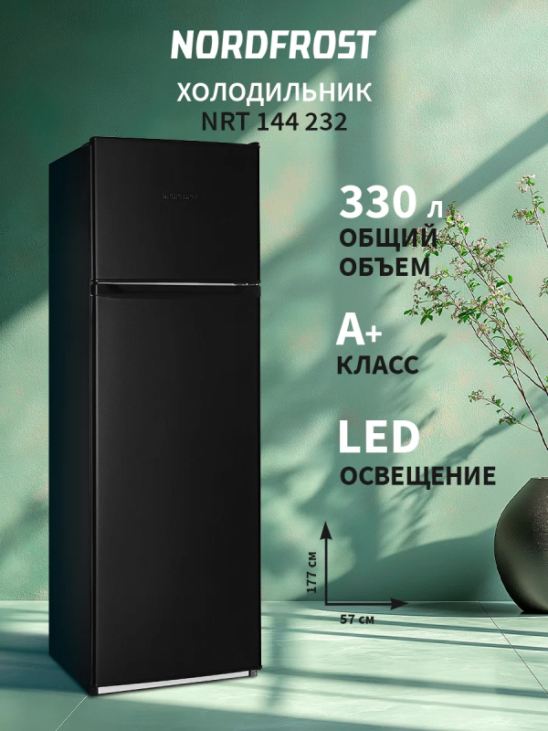 Двухкамерный отдельностоящий холодильник NORDFROST NRT 144 32 с верхним расположением морозильной камеры имеет общий объем 330 литров и высоту 177 см. Устройство с системой охлаждения DeFrost в холодильном отделении и ручным размораживанием в морозильной камере характеризуется высоким классом энергоэффективности А+ и низким уровнем шума. Морозильник с полезным объемом 68 литров расположен в верхней части холодильника и имеет мощность заморозки до 3 кг в сутки. В случае отключения электричества предусмотрено автономное сохранение холода до 16 часов. Управлять температурным режимом холодильника можно с помощью встроенного внутри камеры датчика-реле температуры. В холодильном отделении устанавливается температура от 0°С до +8°С, а в морозильном не выше -18°С. Внутреннее пространство холодильника: - LED-освещение в холодильной камере включается автоматически при открывании двери; - ламинированная внутренняя поверхность холодильника имеет антибактериальное покрытие; - 4 полки из закаленного стекла в холодильном отделении; - выдвижной ящик для овощей и фруктов; - 4 полки на двери; - 1 полка в морозильном отделении для длительного хранения мяса, курицы, полуфабрикатов и других замороженных продуктов. Дверь с интегрированной горизонтальной ручкой имеет возможность перенавешивания на другую сторону для комфортного открывания и установки холодильника в удобном месте. Гарантия на холодильник NORDFROST – 2 года.